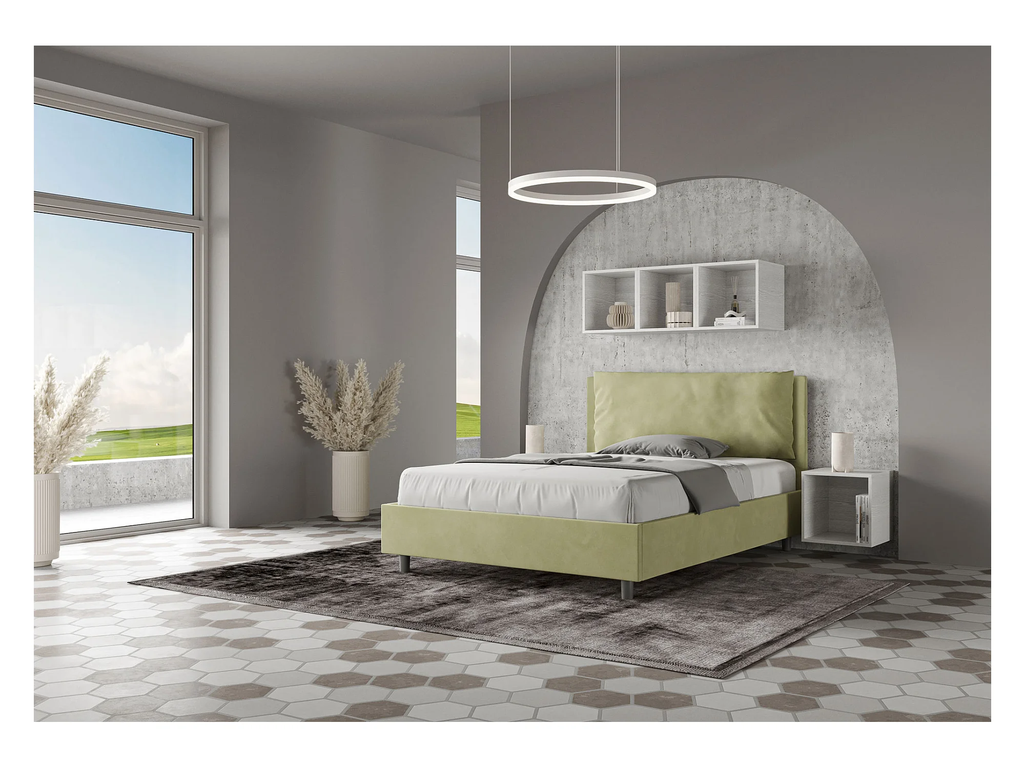 Lit double avec sommier rembourré 140x210 microfibre vert Antea Large