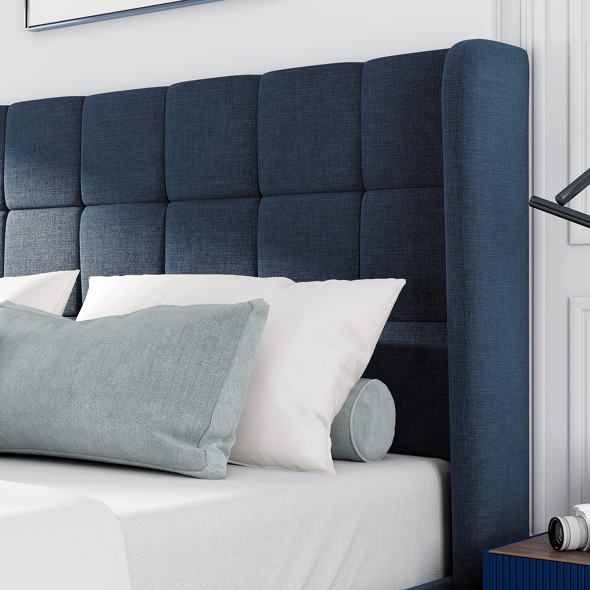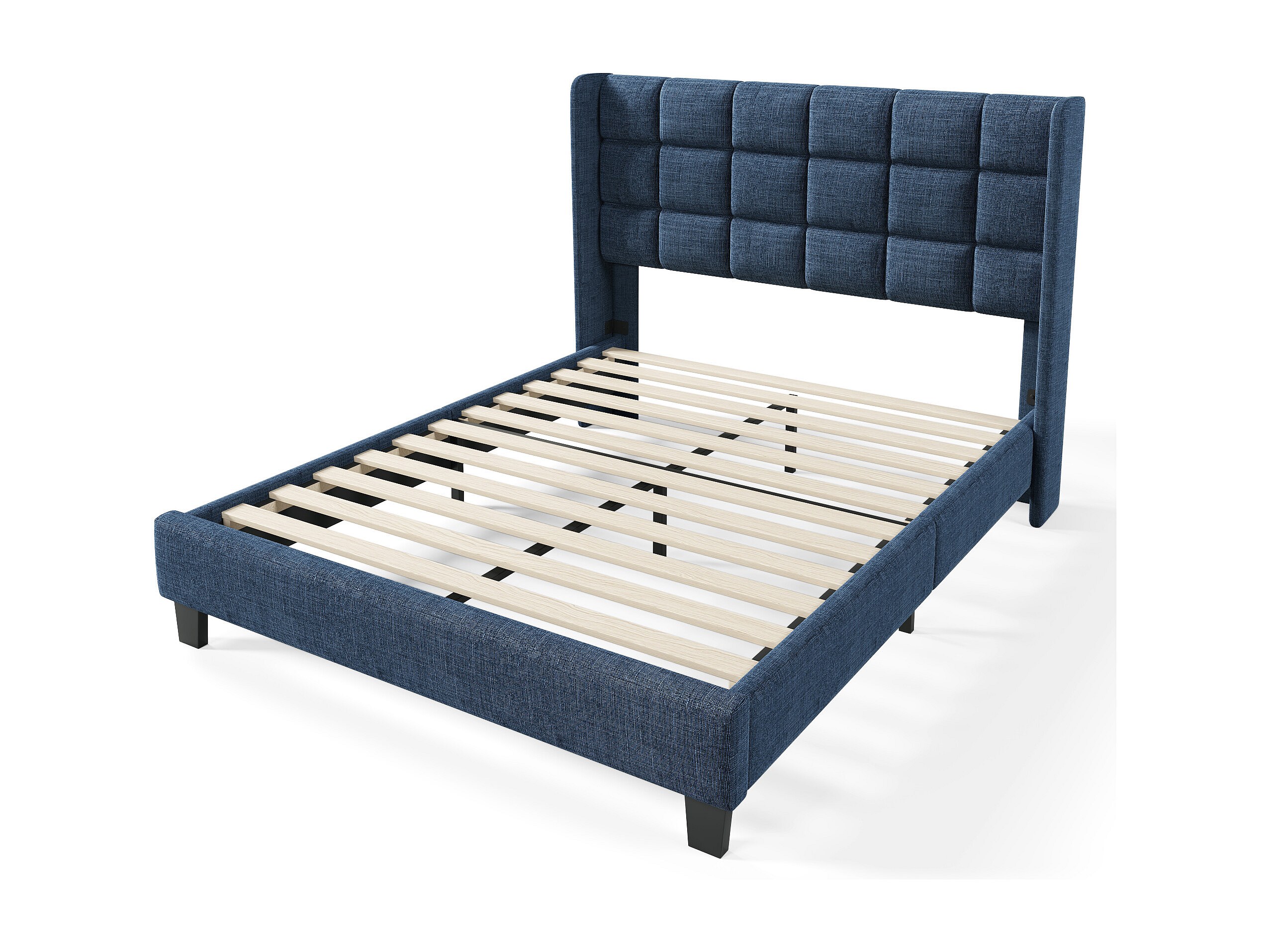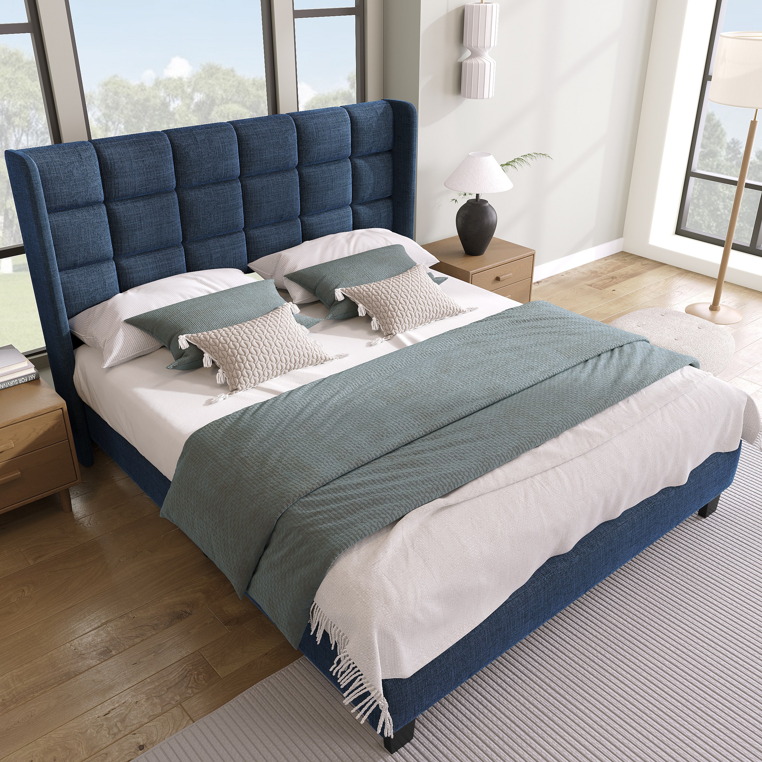 Lit double avec tête de lit rembourrée 140x200 cm en lin bleu, avec sommier à lattes et pieds noirs