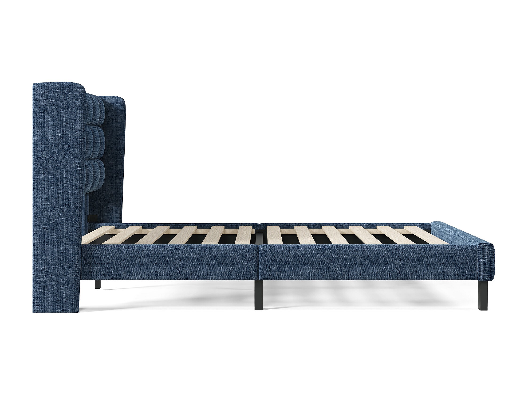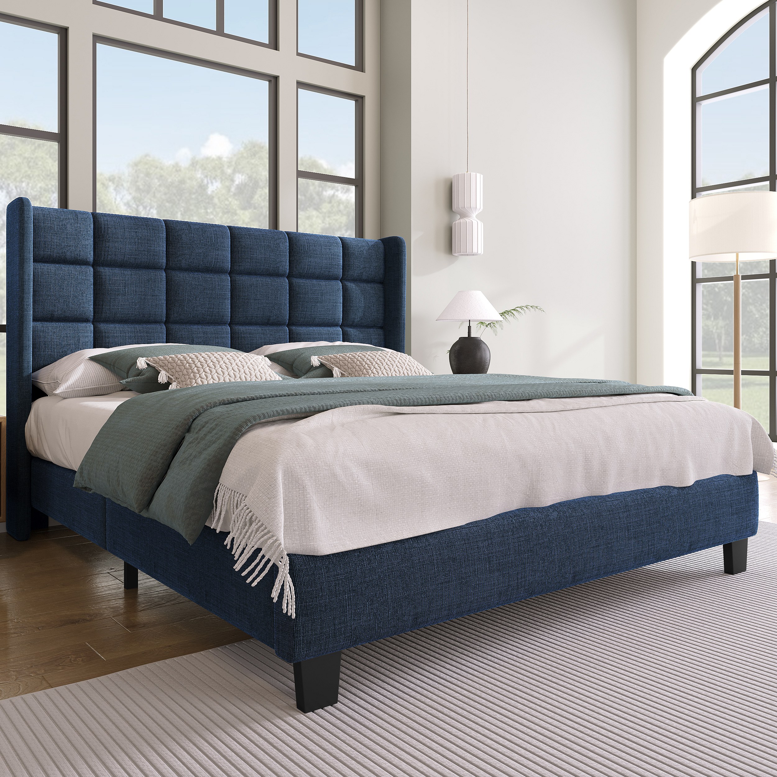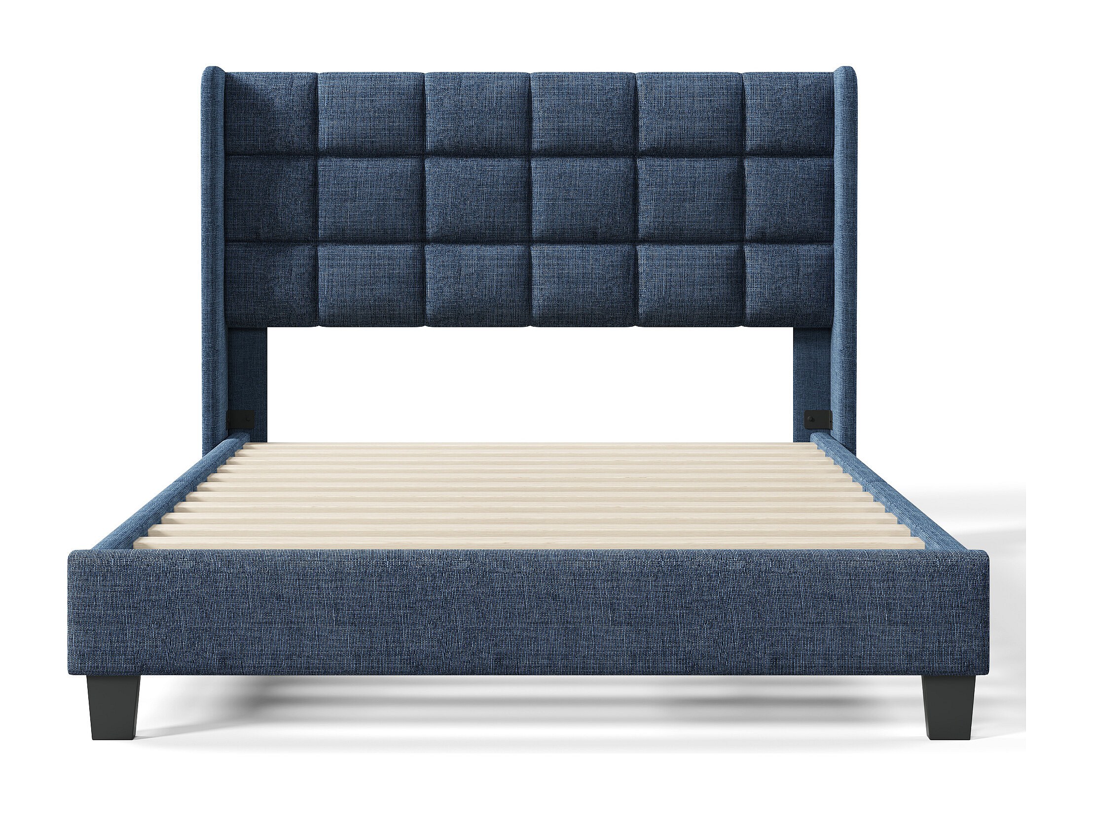 Lit double avec tête de lit rembourrée 140x200 cm en lin bleu, avec sommier à lattes et pieds noirs