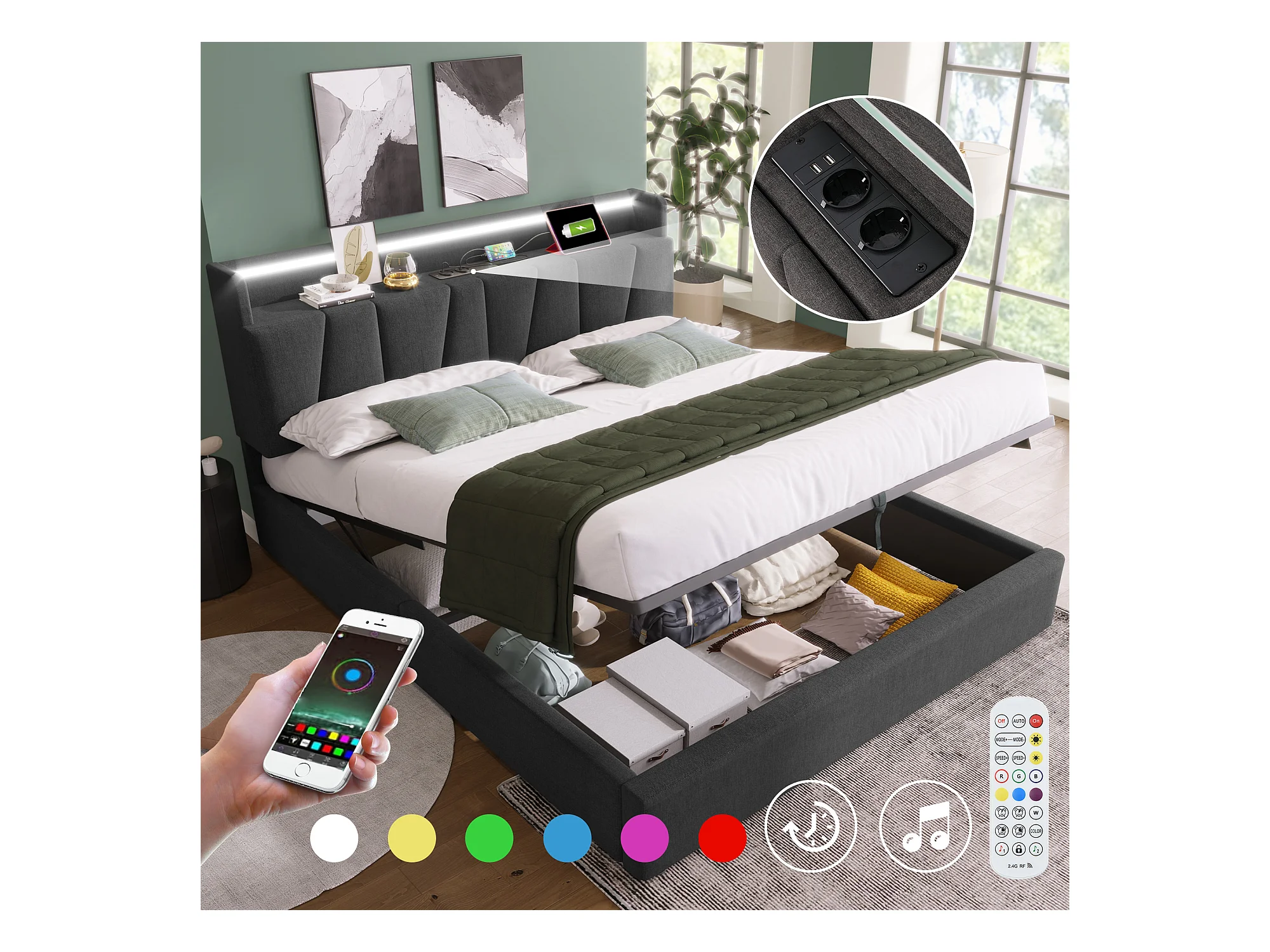 Lit double avec tête de rangement et éclairage LED, prise USB intégrée, lin gris (177.5x215x100 cm)