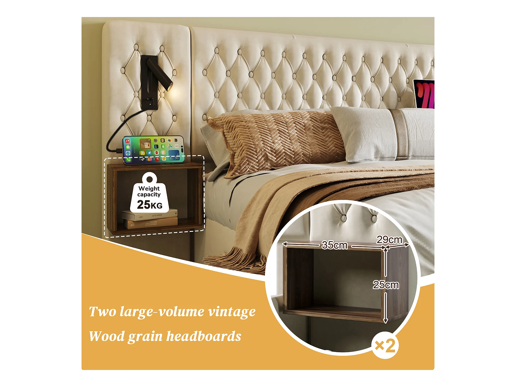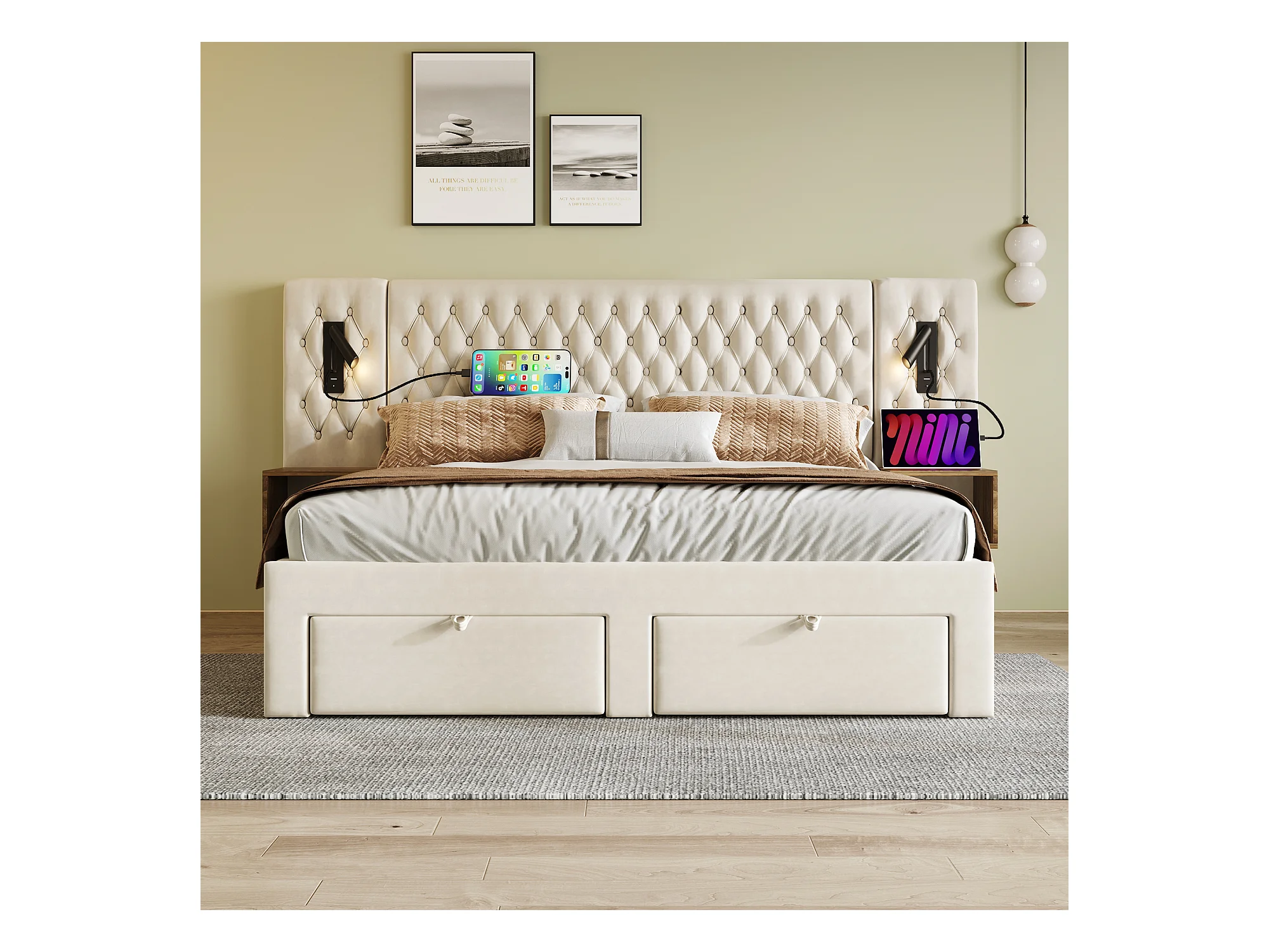 Lit double capitonné 160 x 200 cm, avec tables de chevet et tiroirs, liseuse, beige