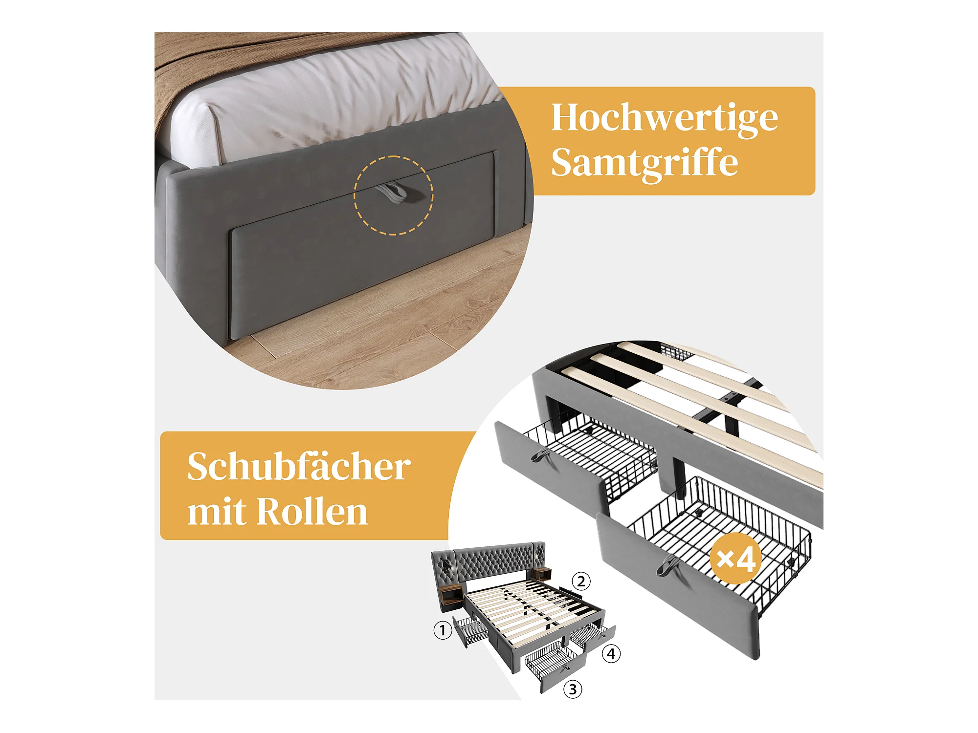 Lit double capitonné 160 x 200 cm, avec tables de chevet et tiroirs, liseuse, gris