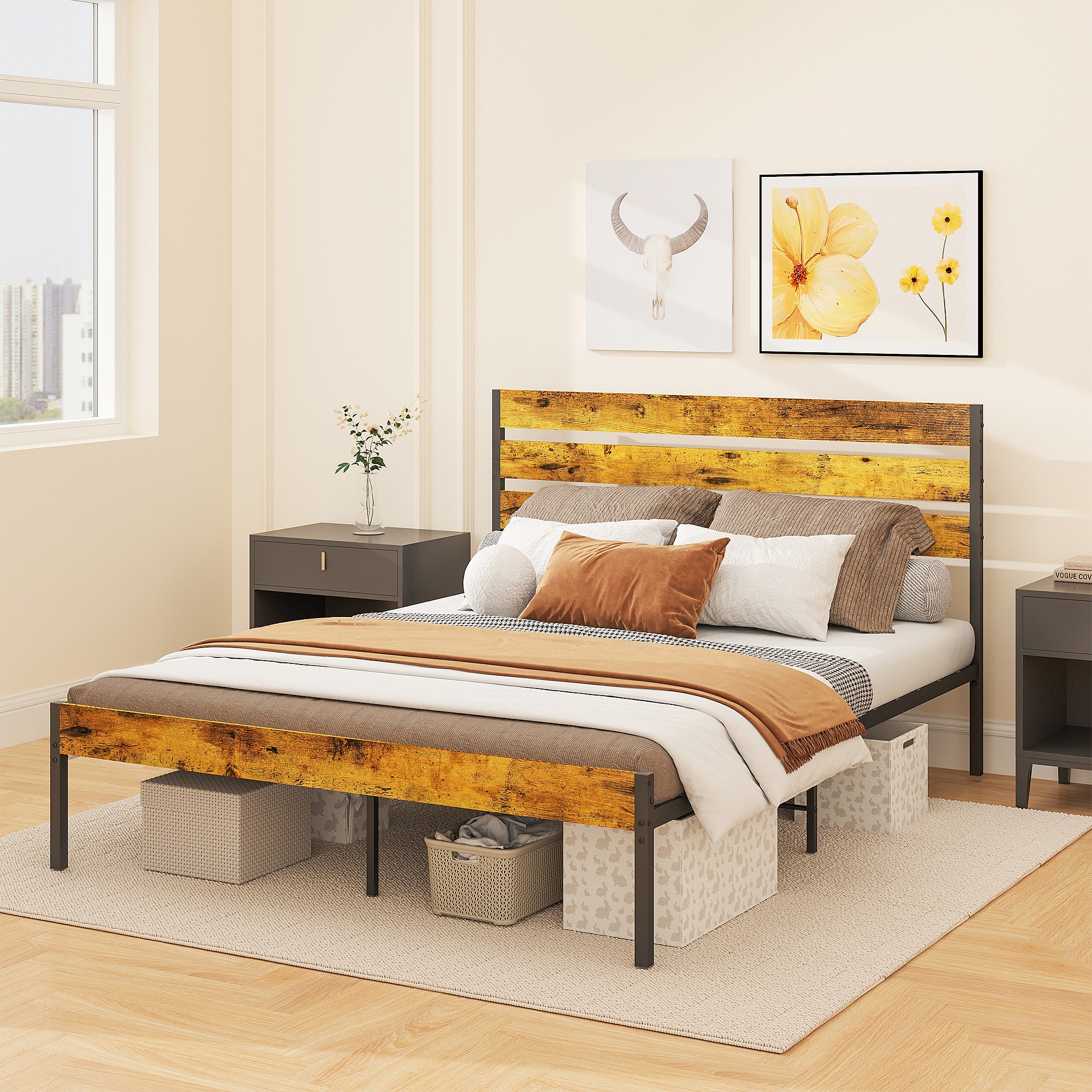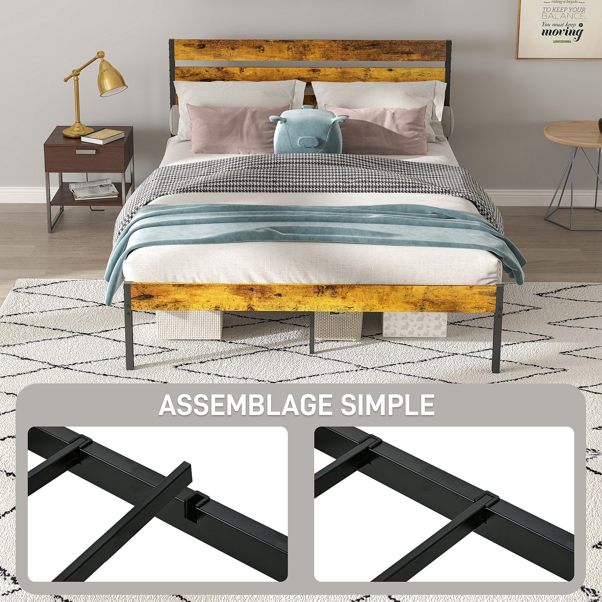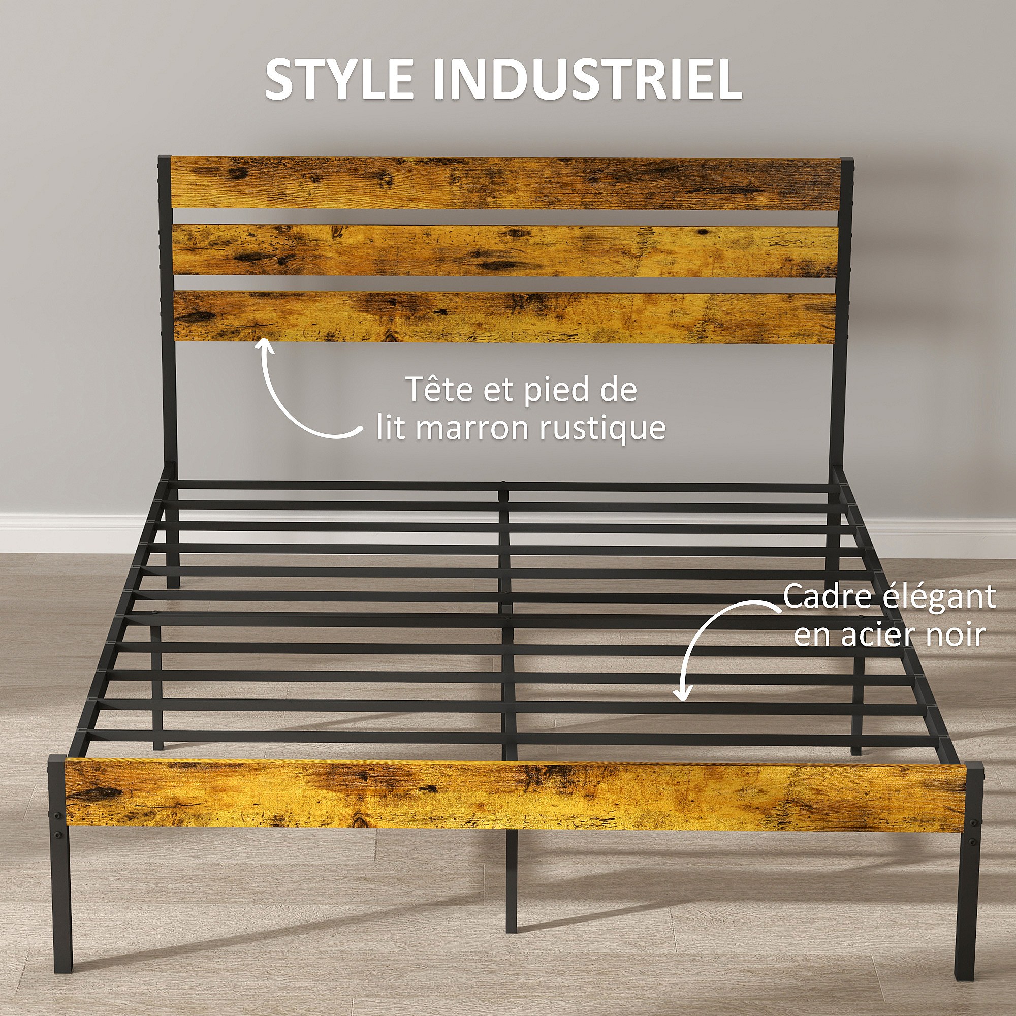 Lit double design industriel - tête de lit, pied de lit, sommier - compatible matelas 200L x 160l cm - acier noir aspect bois vieilli