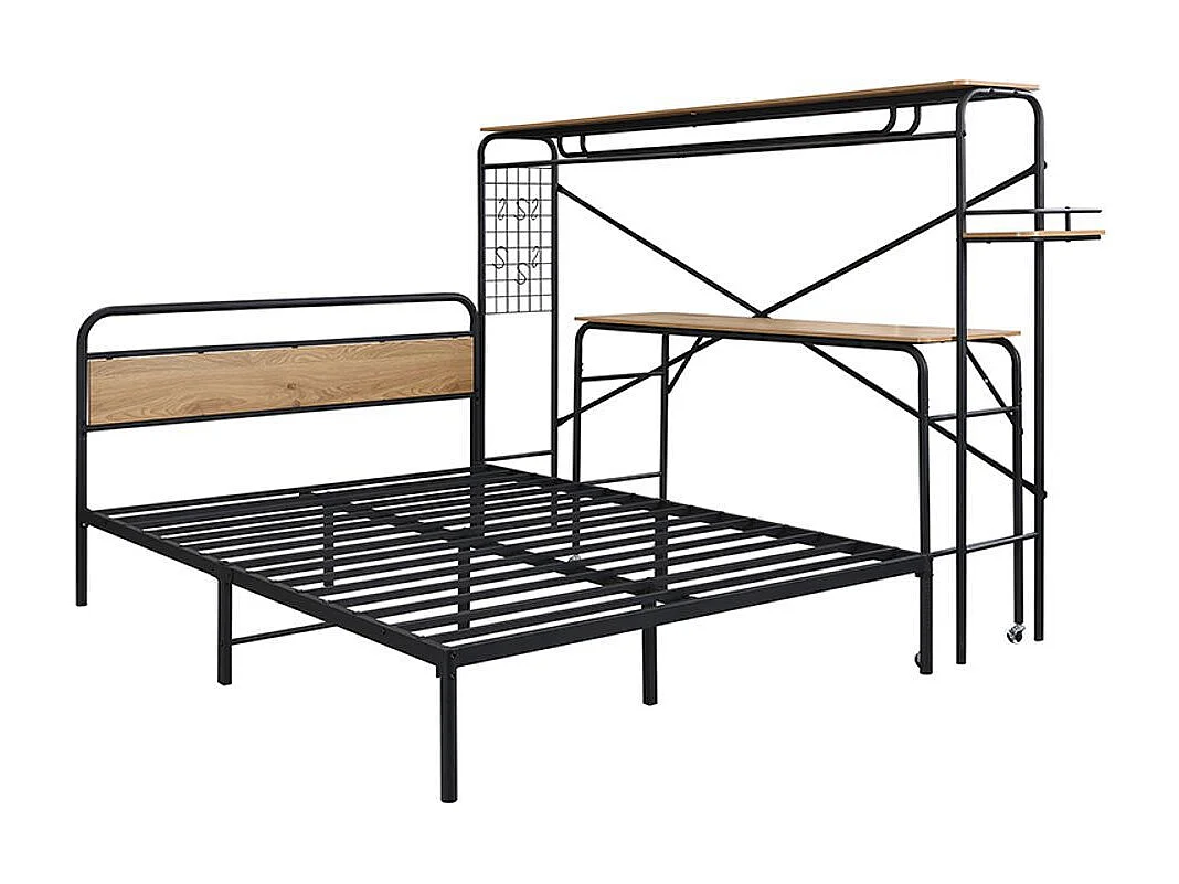 Lit double en métal 140x200 cm lits plats table portemanteau vertical table à roulettes meuble chambre adolescents adultes structure métal MDF noir naturel