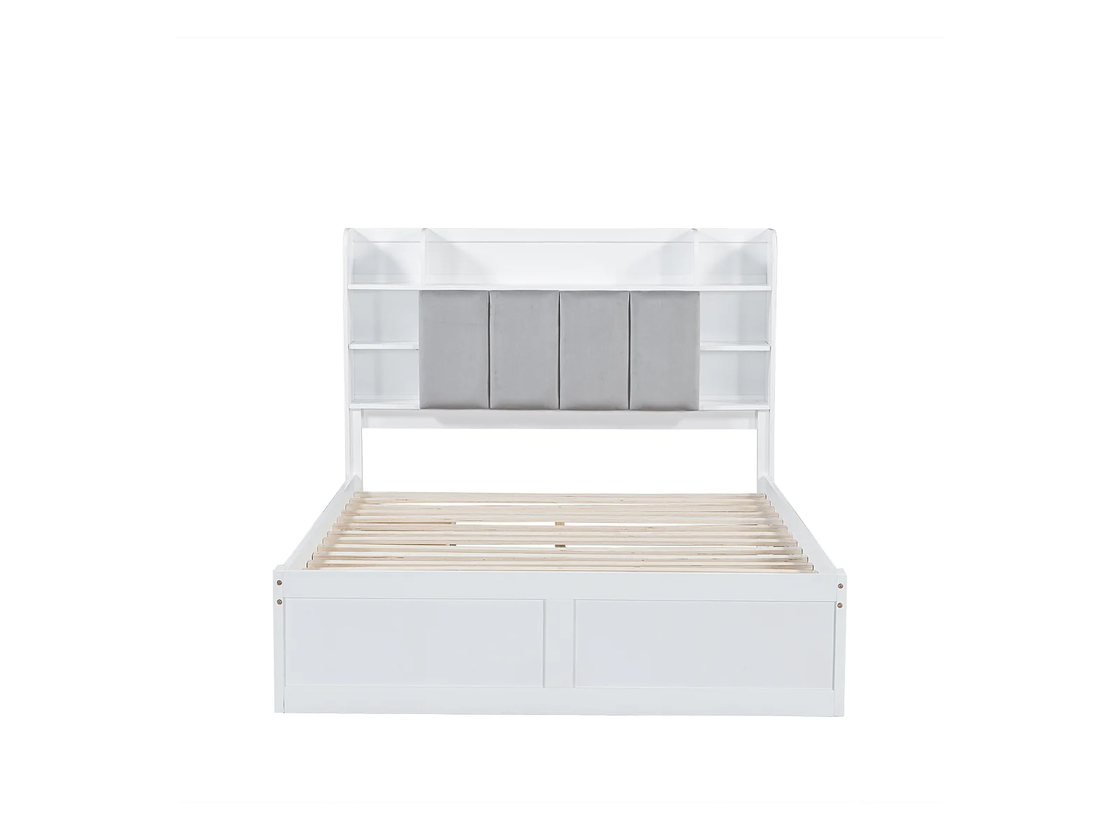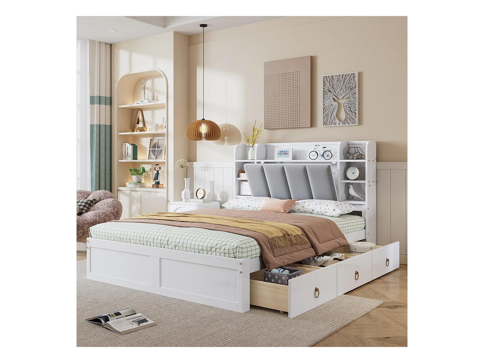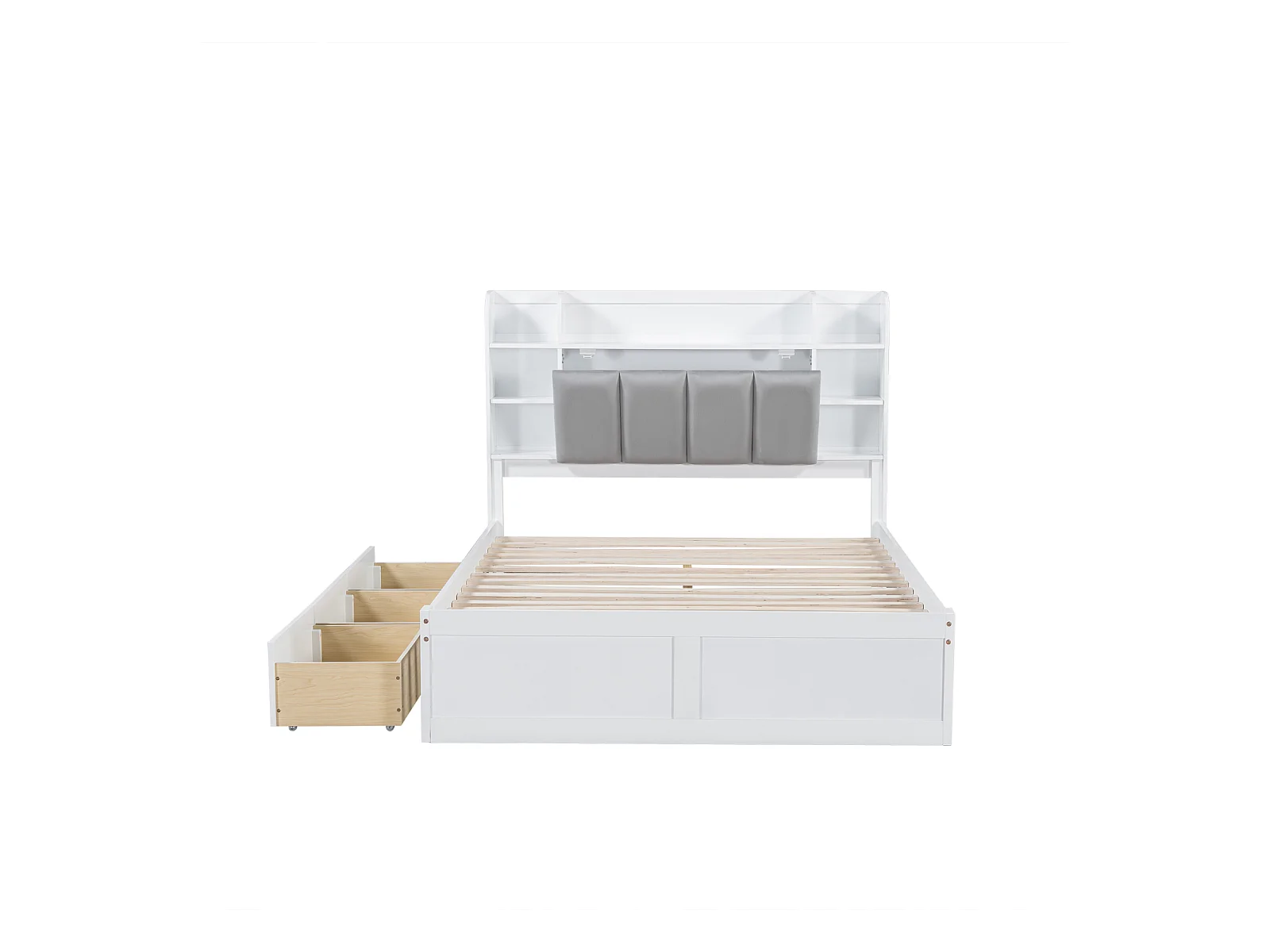 Lit double, étagère, 3 tiroirs, roulettes, poignées métal, rangement porte pliante, pin + MDF, blanc + gris, 140x200cm
