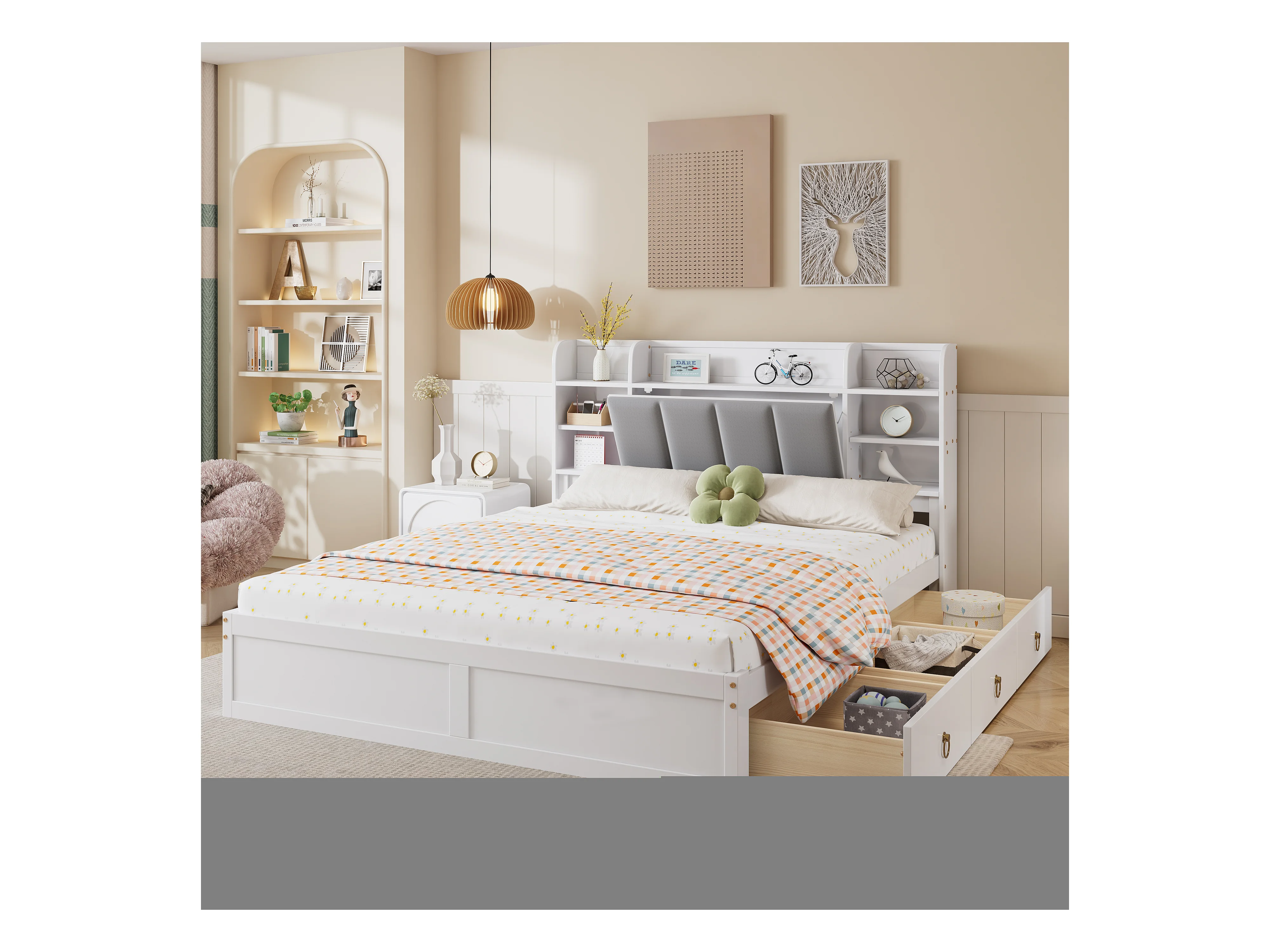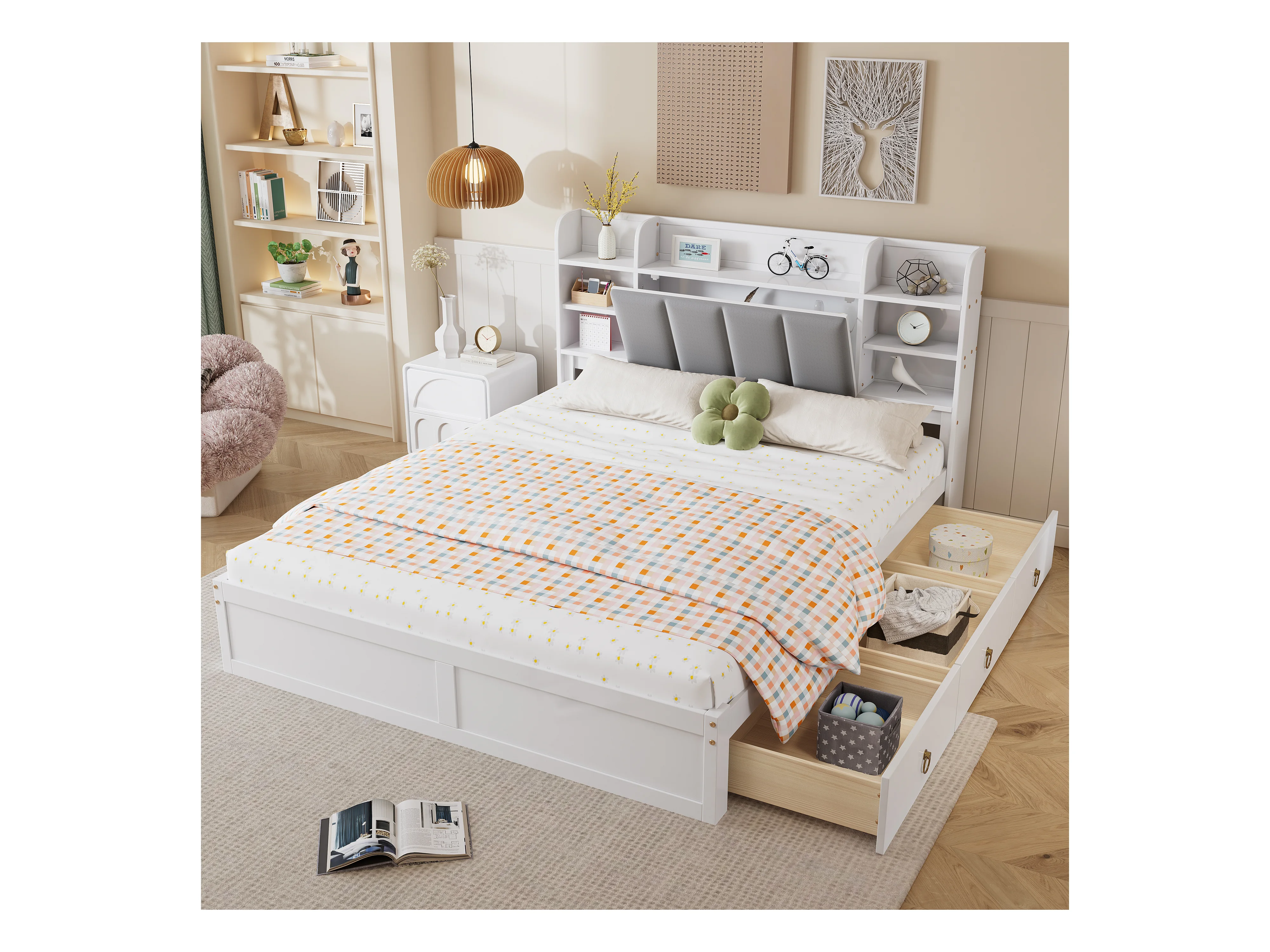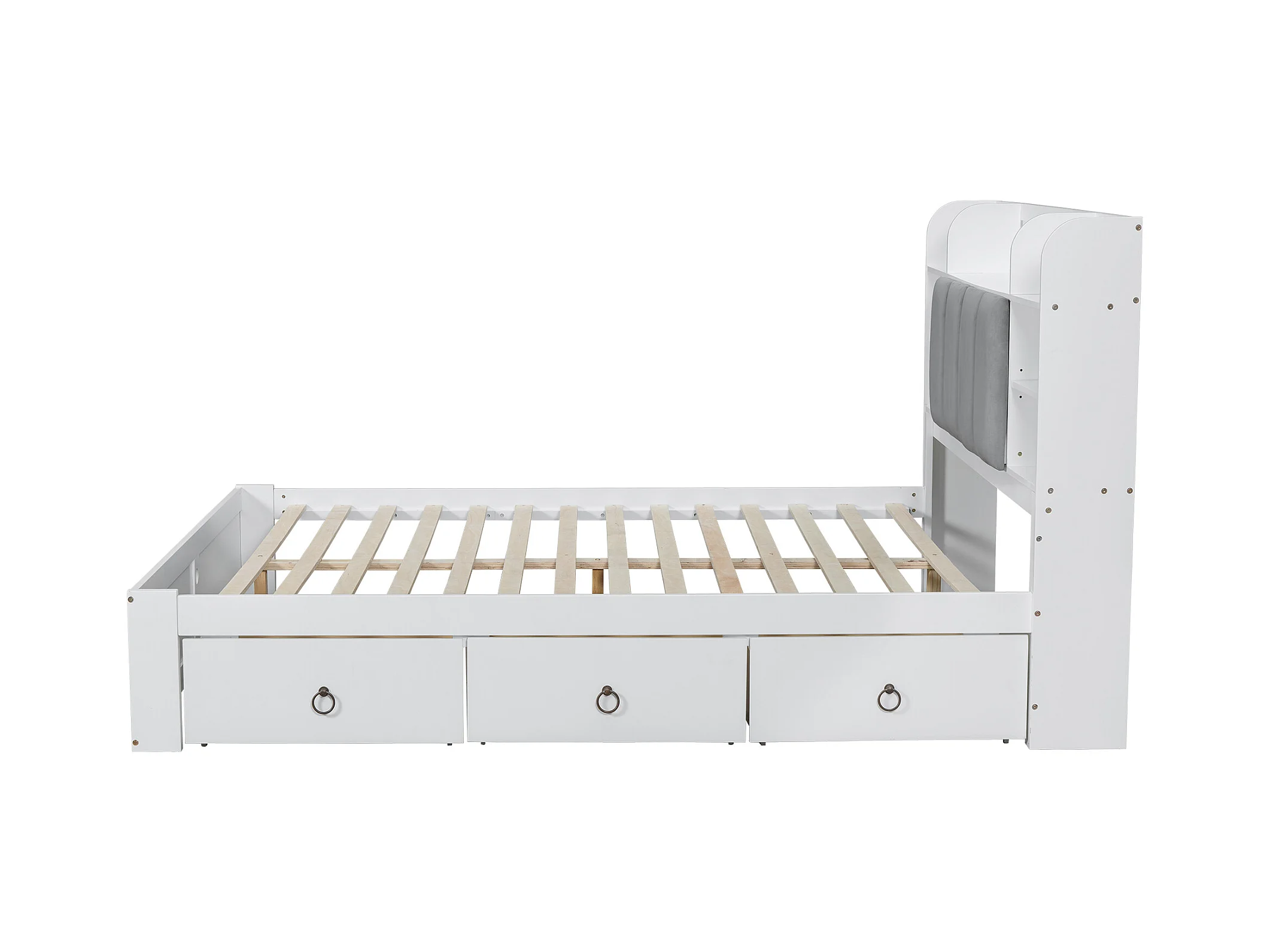 Lit double, étagère, 3 tiroirs, roulettes, poignées métal, rangement porte pliante, pin+MDF+velours, blanc+gris, 160x200cm