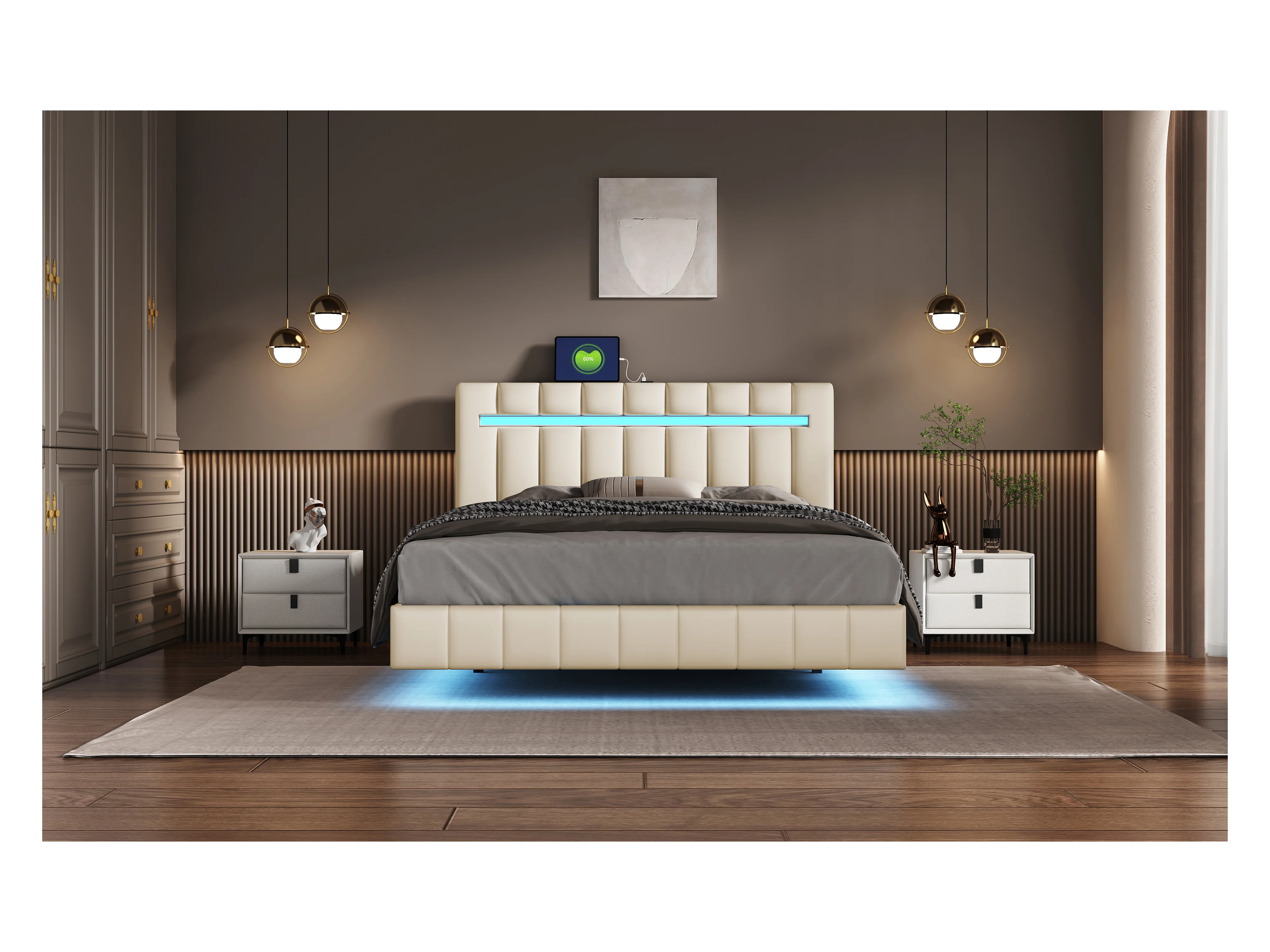 Lit double flottant avec LED, lin, beige (210x151x100cm)
