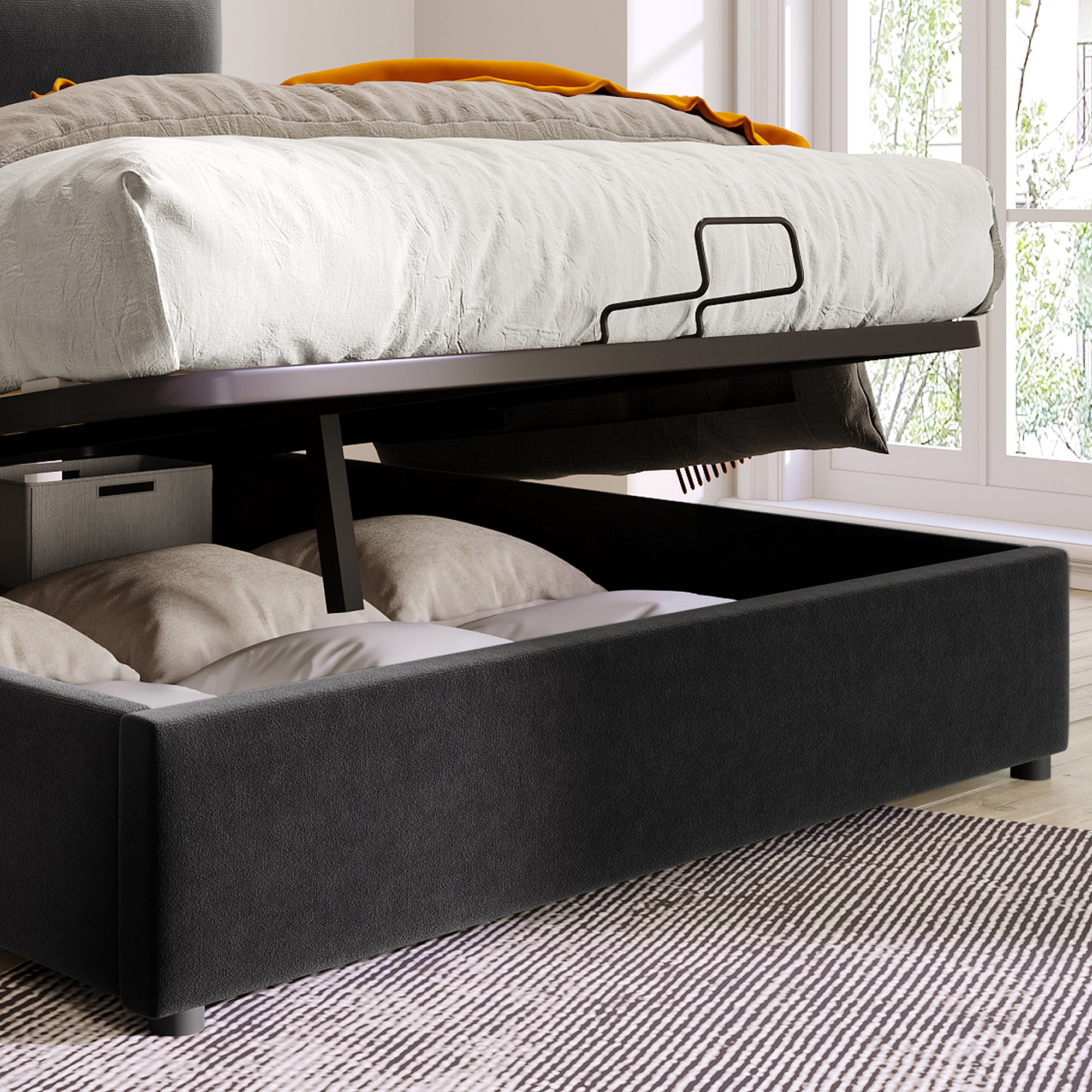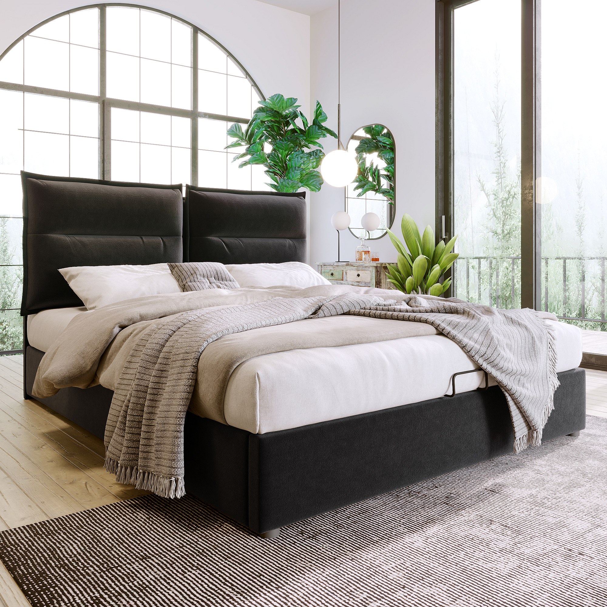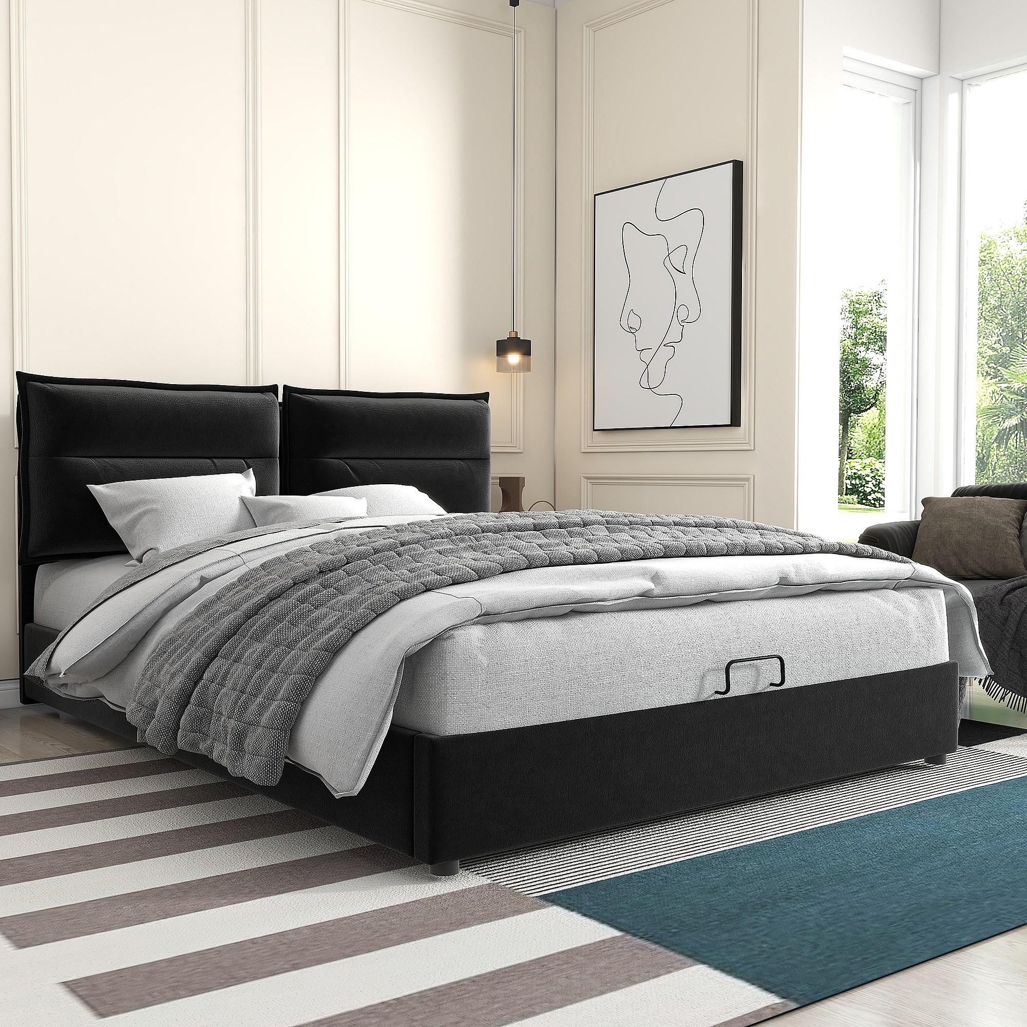 Lit double hydraulique 140x200 cm, tête de lit réglable, cadre en velours noir avec rangement