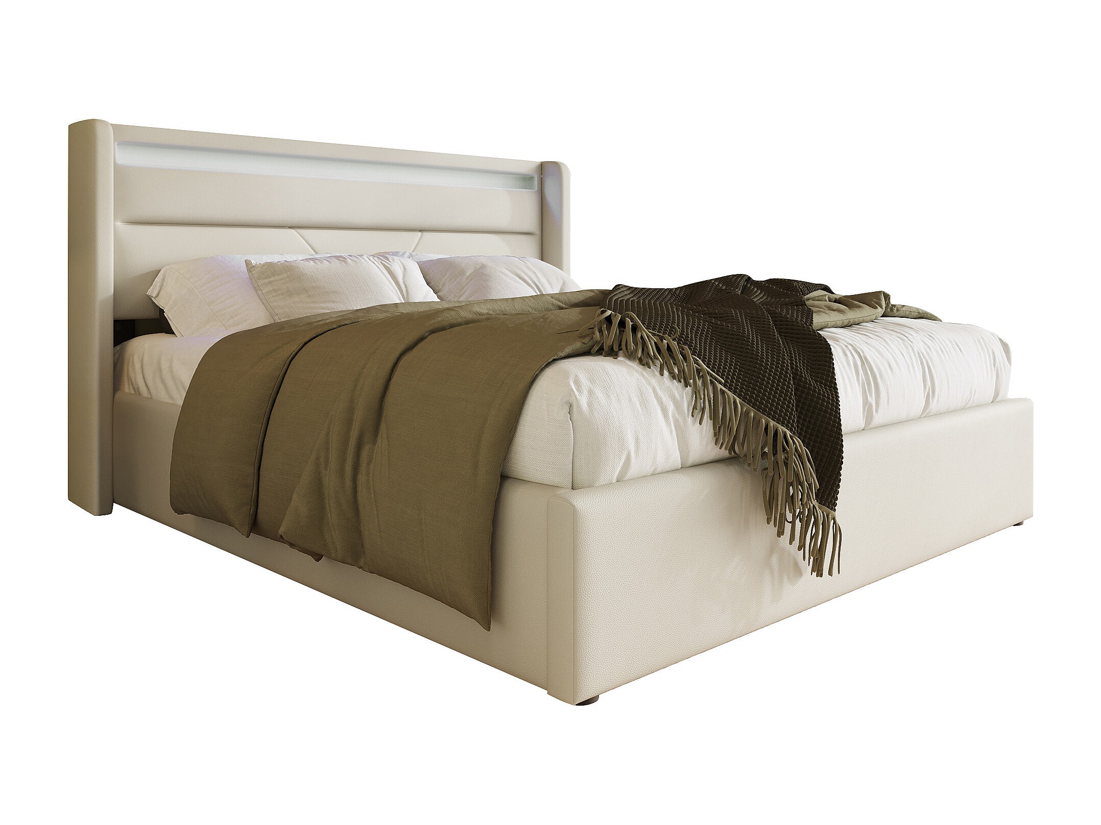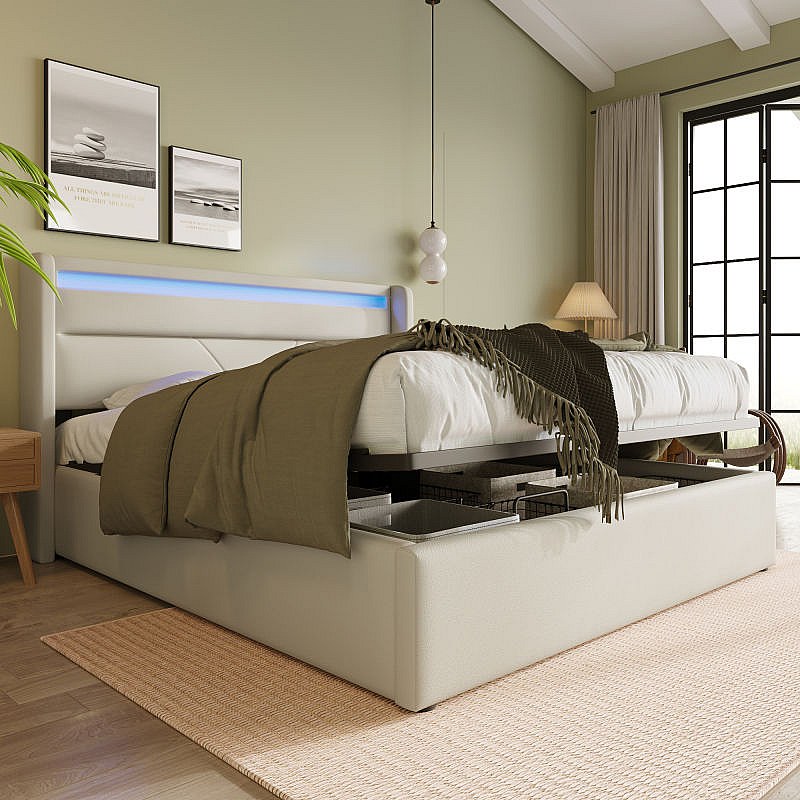 Lit double hydraulique avec éclairage LED, 140x200 cm, blanc, espace de rangement et télécommande