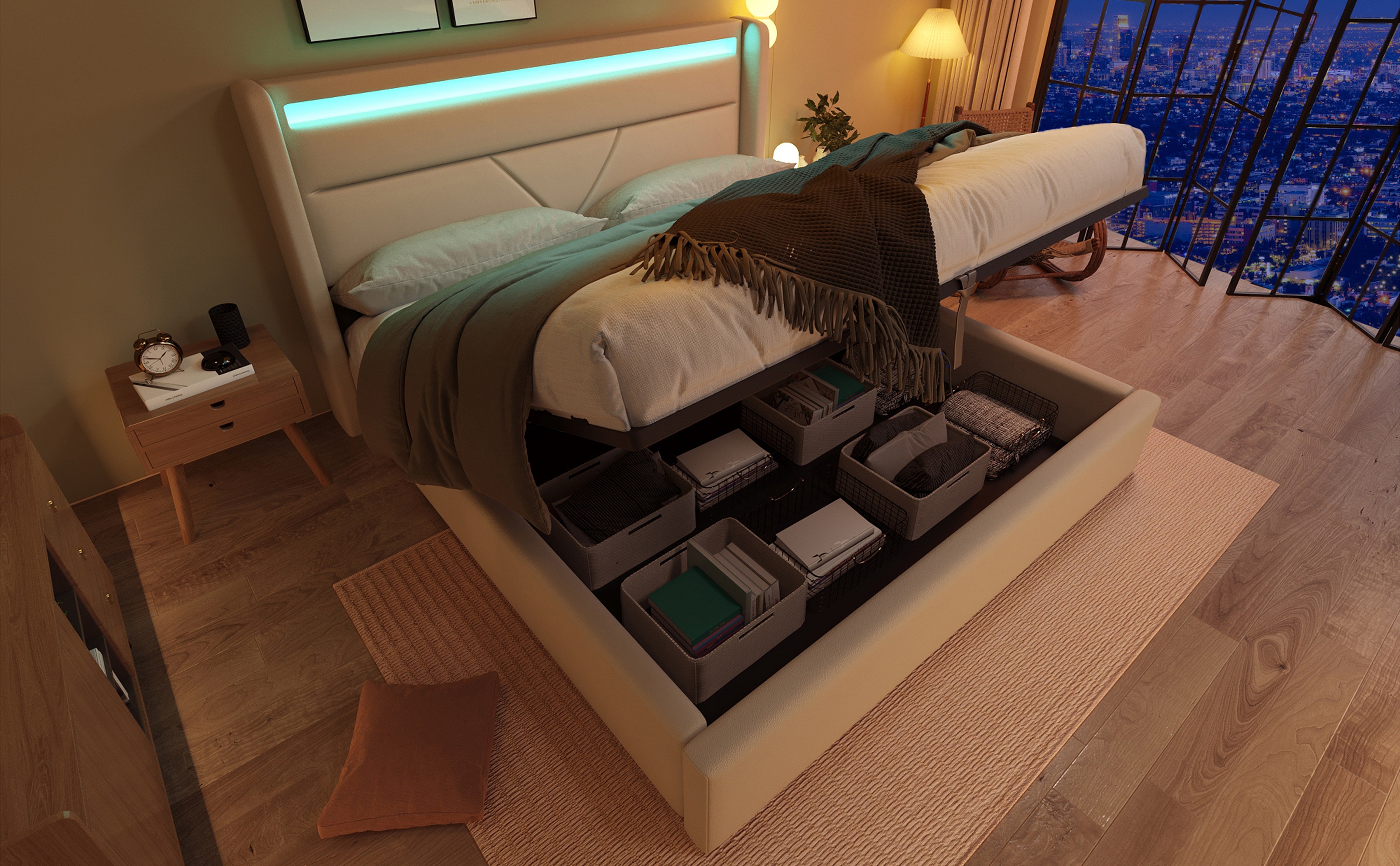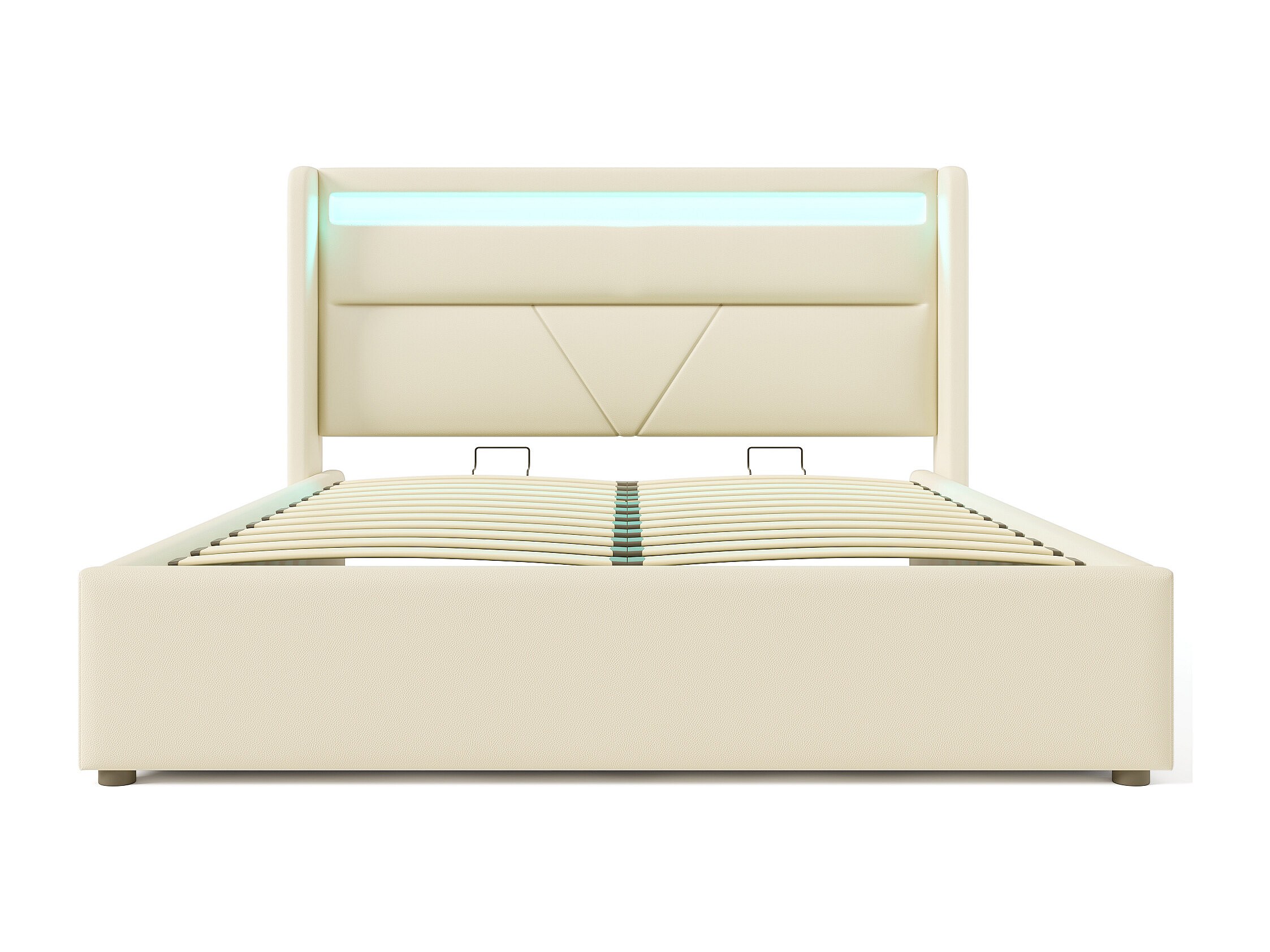 Lit double hydraulique avec éclairage LED, 160x200 cm, blanc, avec rangement et télécommande