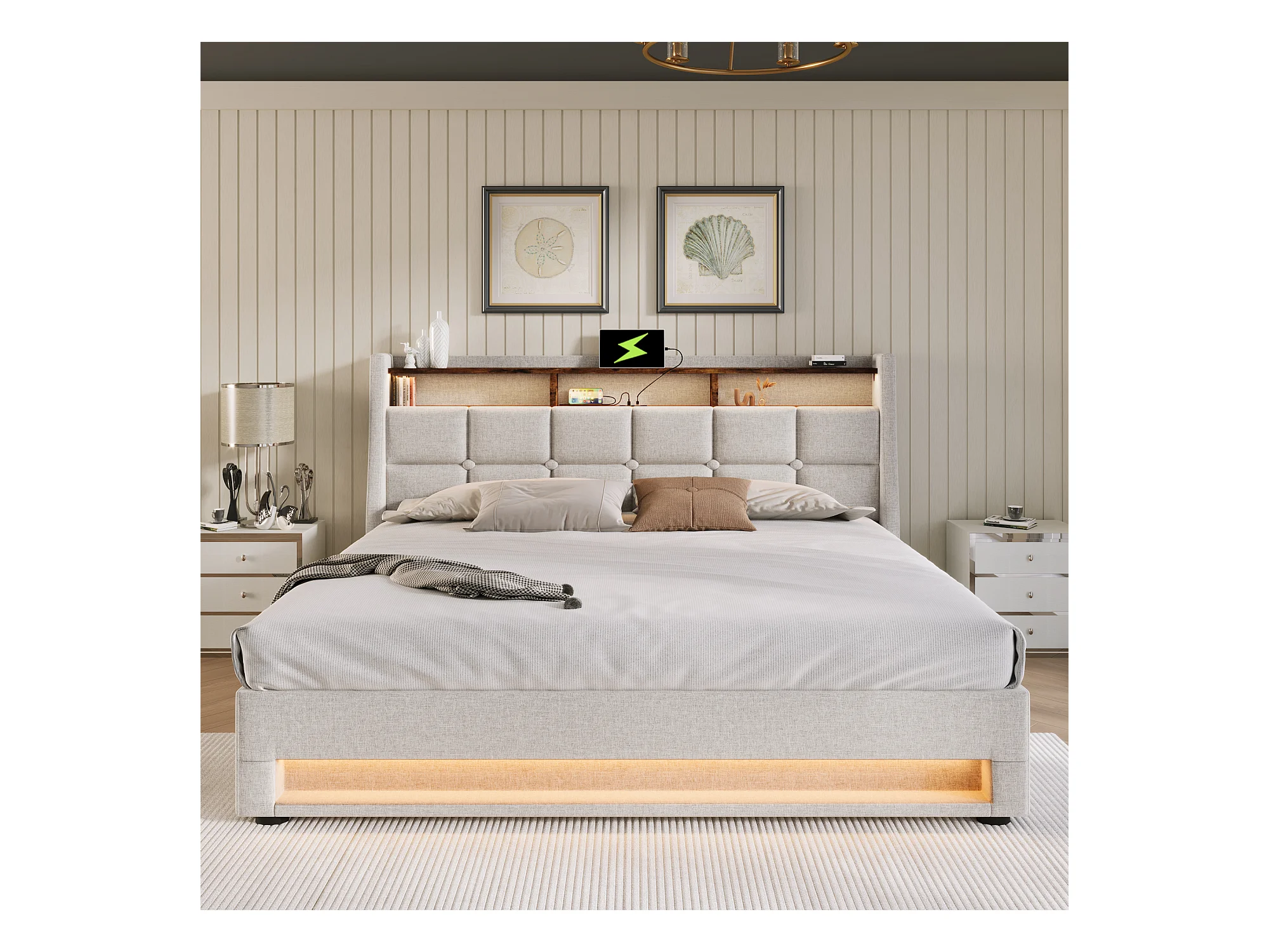 Lit double LED avec USB, cadre en lin beige, sommier métal, design vintage (165x210x117cm)