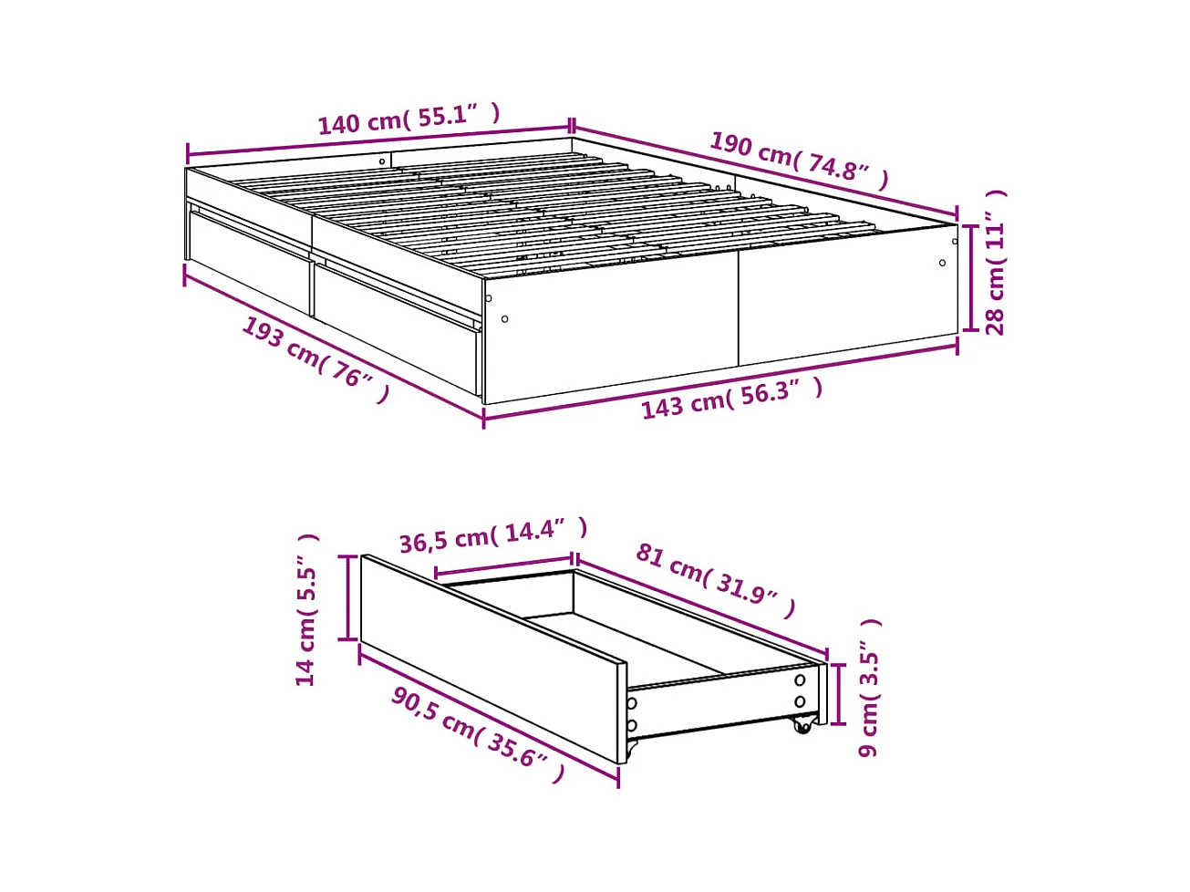Lit double | Lit adulte | Cadre de lit avec tiroirs chêne fumé 140x190 cm