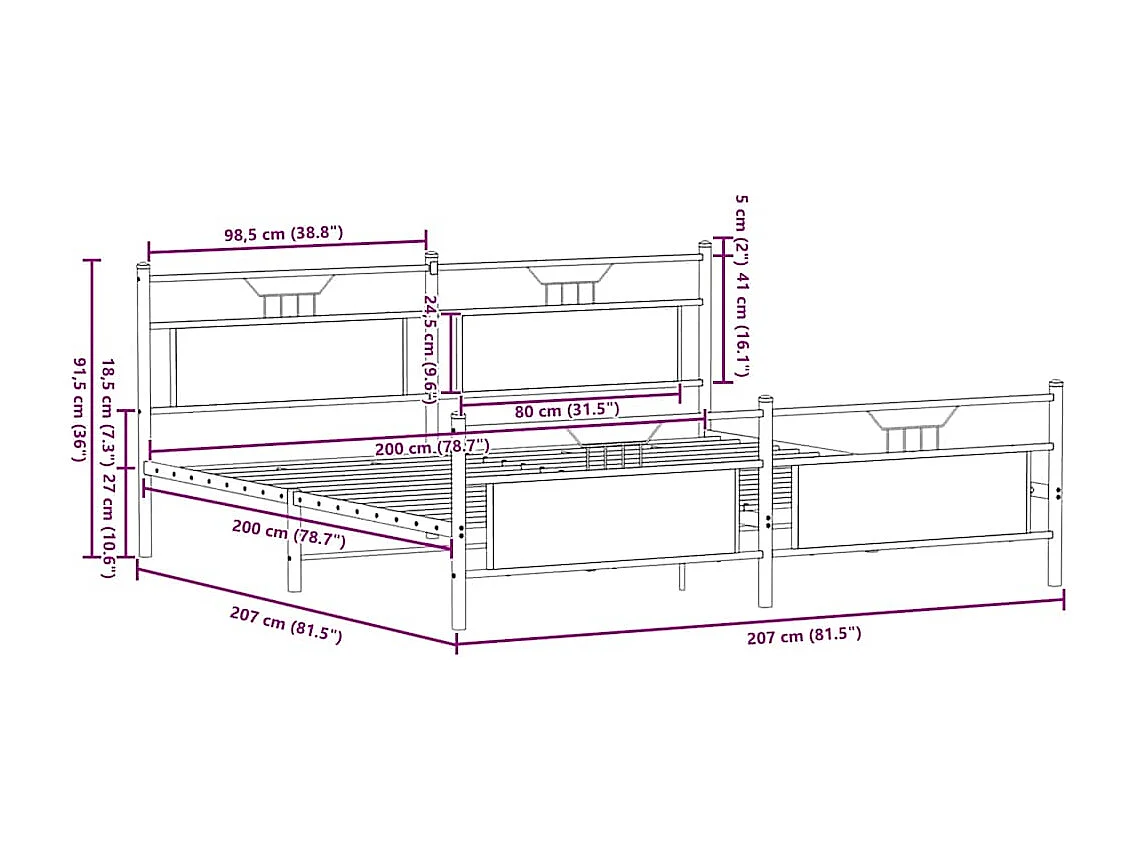Lit double | Lit adulte | Cadre de lit en métal chêne fumé 200x200 cm