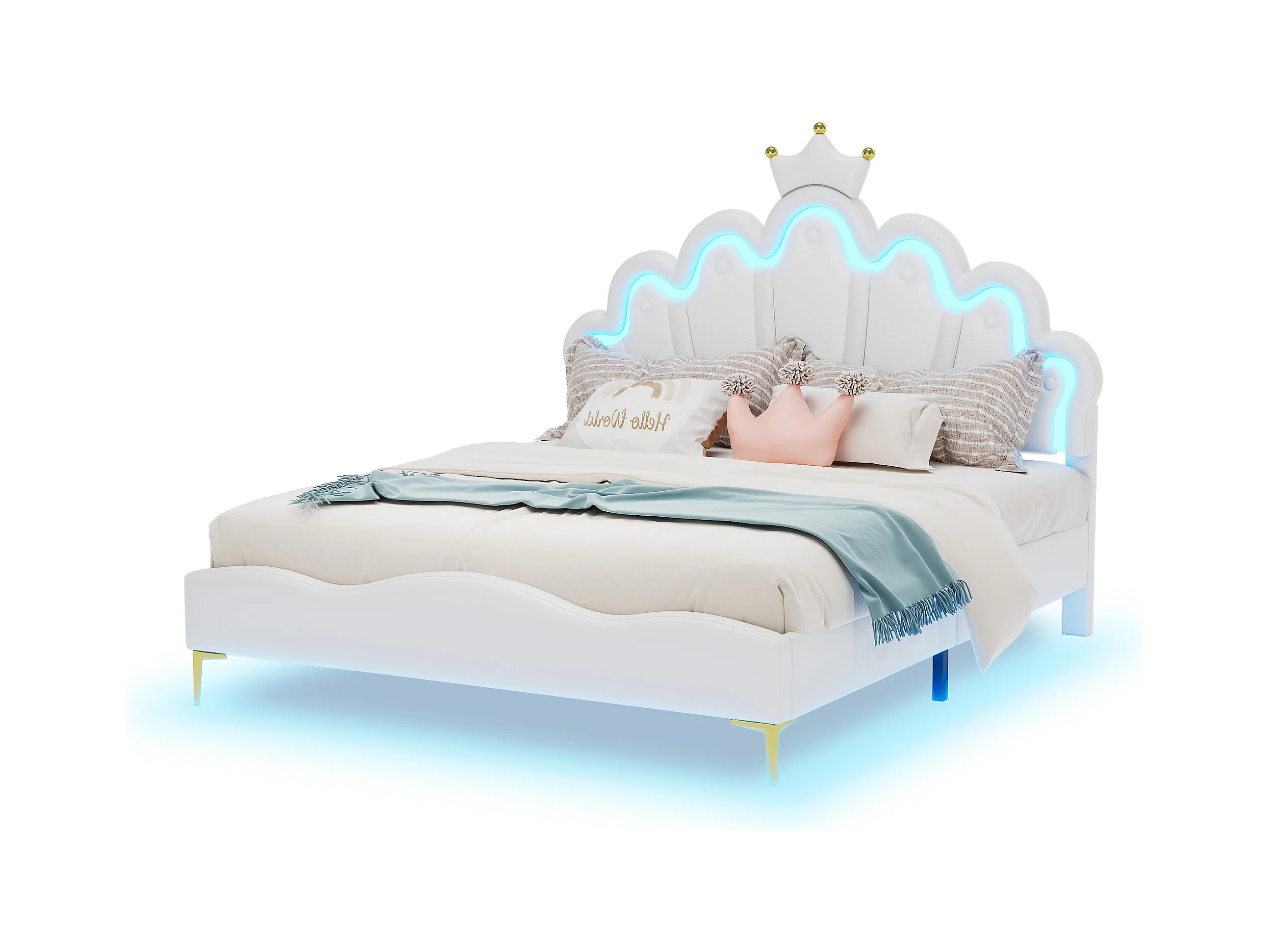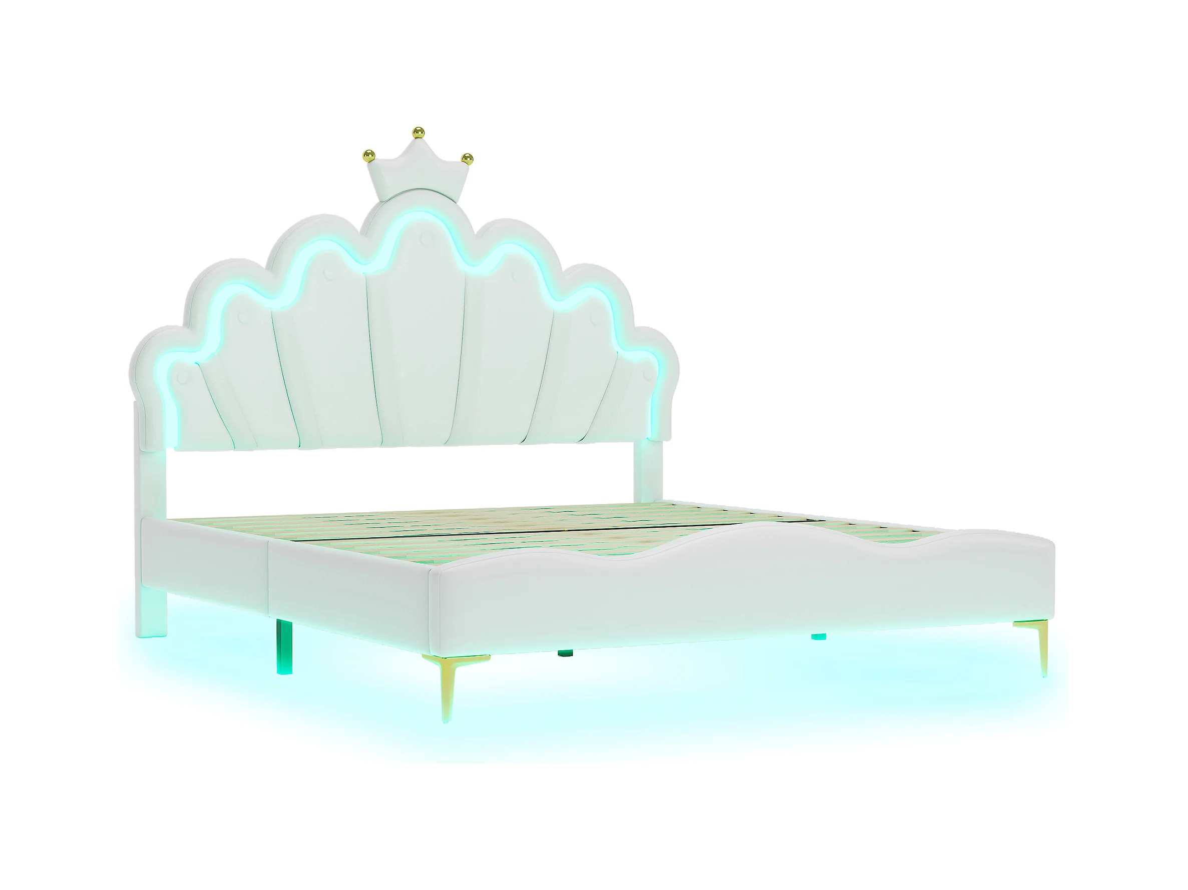 Lit double princesse enfant - 140 x 200 cm - avec Leds réglable - en cuir PU souple - blanc