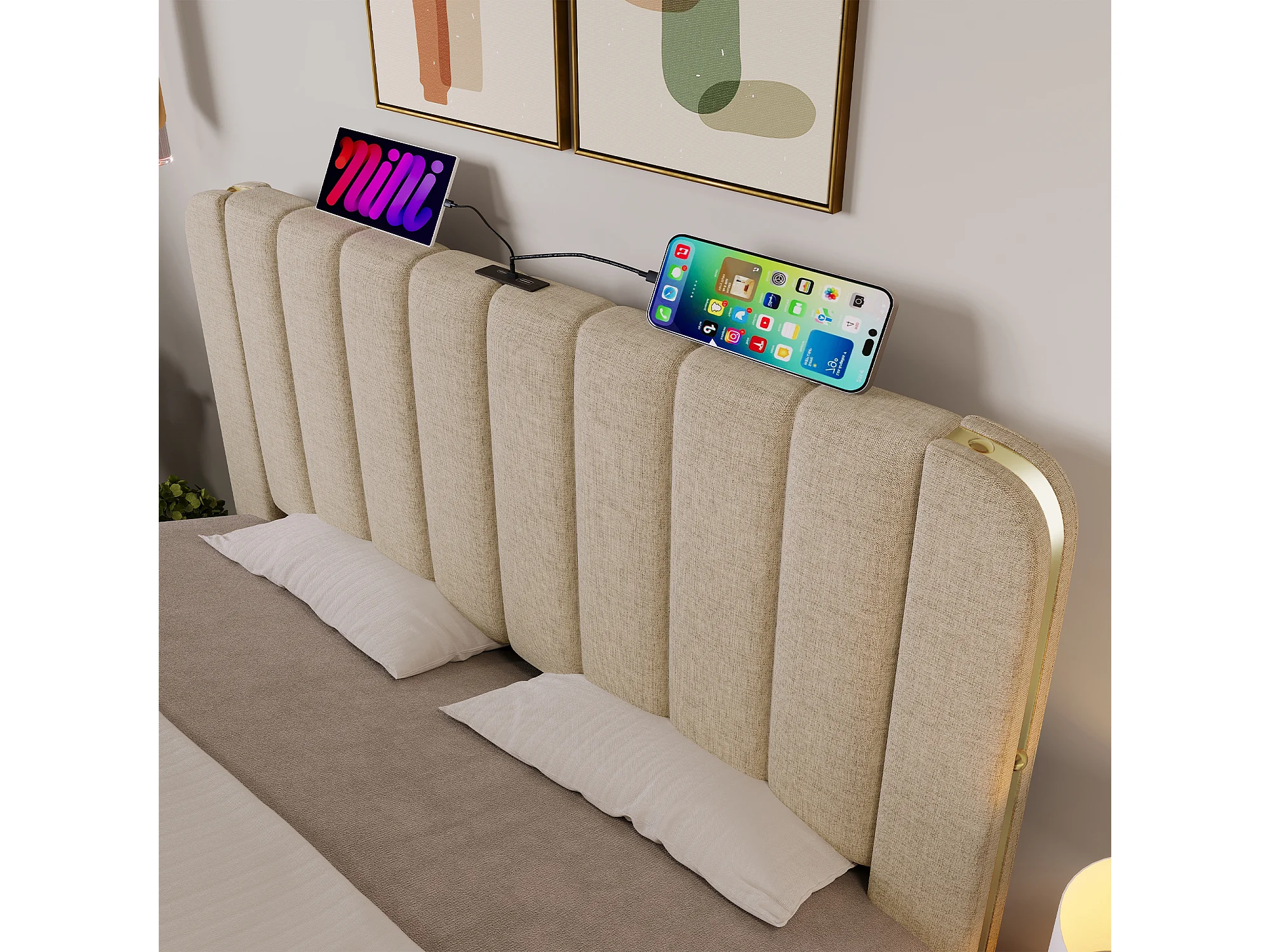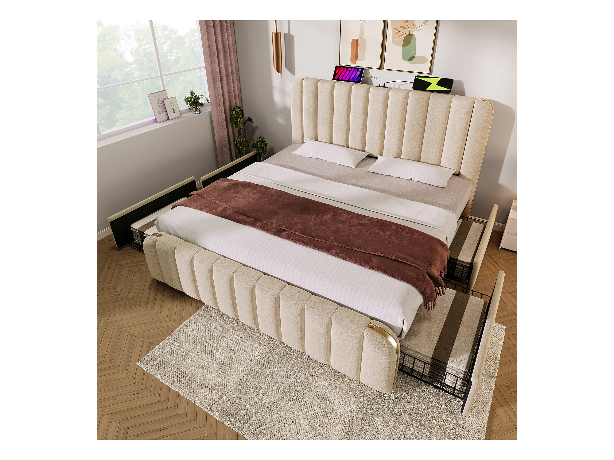 Lit double 180x200 cm - Lit adulte avec 4 tiroirs - chargement USB Type-C - - lin beige sans matelas