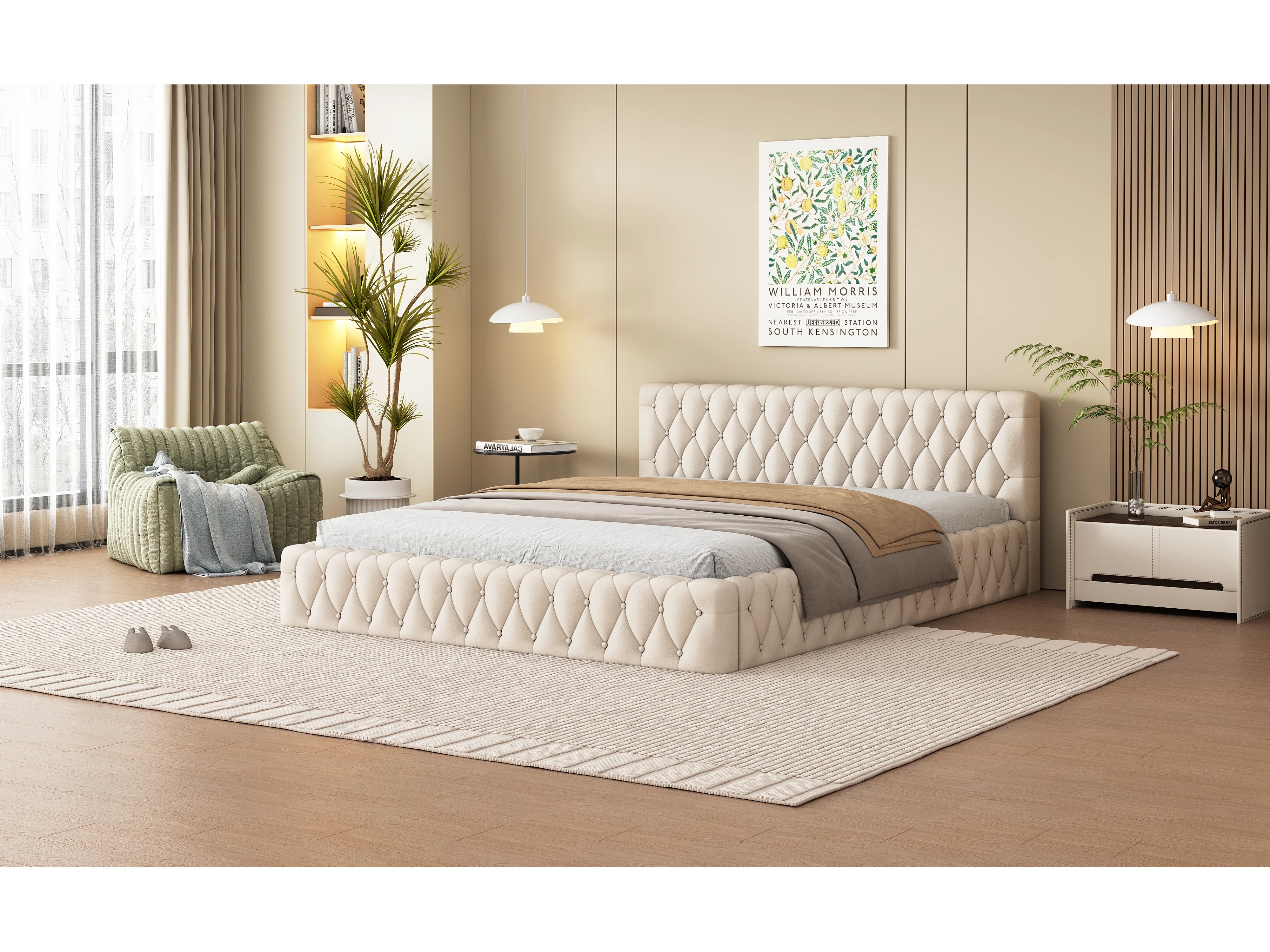 Lit double tapissé jeunesse 140x200 cm, velours beige, design élégant et confortable (216x152x61 cm)