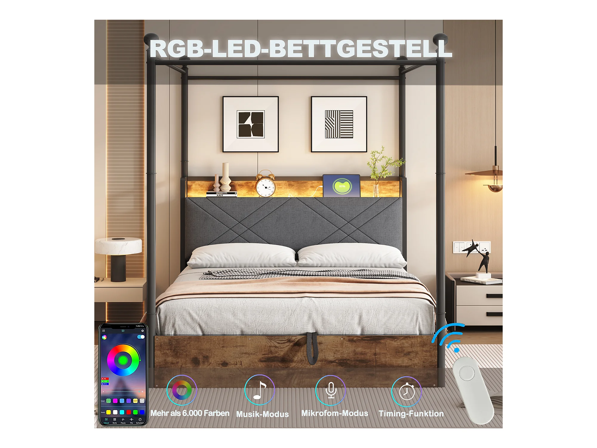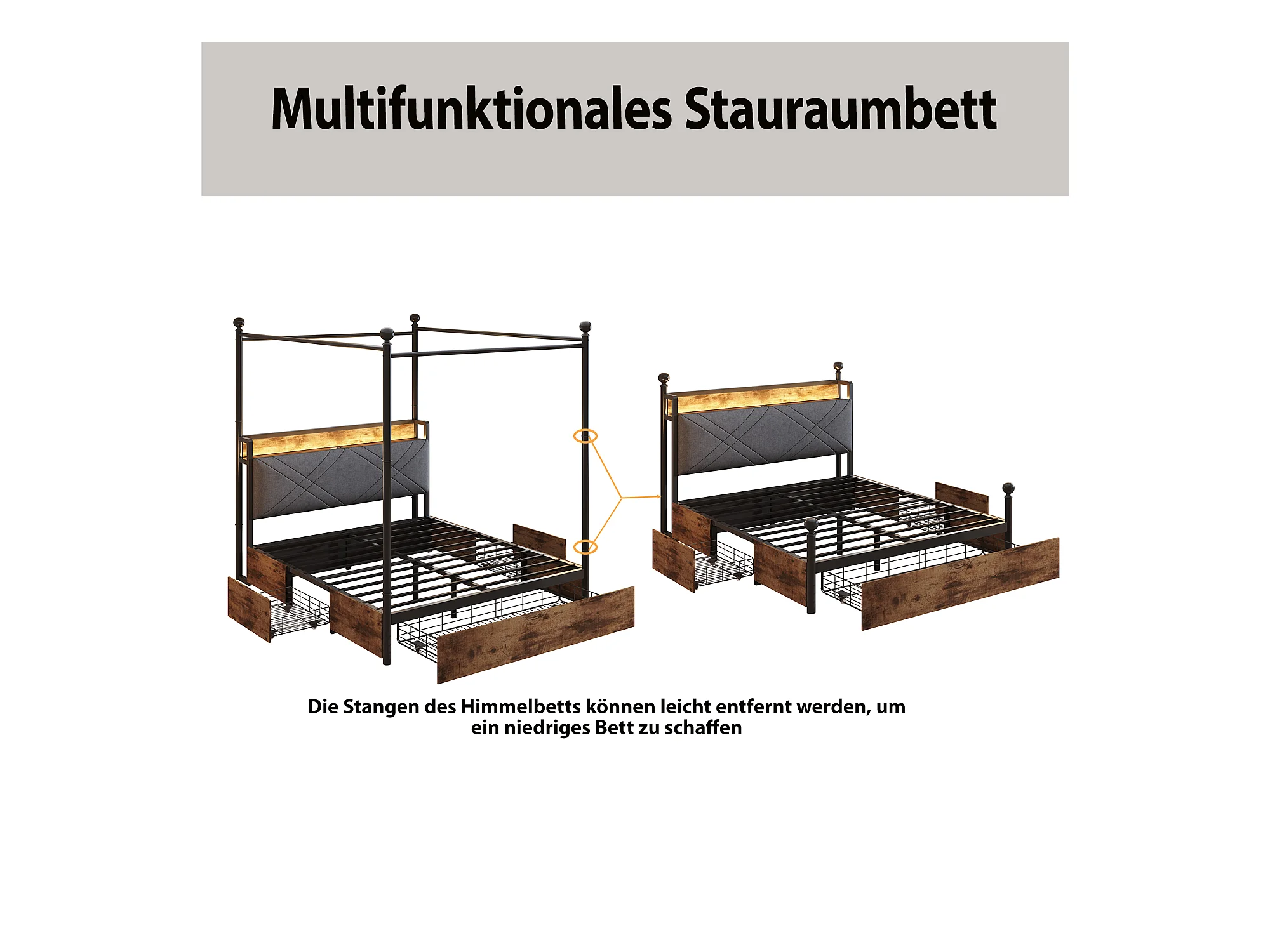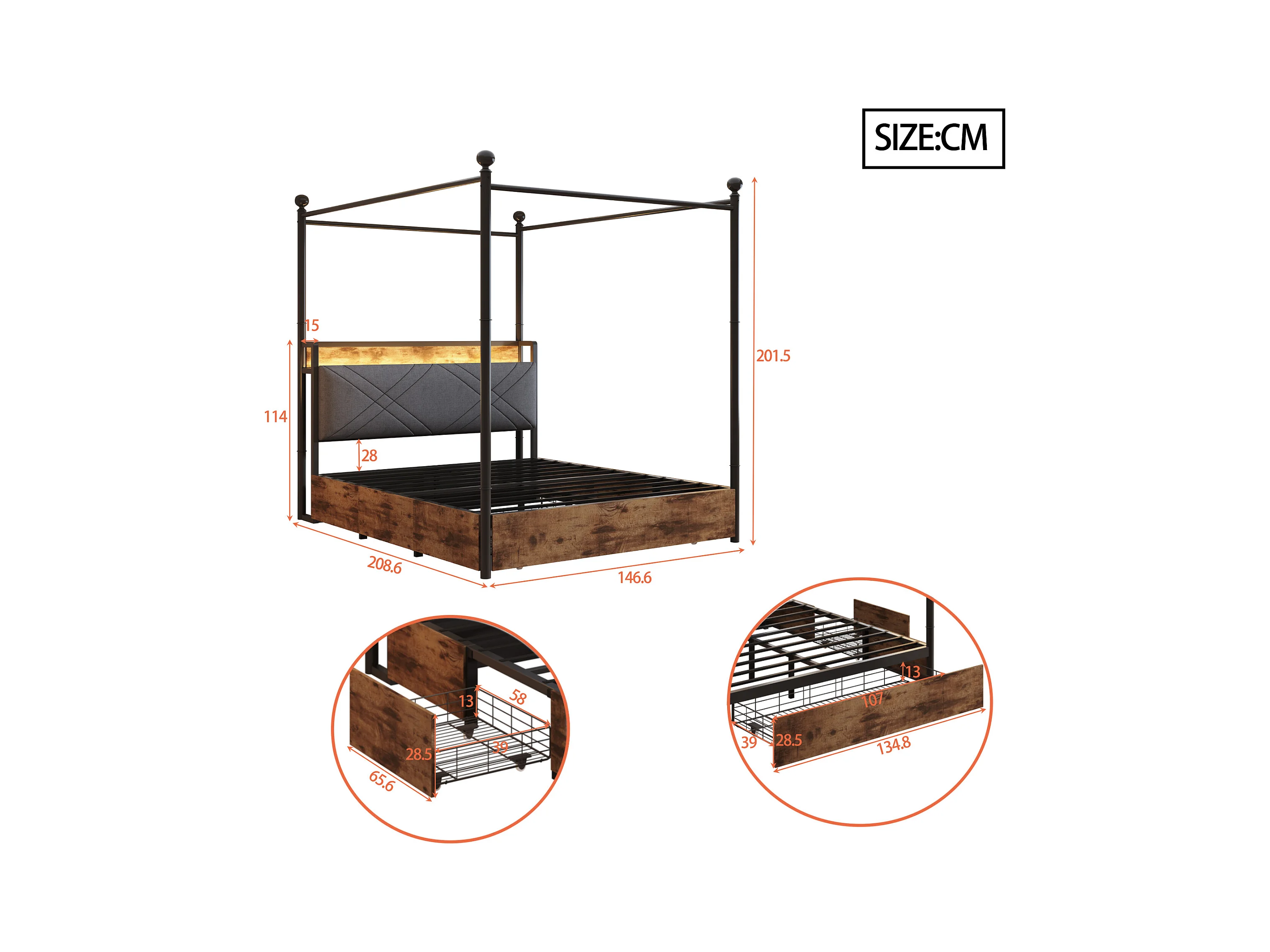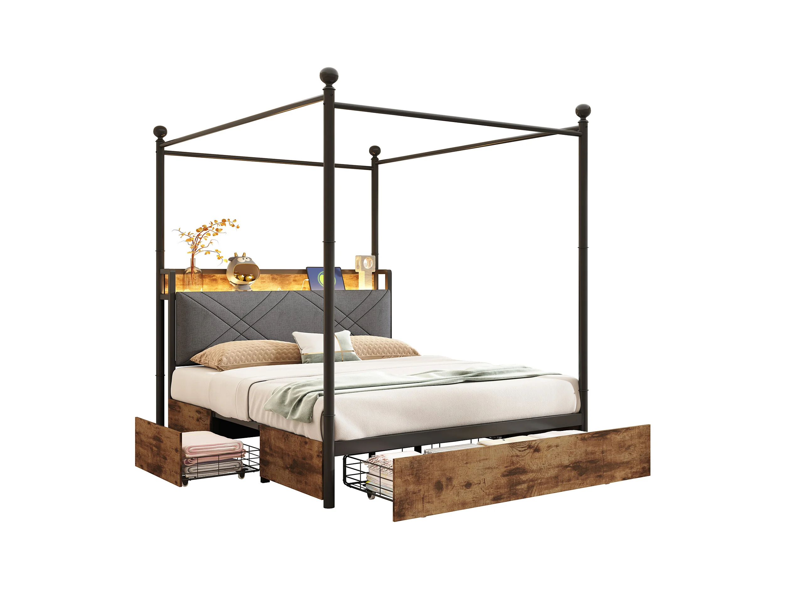 Lit en métal double - 140 x 190 cm - avec 3 tiroirs + baldaquin en fer forgé + Leds + USB/Type-C - métal - noir