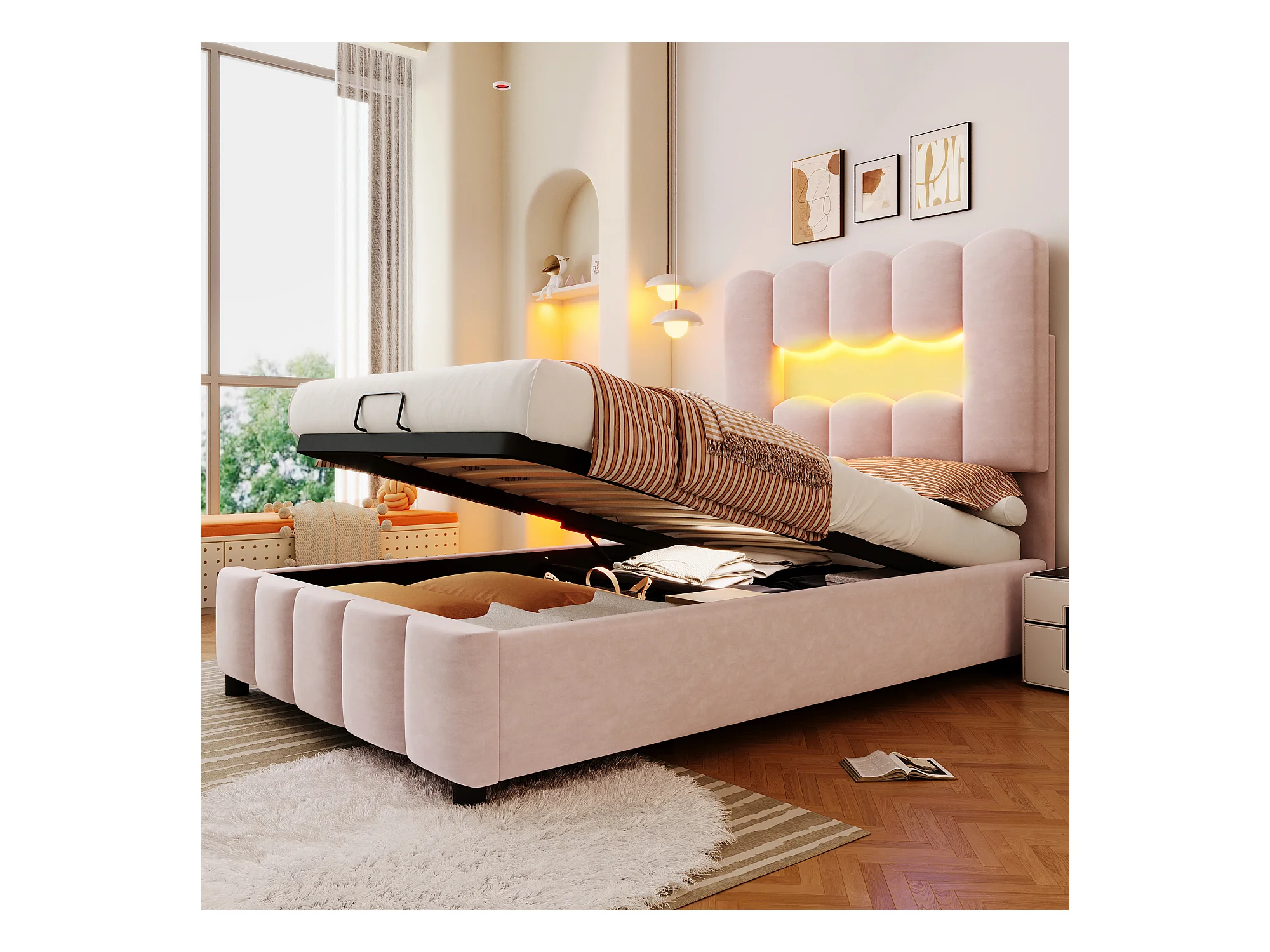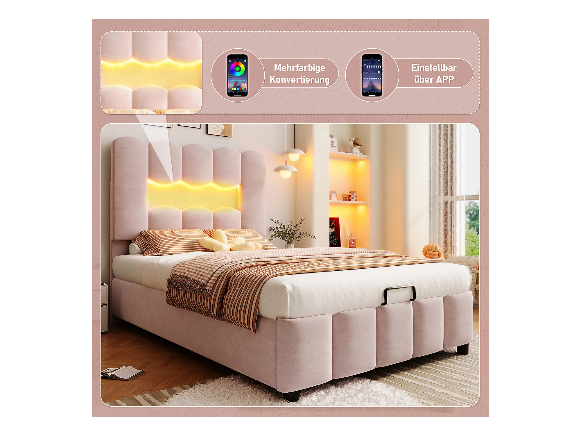 Lit en Velours Rembourré 90 x 200 cm, sans Matelas, Éclairage LED, Système Hydraulique, Tête de Lit Réglable, Rose