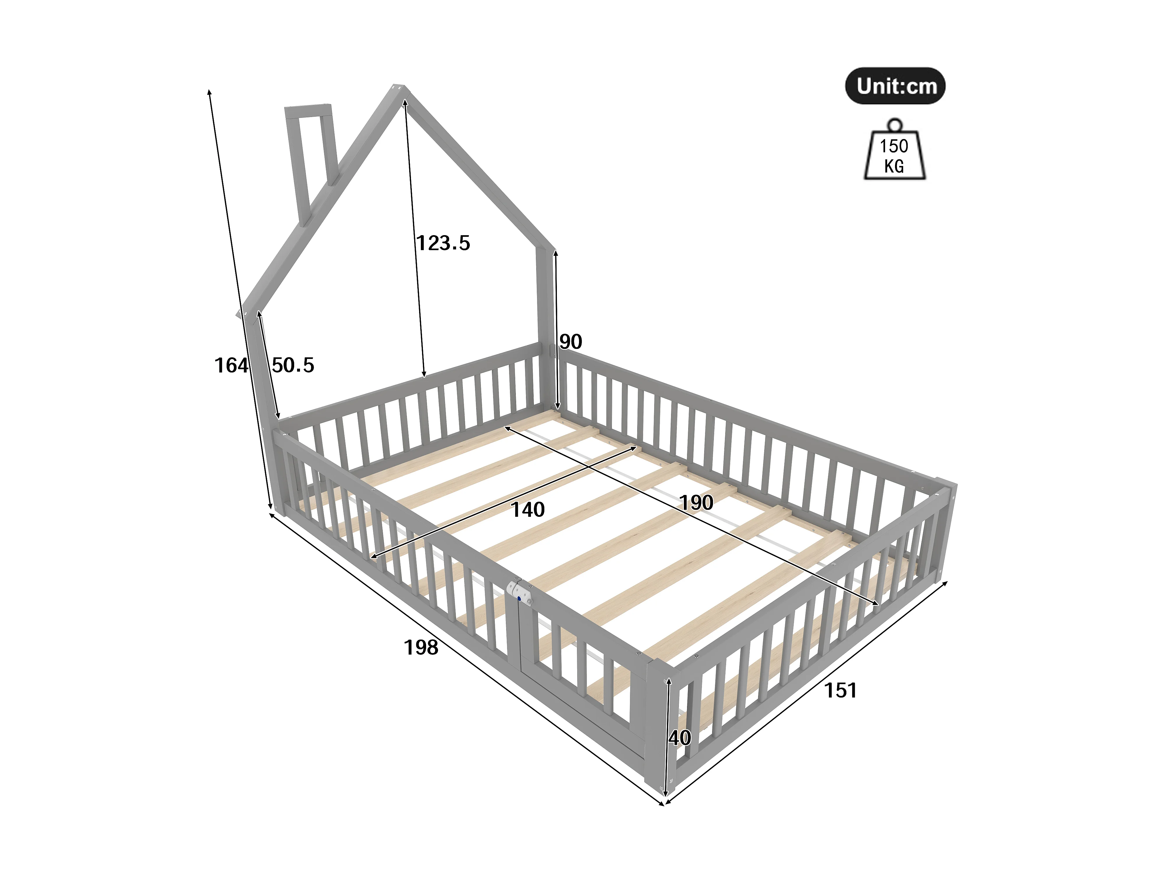 Lit enfant 140x190 cm avec forme cheminée, sommier (sans matelas), bois de pin, style minimaliste, Gris