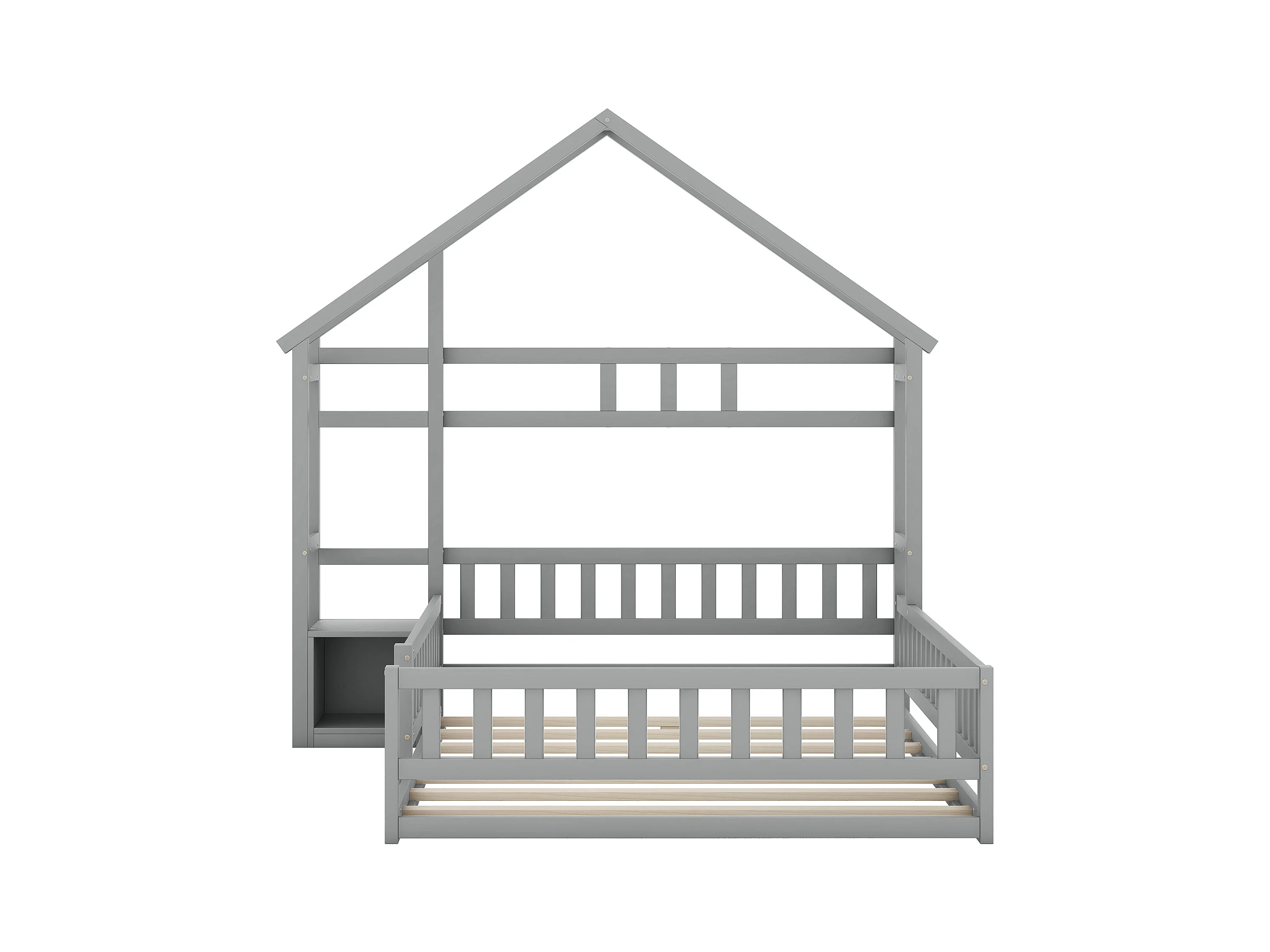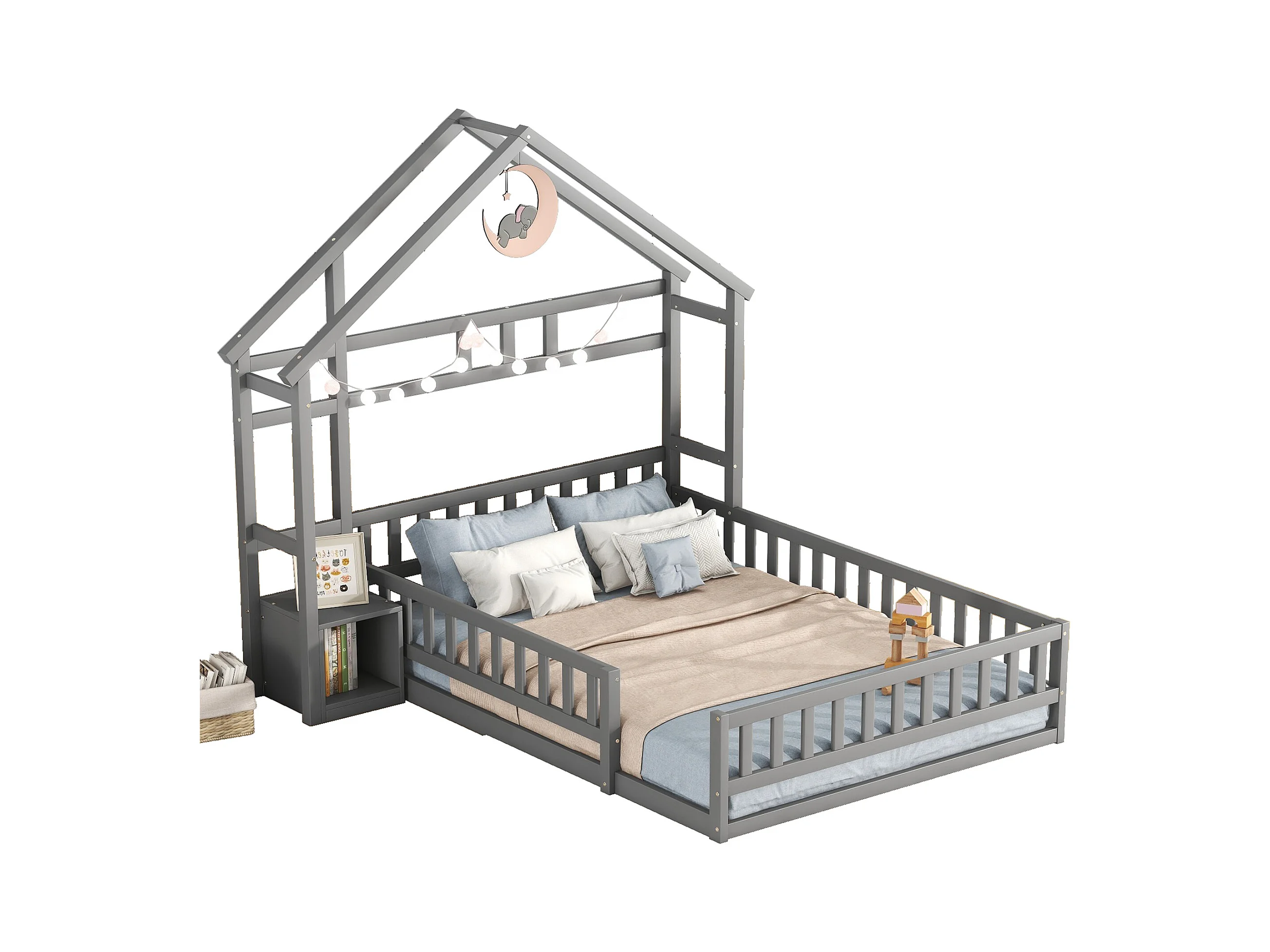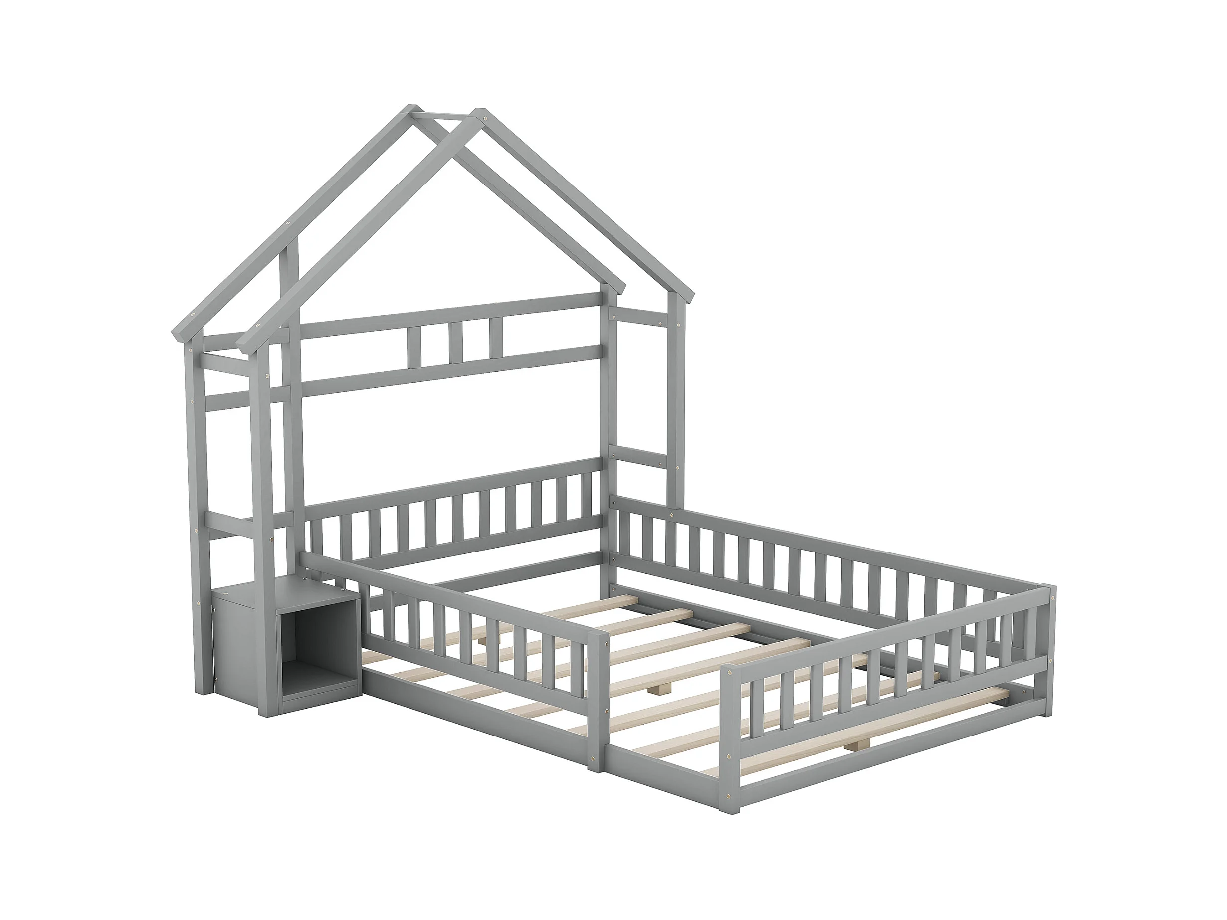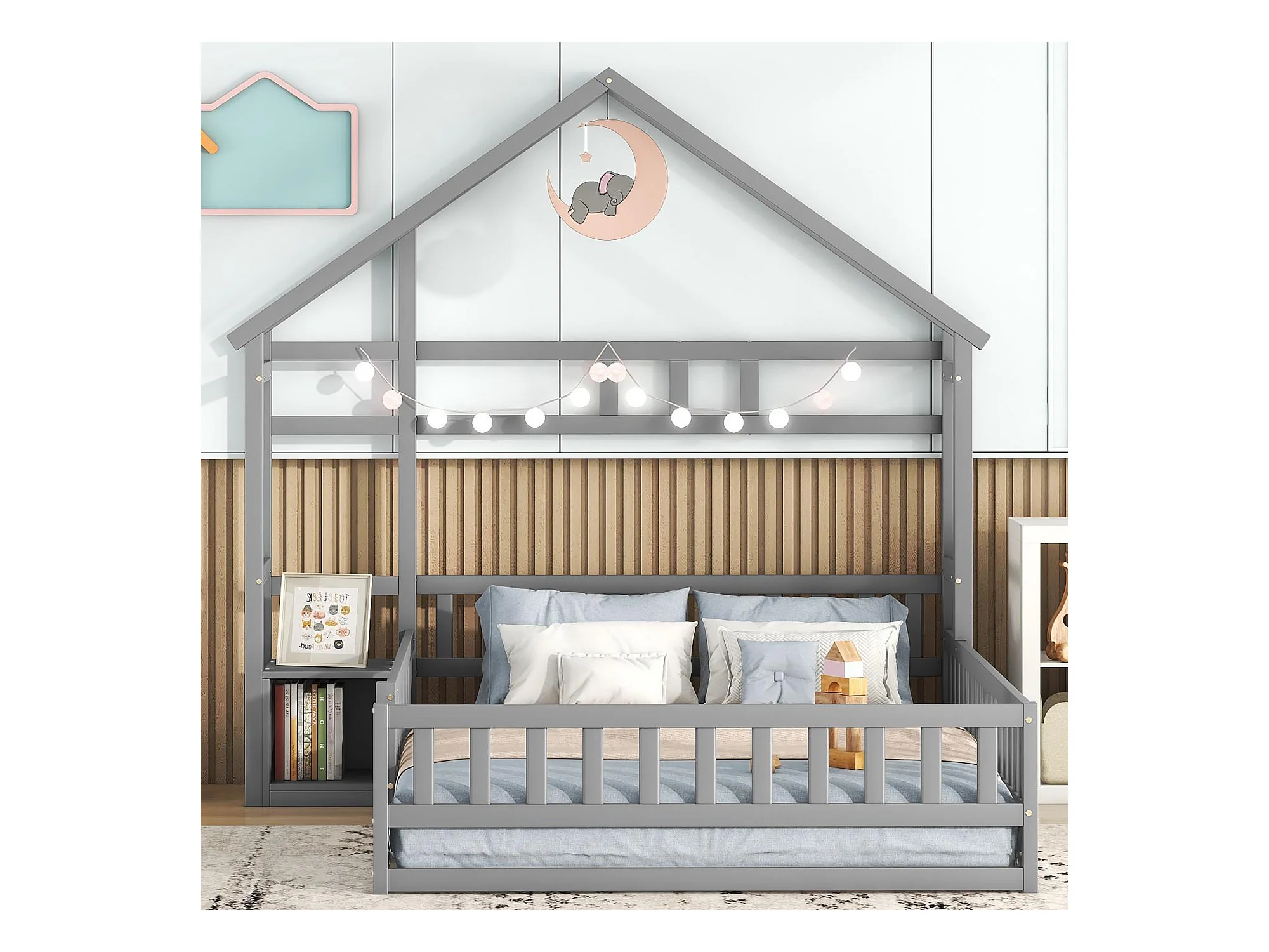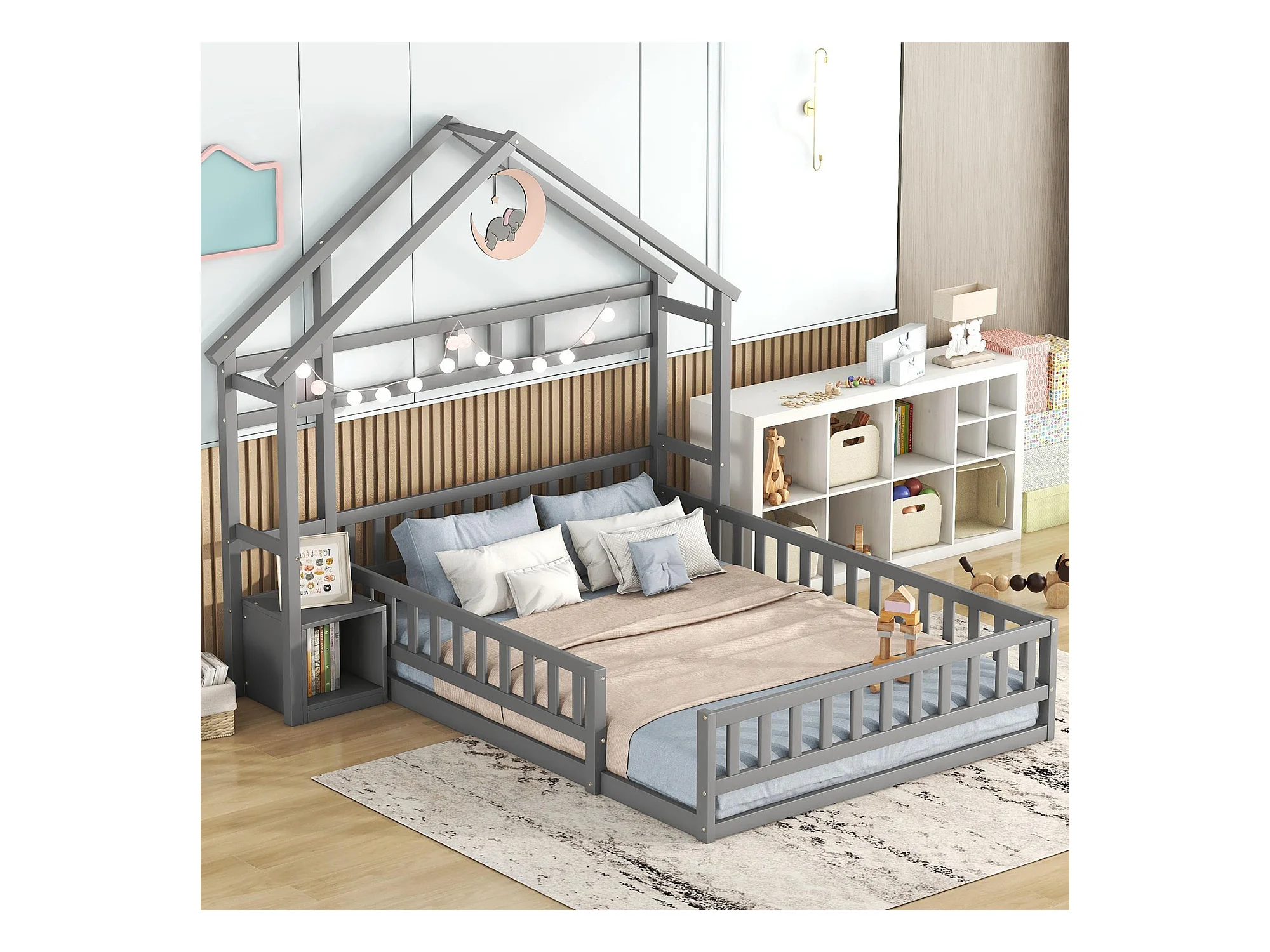 Lit enfant 140x190 cm, lit plat avec barreau maison et table de nuit, sans matelas, Bois, Gris