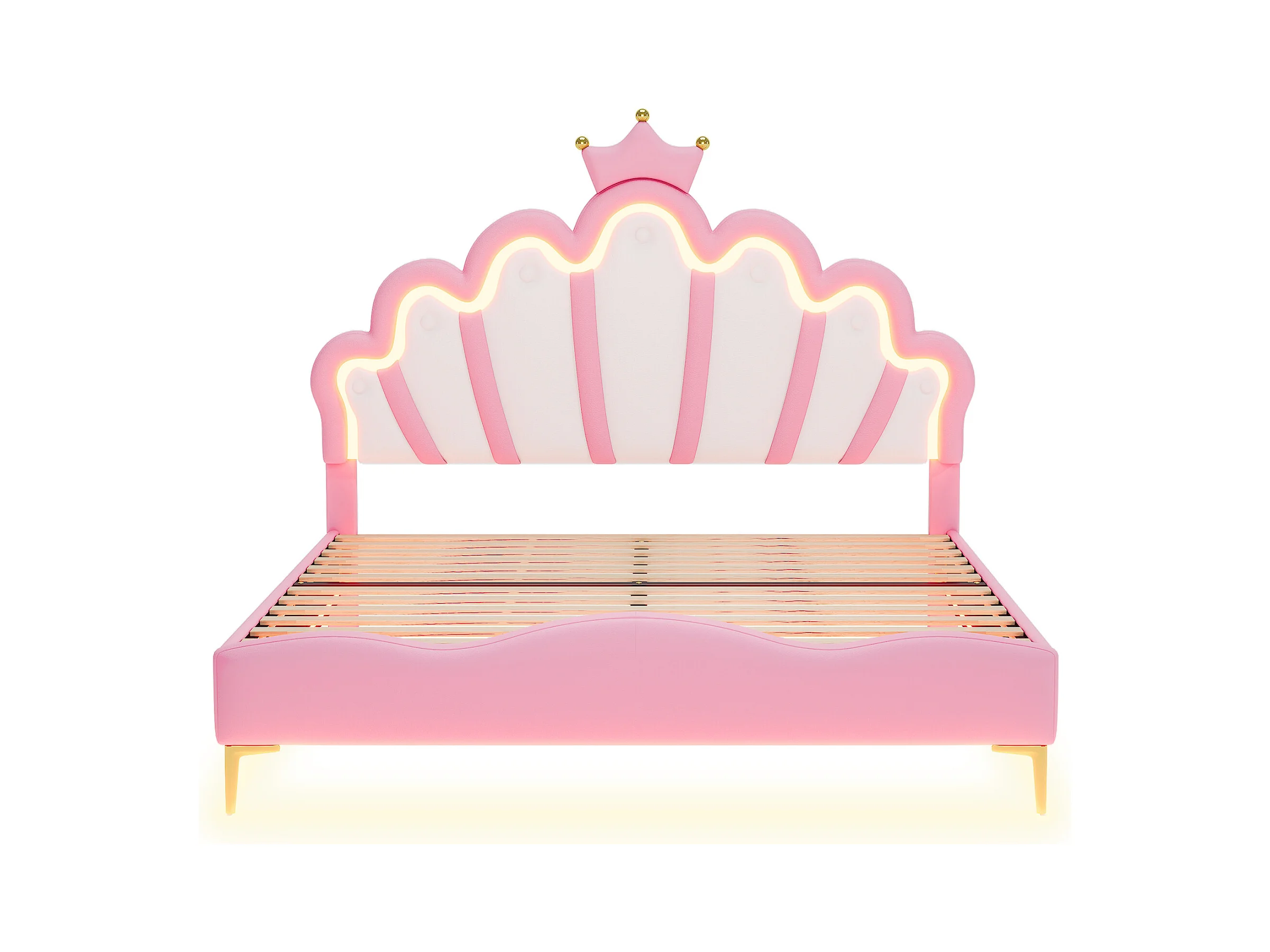 Lit enfant 140x200cm avec LED et tête de lit en forme de couronne, lit princesse en PU rose, sans matelas