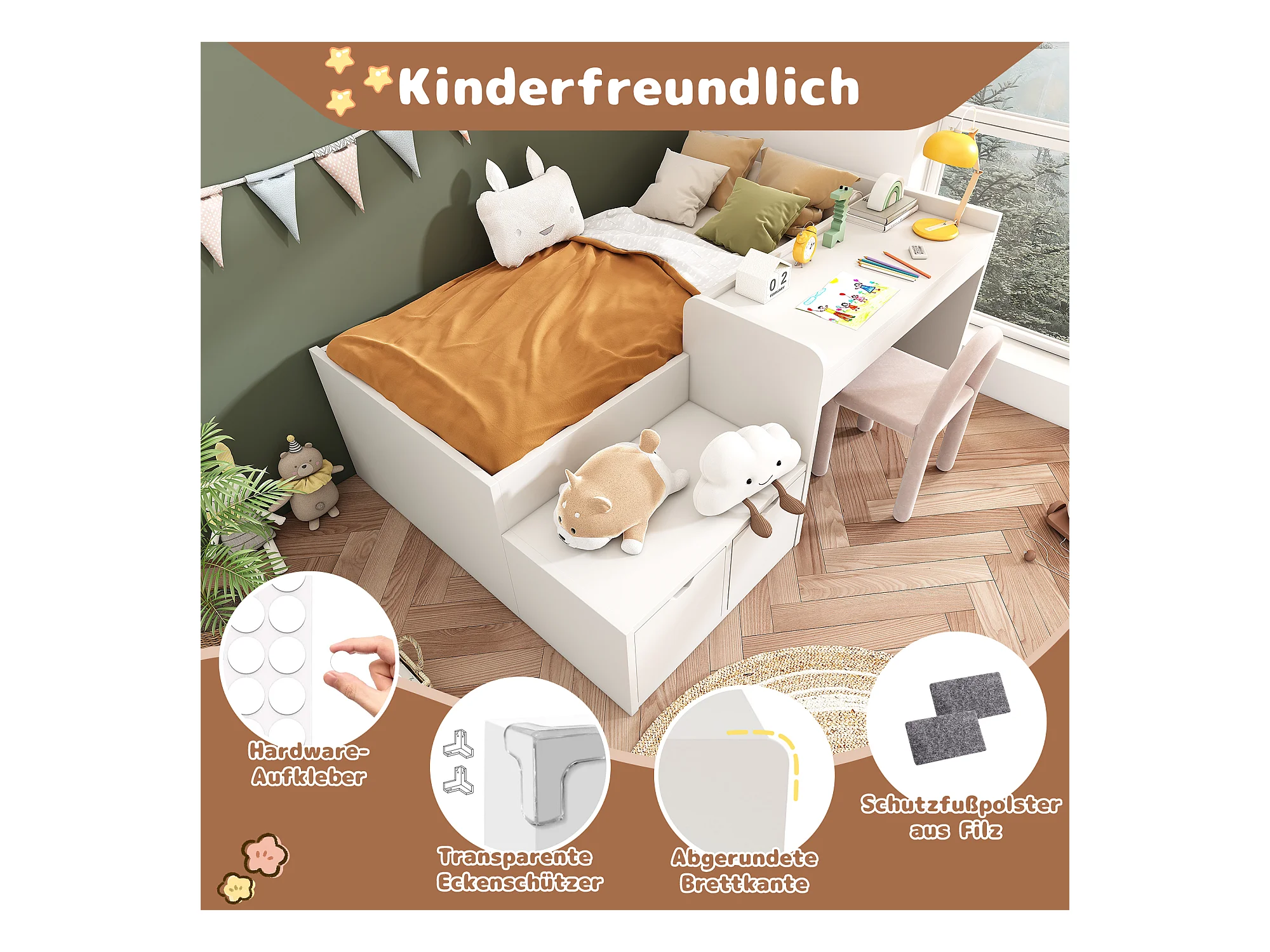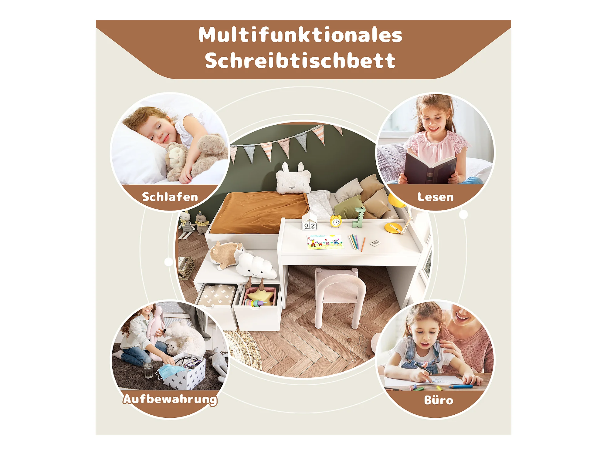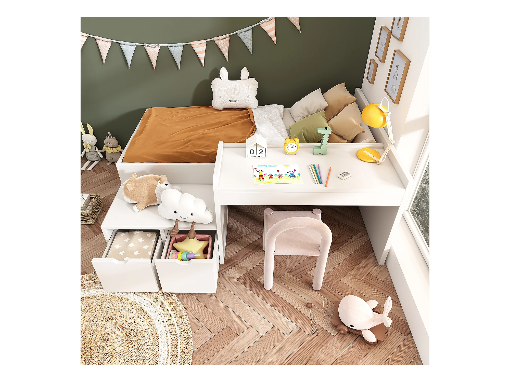 Lit enfant 90 x 200 cm avec bureau et 2 tiroirs - bois massif - sommier à lattes - blanc (sans matelas)