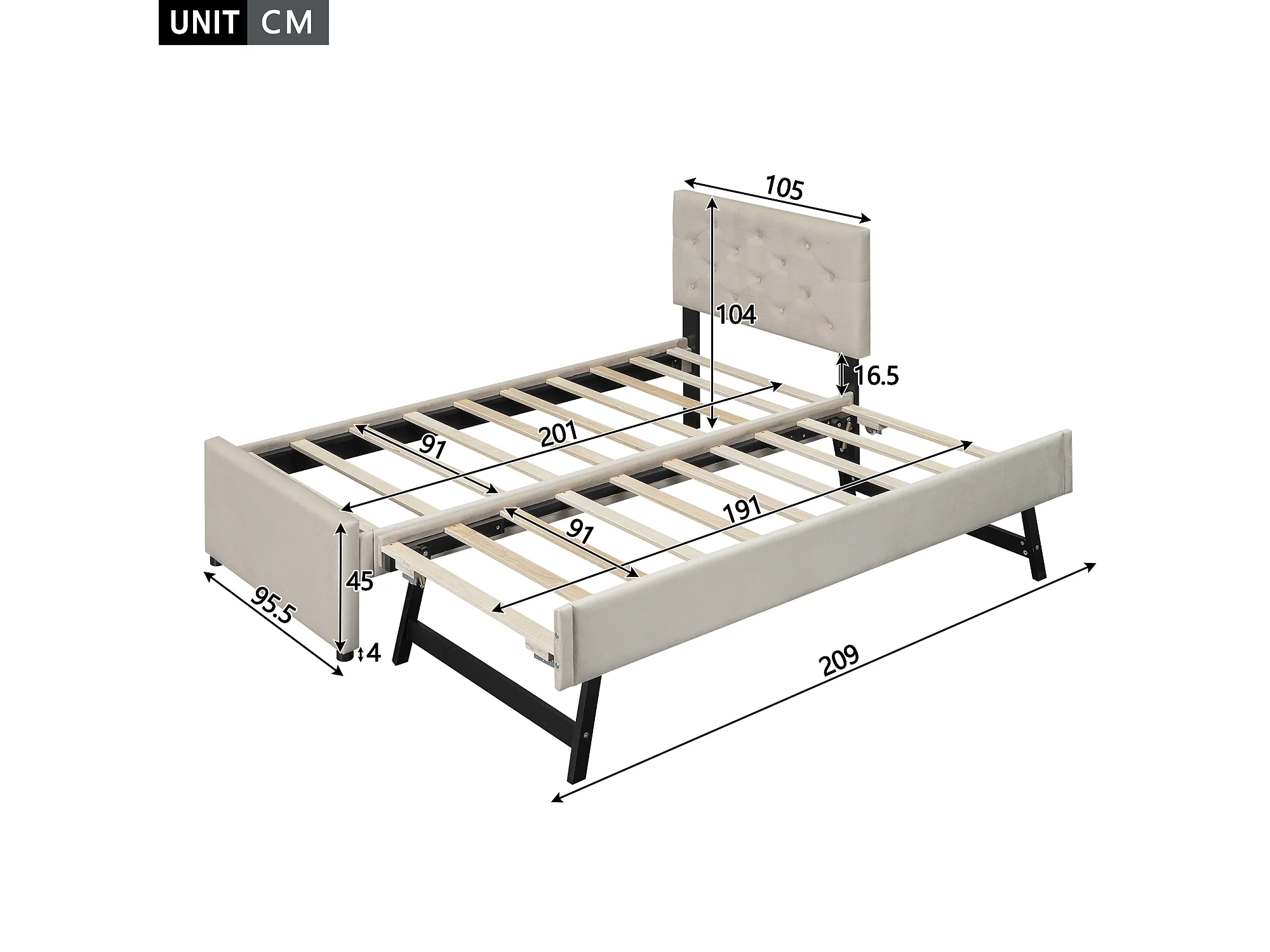 Lit enfant 90 x 200 cm, velours beige, avec lit gigogne et sommier à lattes - sans matelas