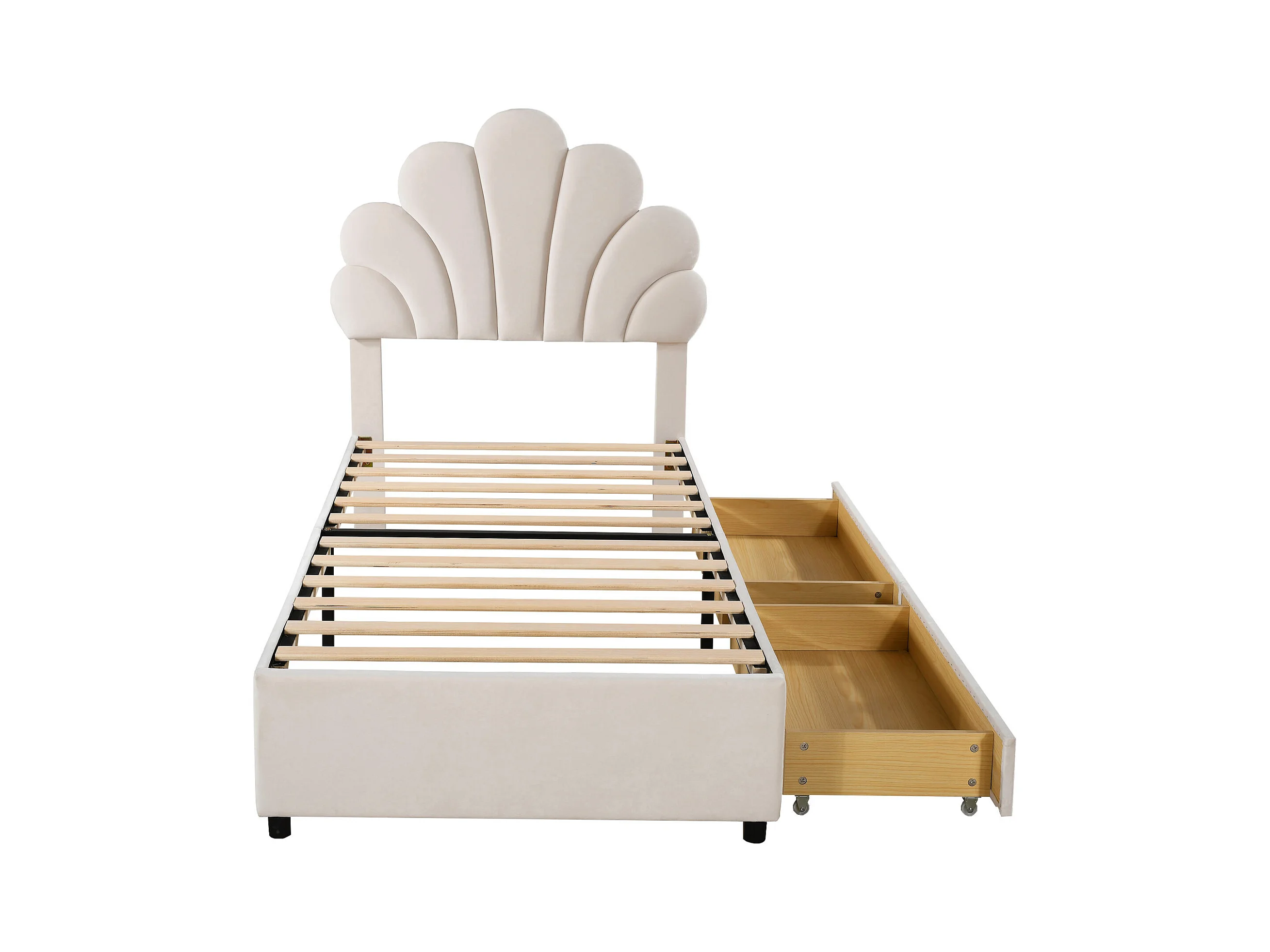 Lit enfant 90 x 200 cm - velours beige - avec tête de lit et sommier à lattes capitonnés - 2 tiroirs - sans matelas