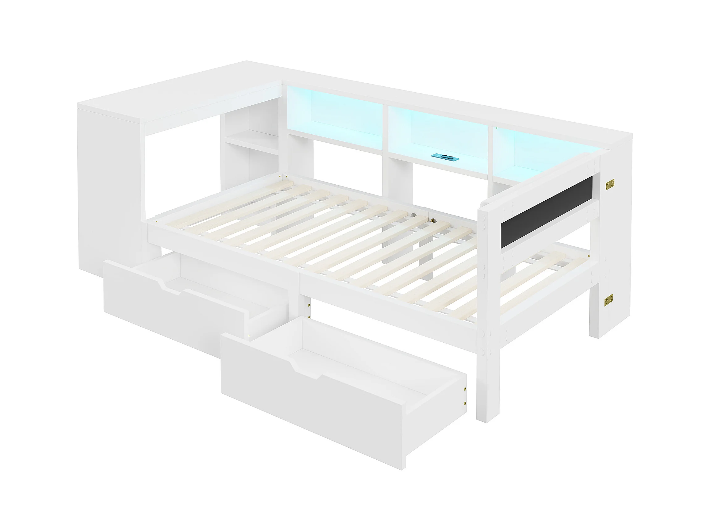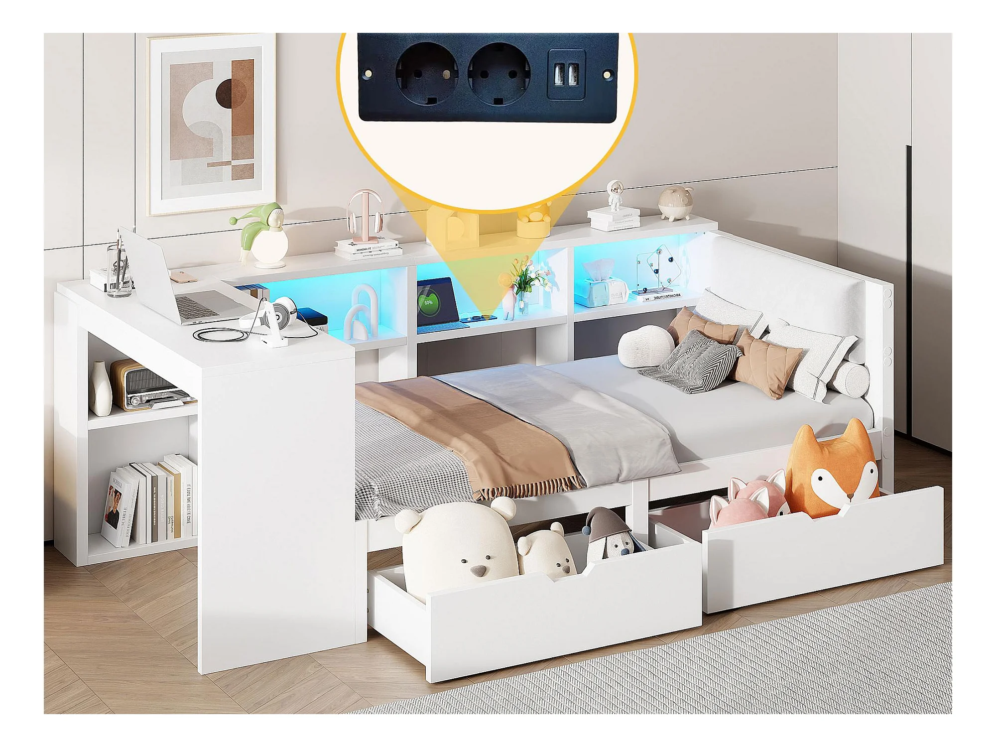 Lit enfant 90x200cm - avec 2 tiroirs et station de charge - avec lumières LED colorées - blanc (sans matelas)