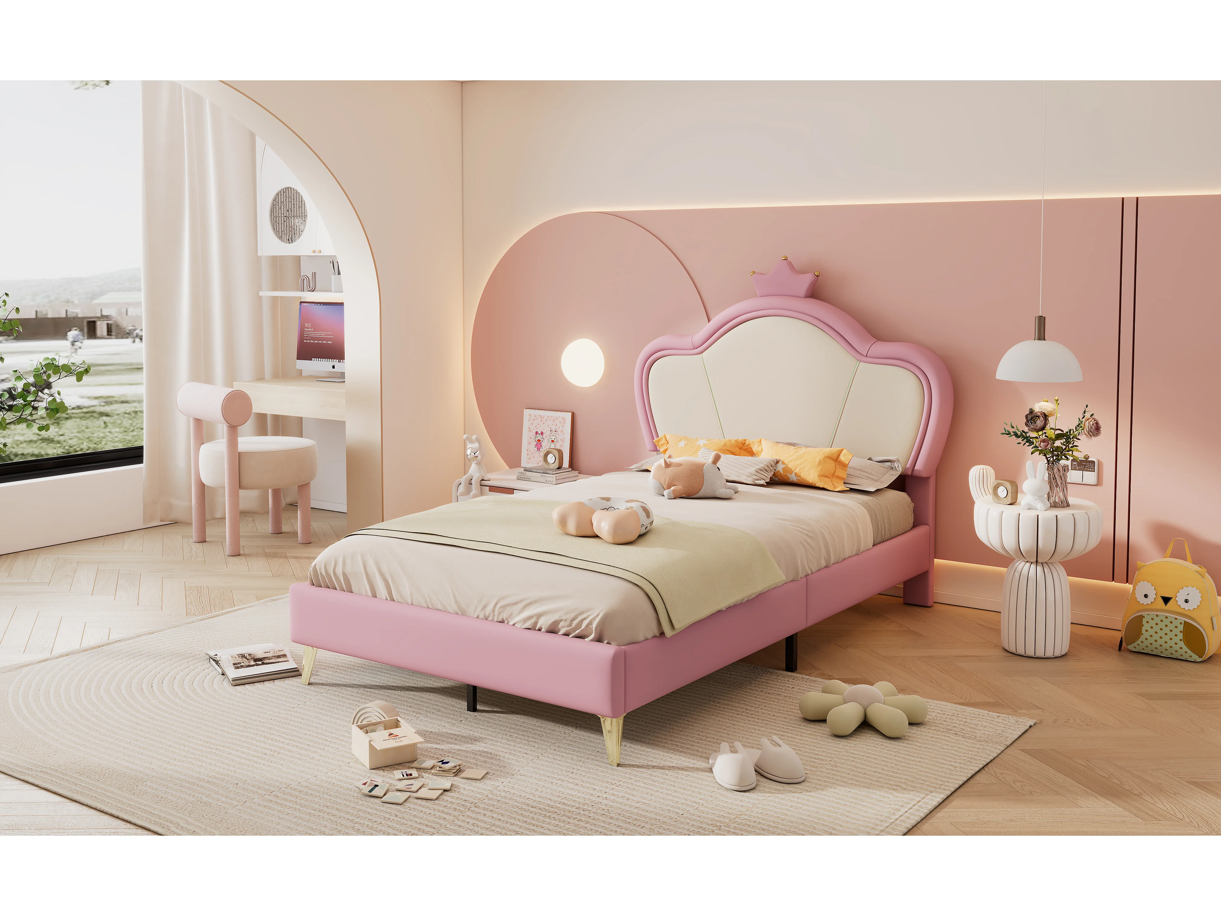 Lit enfant avec tête de lit couronnée, protection douce, pieds métalliques, PU, Rose + Blanc, 90x200cm