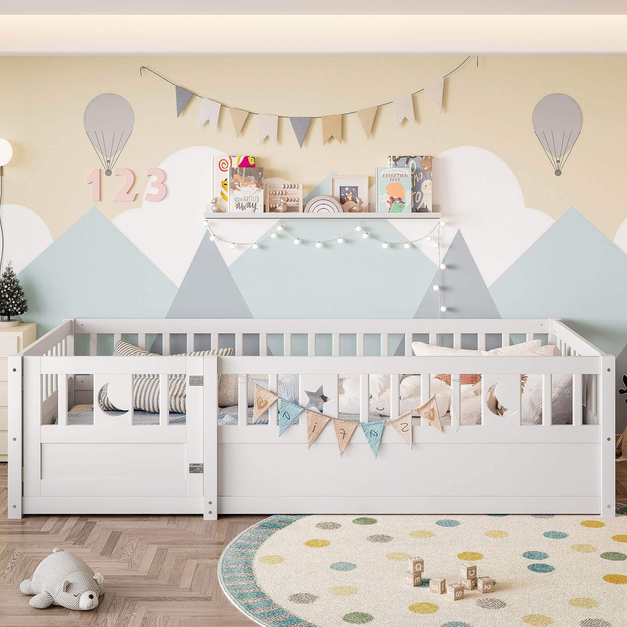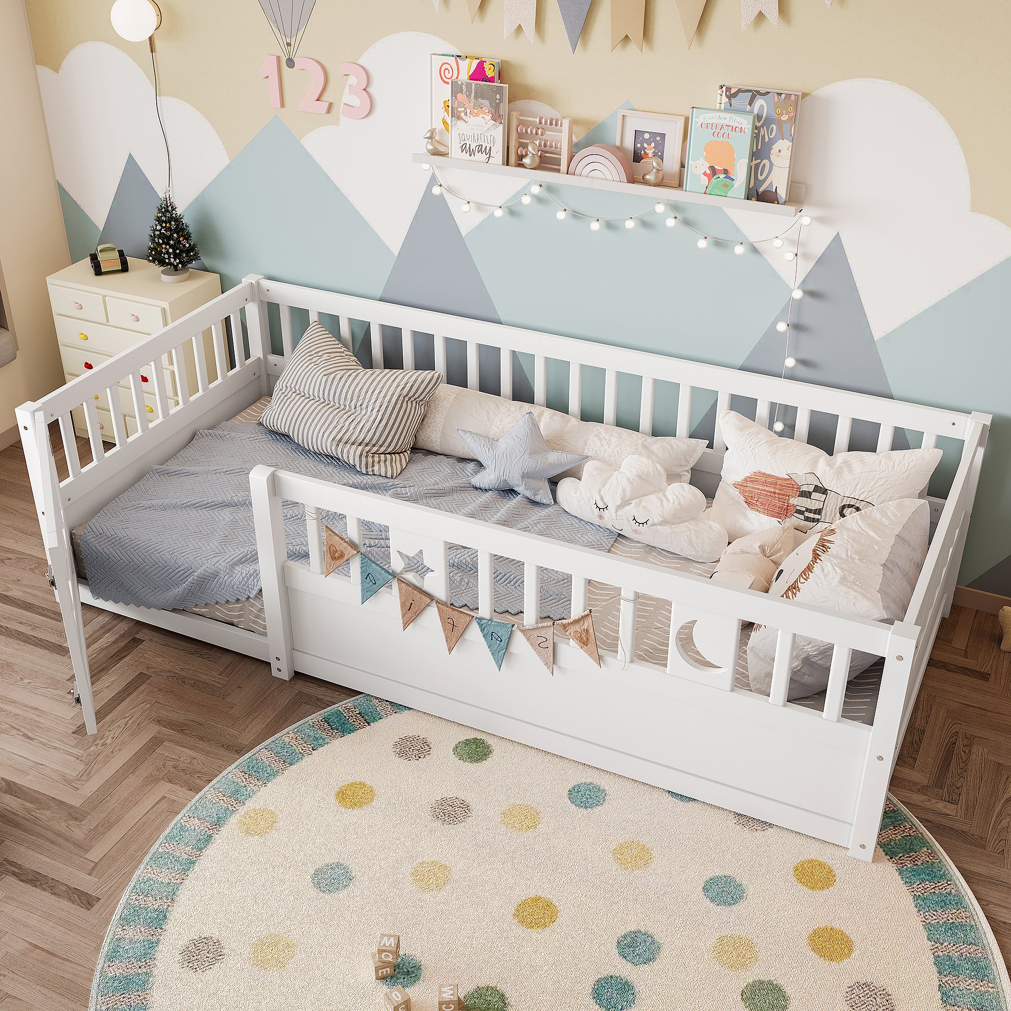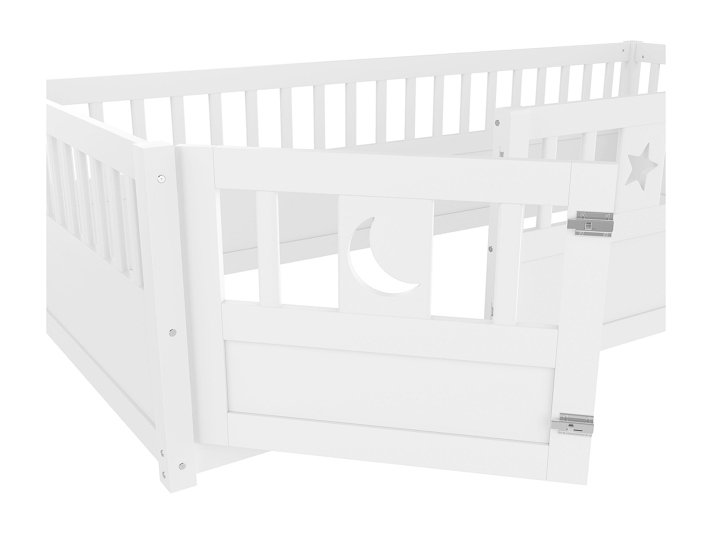 Lit enfant blanc 90x190cm avec barrière de sécurité, décor motif étoiles et lune, sans sommier (sans matelas)