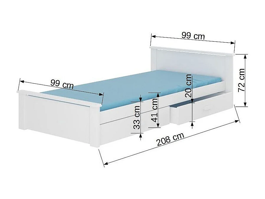 Lit enfant bois pin blanc 90x200 avec 2 tiroirs de rangement Lydia