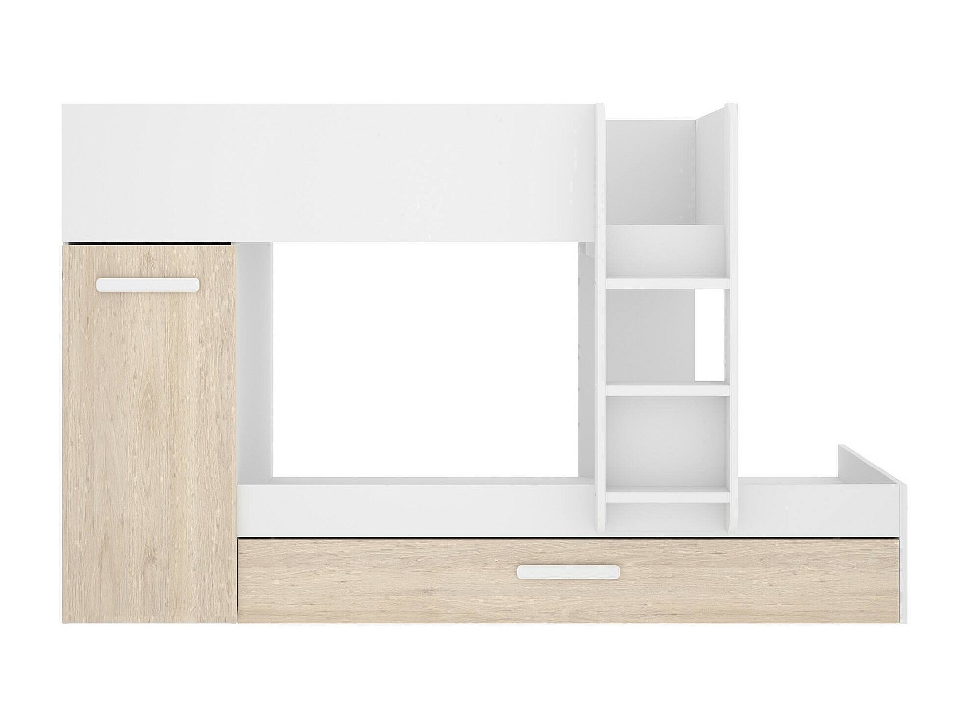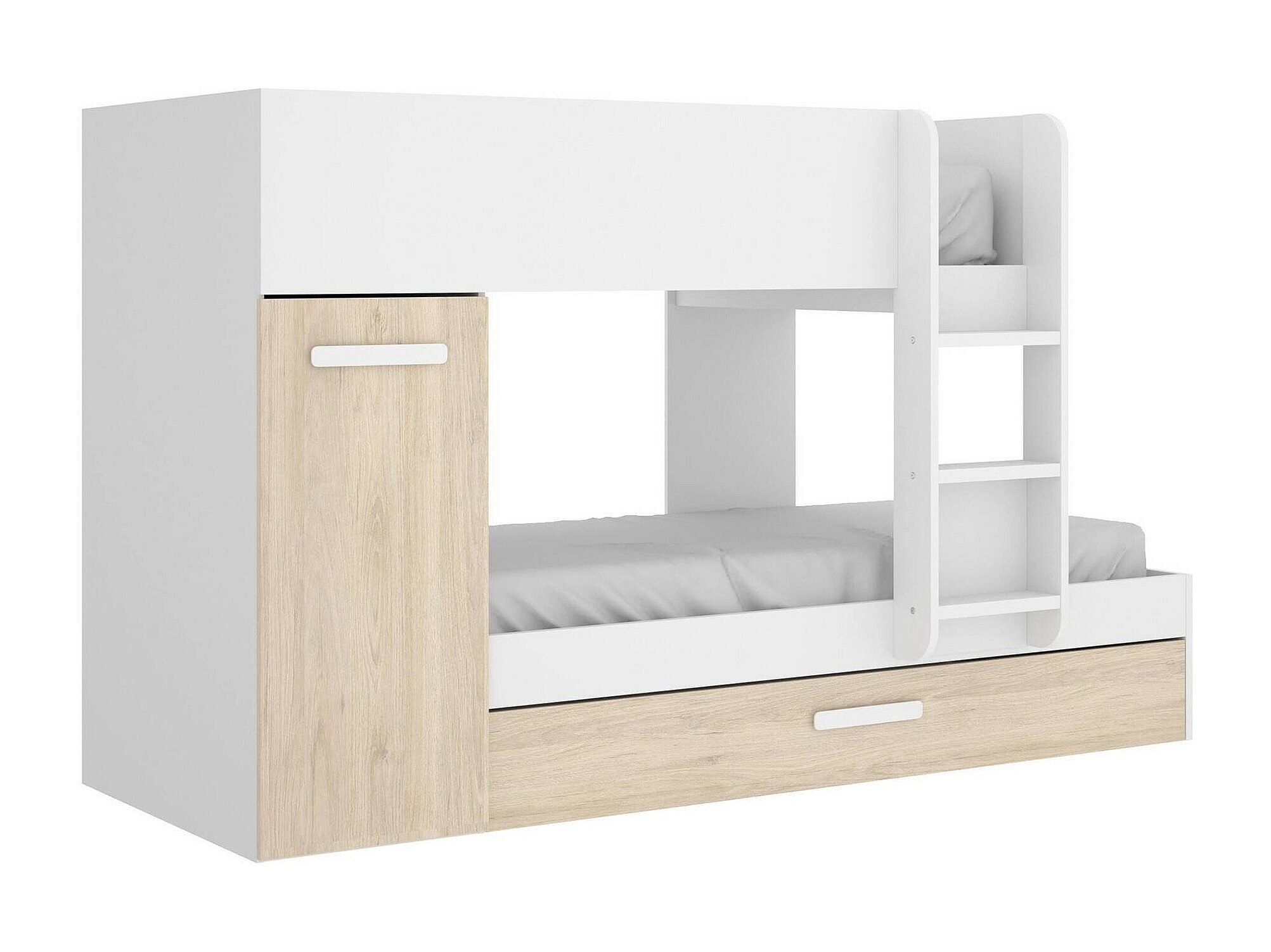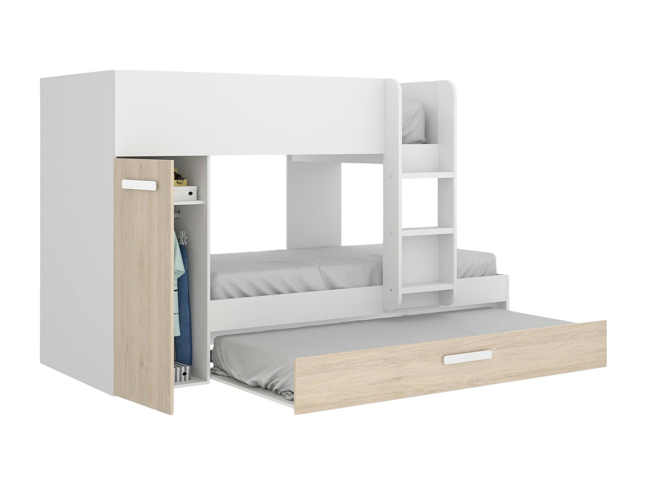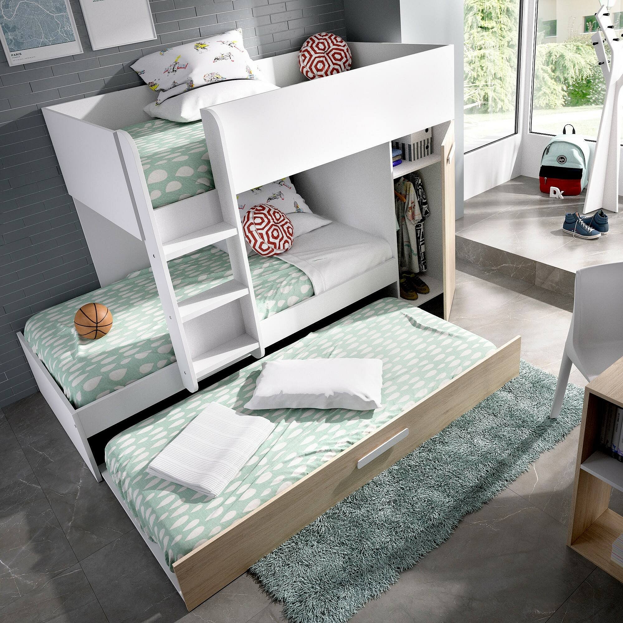 Lit enfant Eiger, Chambre complète avec armoire et tiroir, Composition de lits superposés avec deux lits simples, 244x112h150 cm, Chêne et Blanc