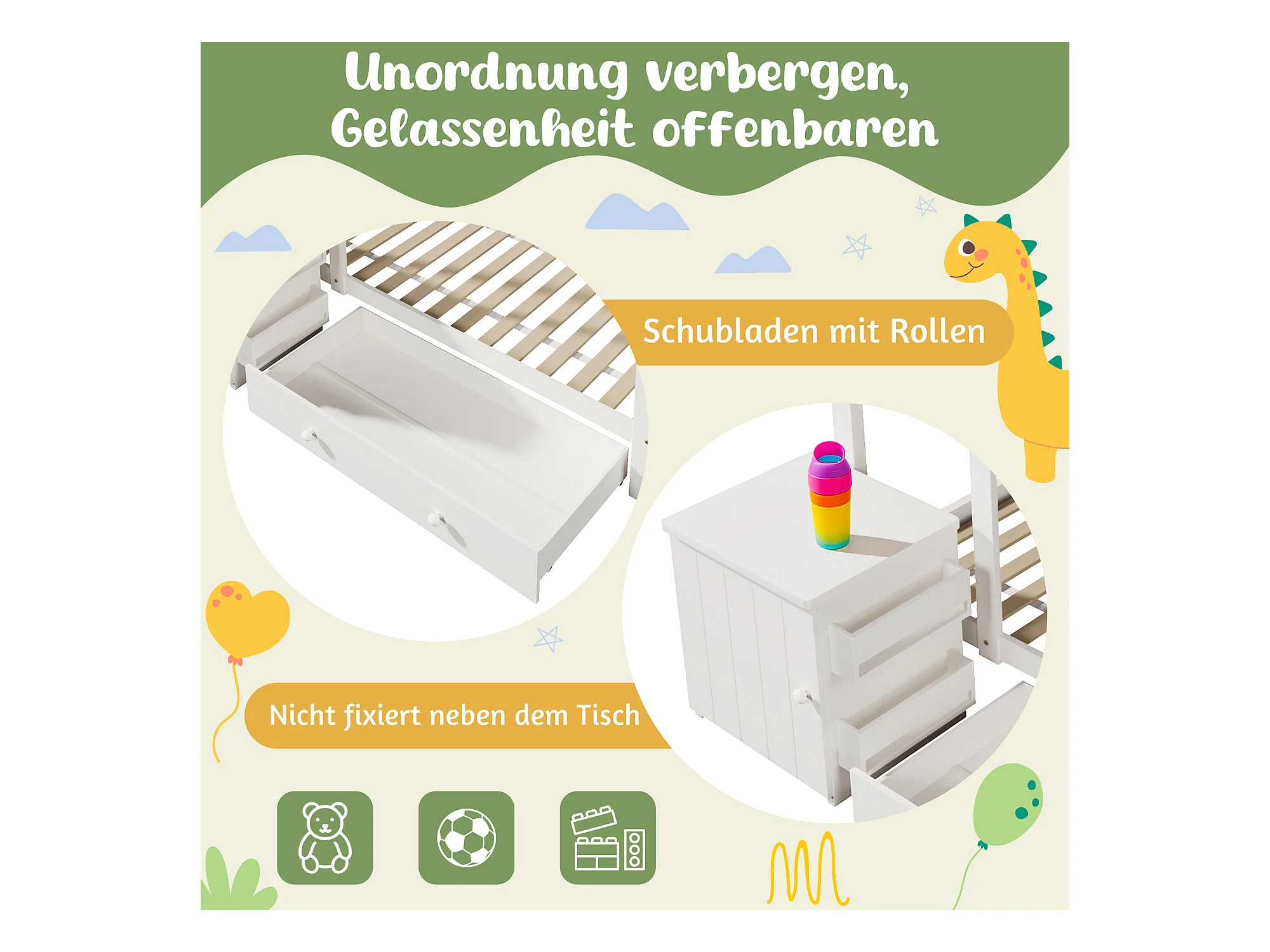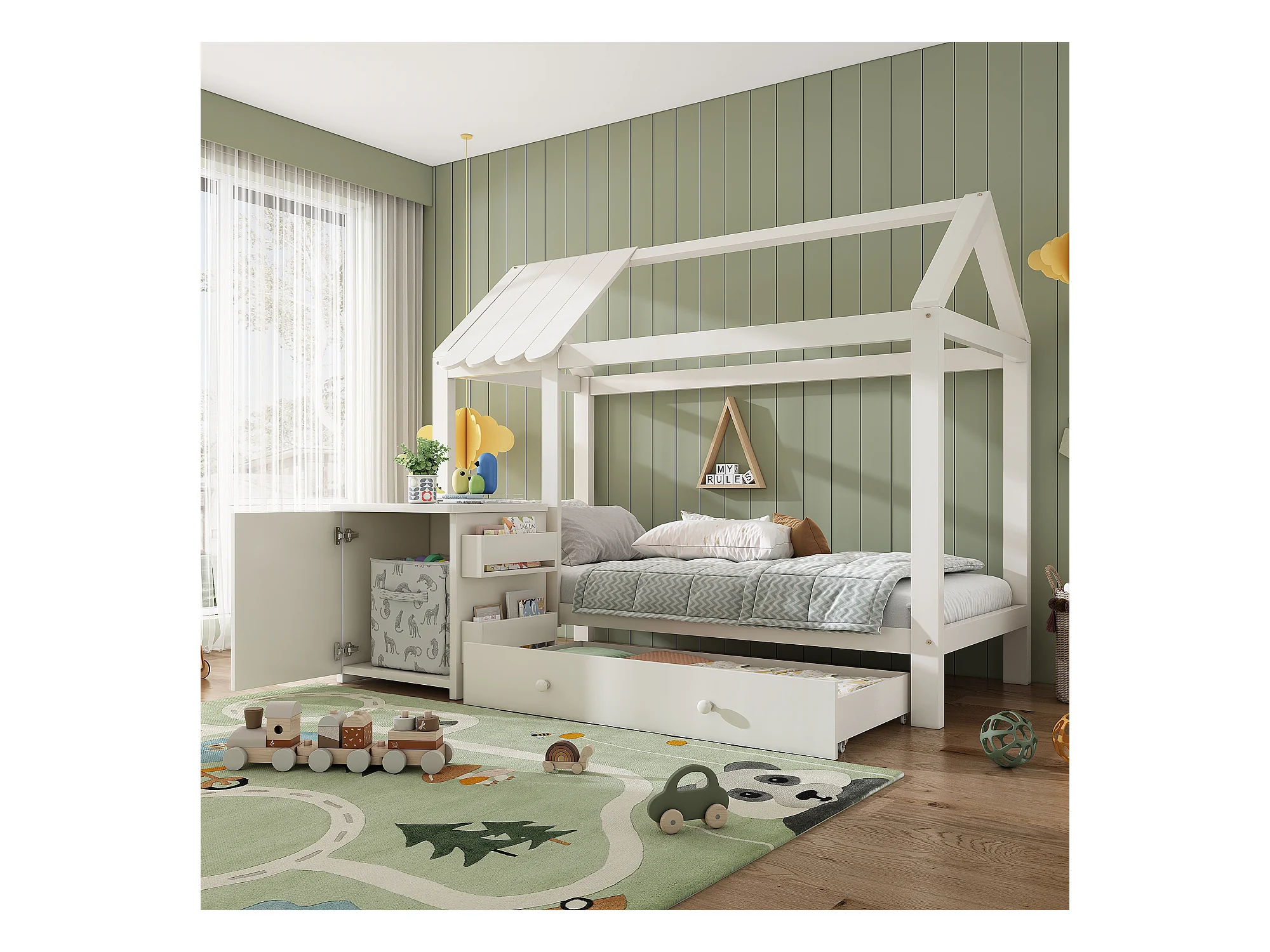 Lit enfant en forme de maison 90x200 cm, cadre en bois avec tiroirs et table de nuit amovible, blanc (162x205x176 cm)