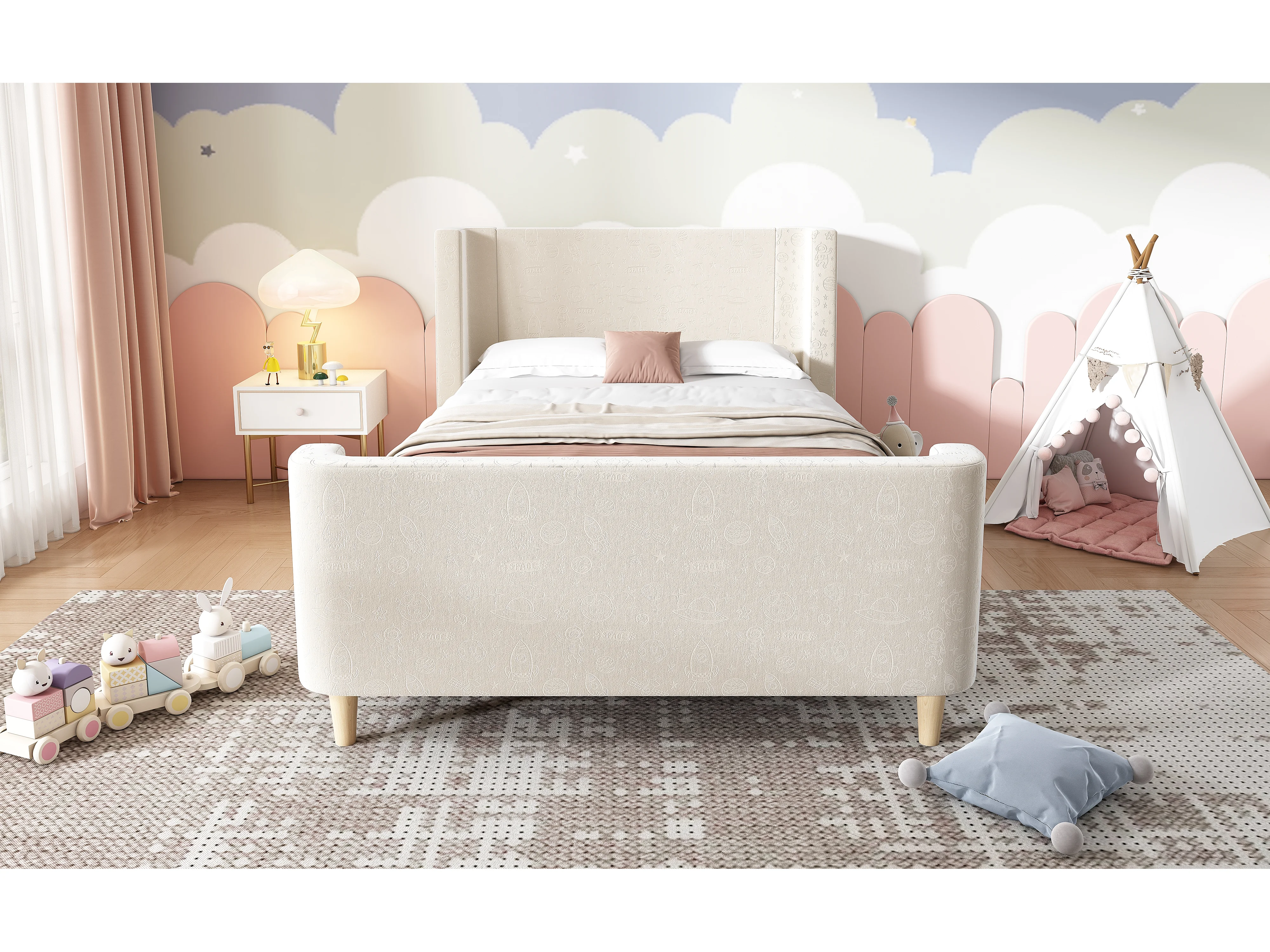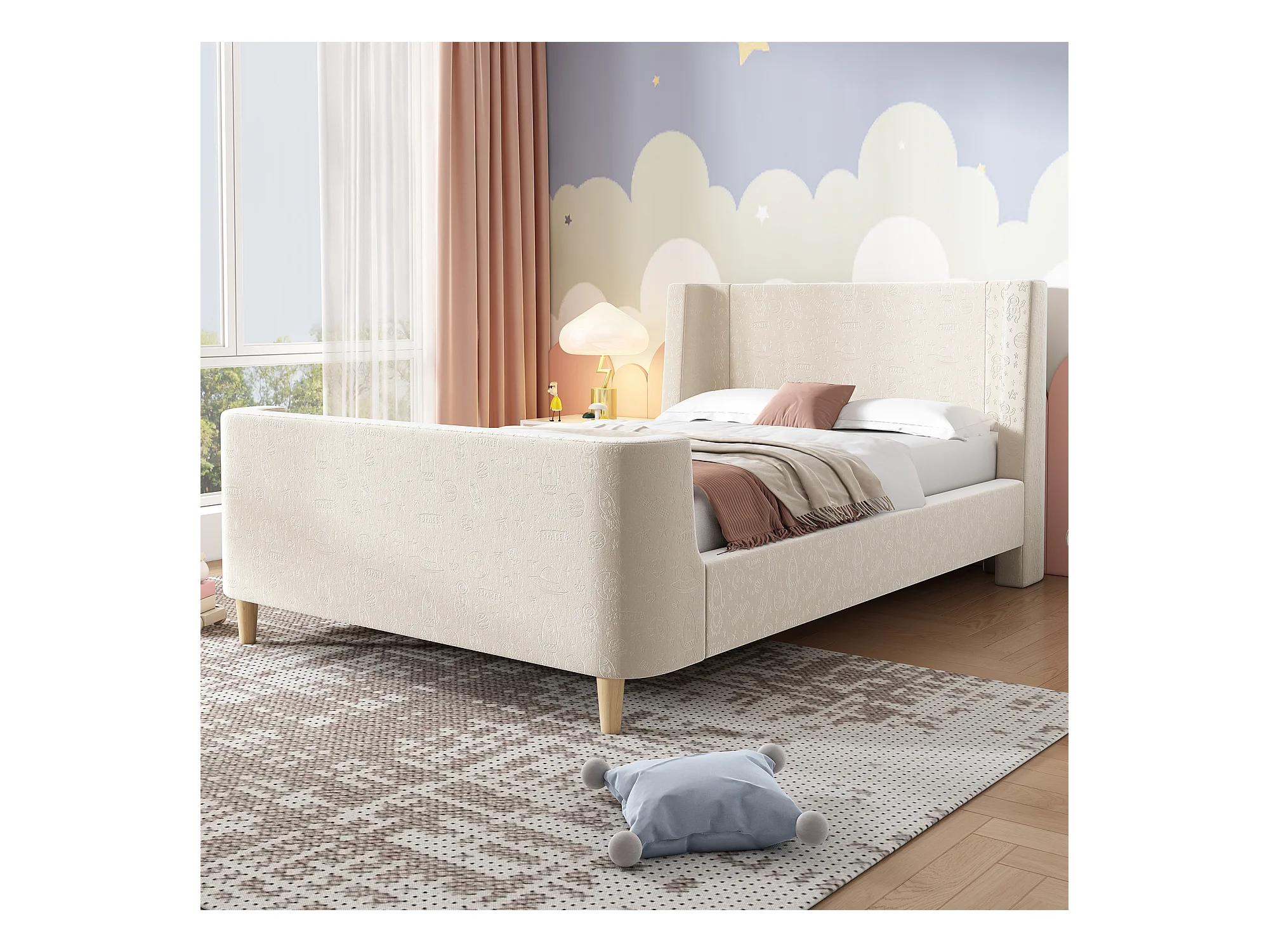 Lit enfant en velours beige, lit à bascule 90 x 200 cm avec motifs spatiaux, pour garçons et filles