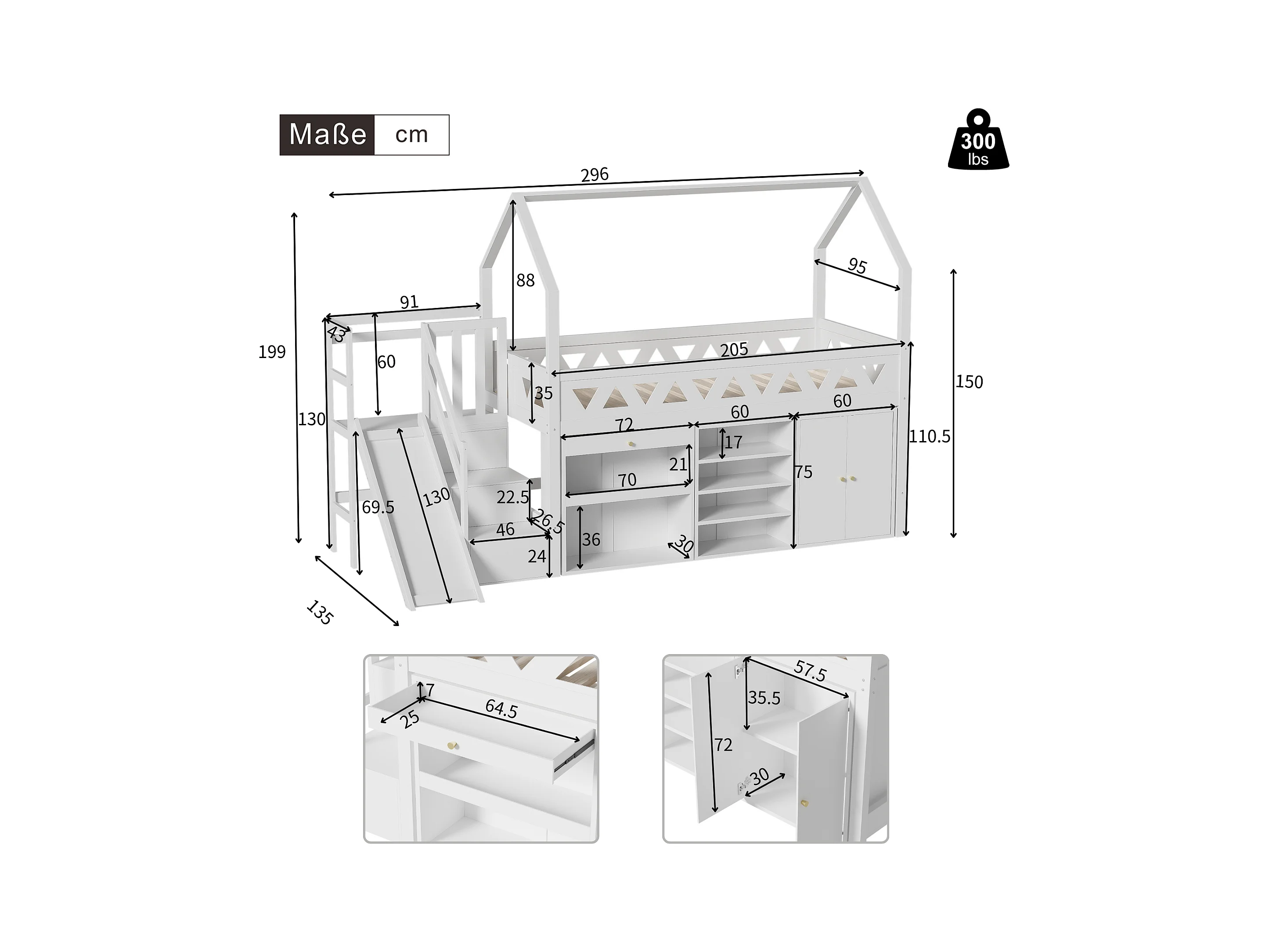 Lit Enfant Multifonction avec Rangement, Échelle, Toboggan, Magnétique, Bois Massif, Blanc (90x200 cm)