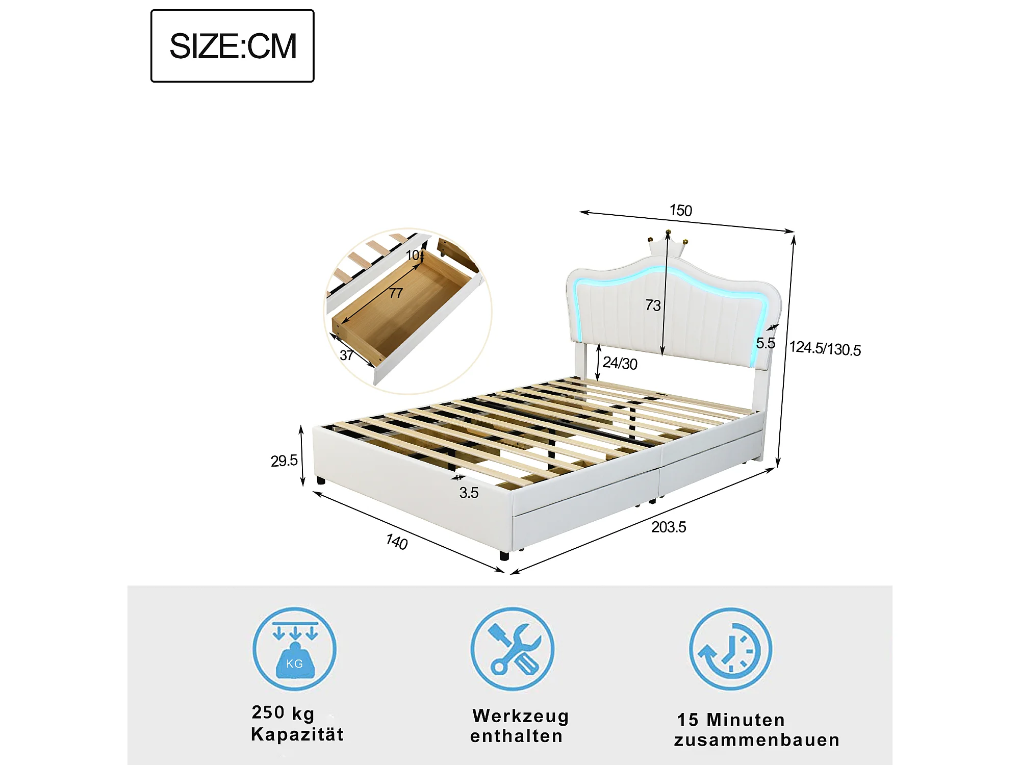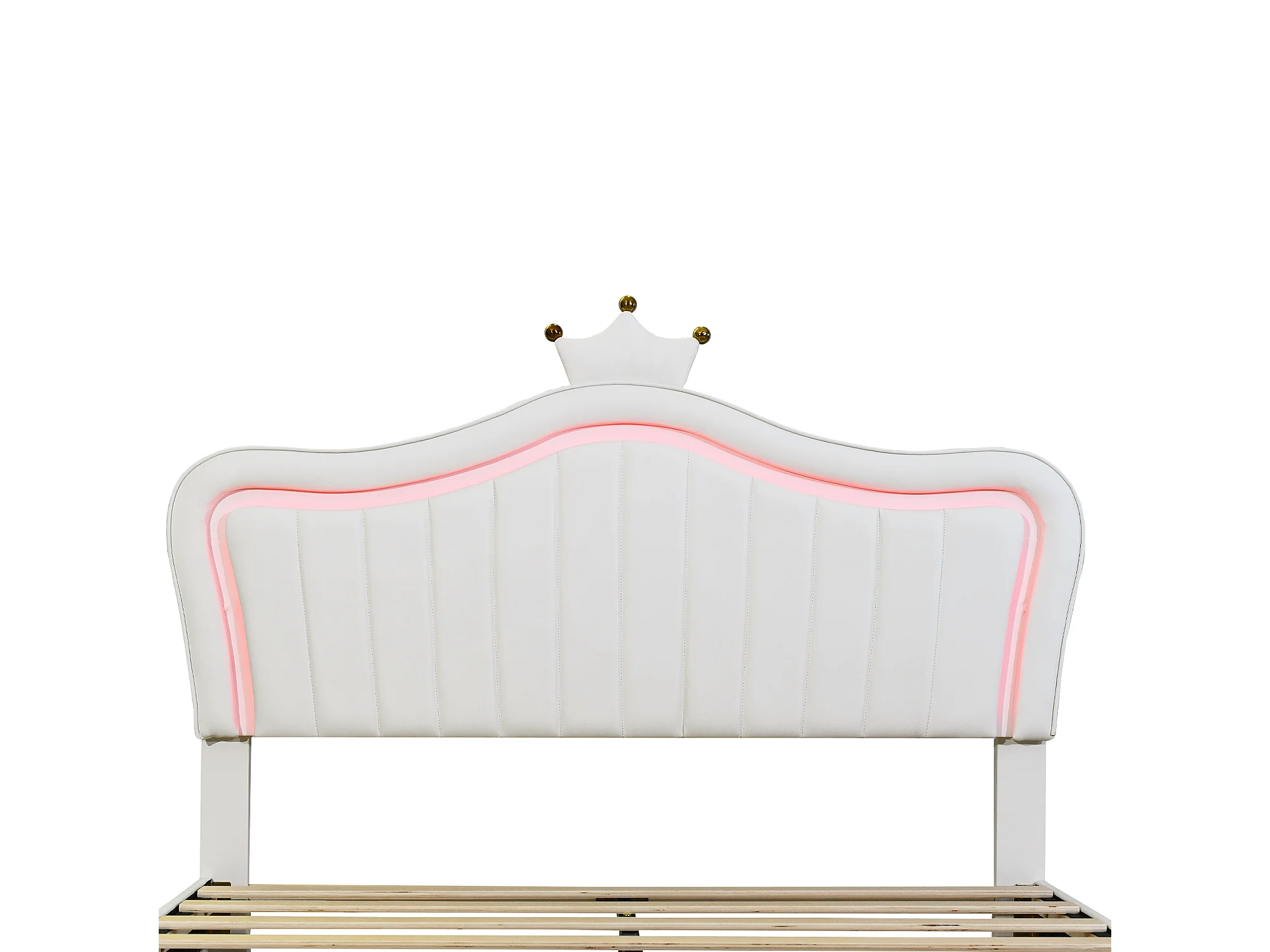 Lit enfant rembourré 140x200 cm, lit fille couronne blanche, PU cuir, tiroirs, LED et sommier inclus