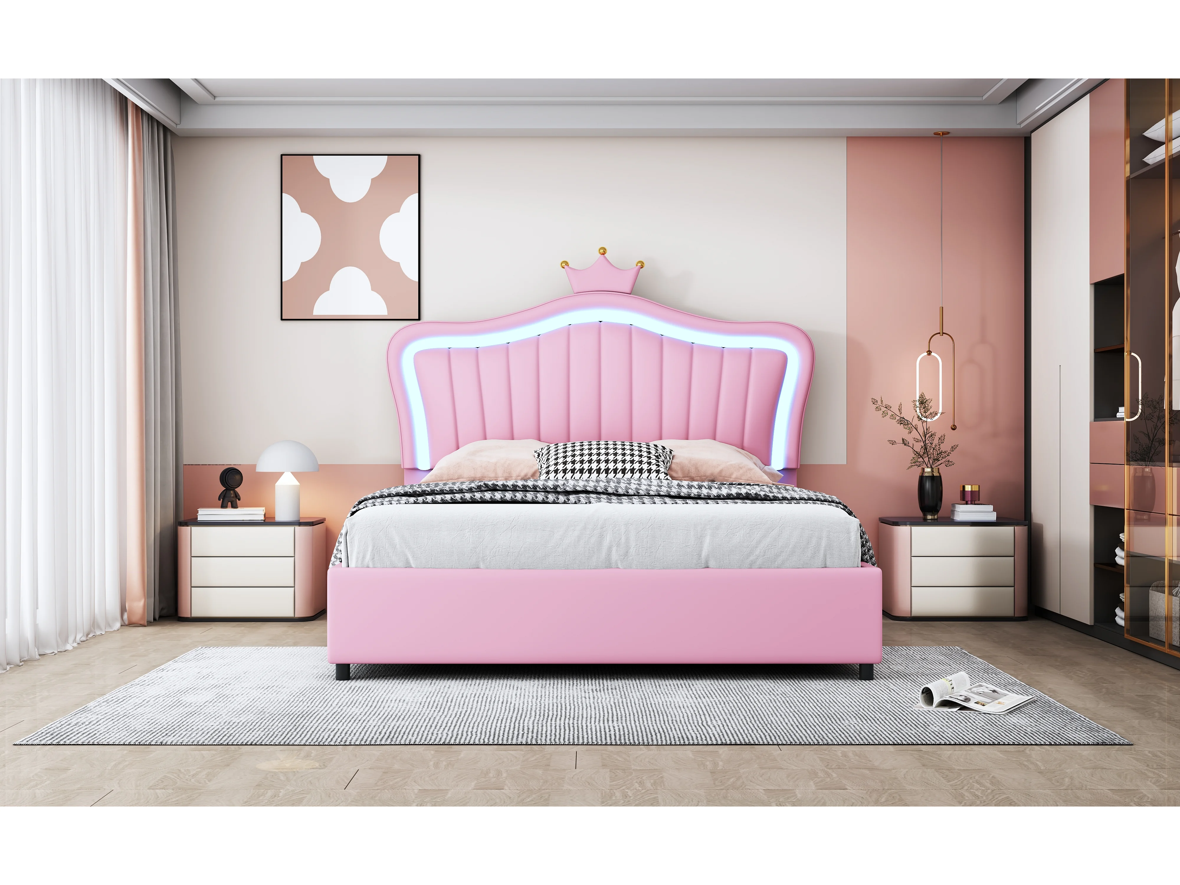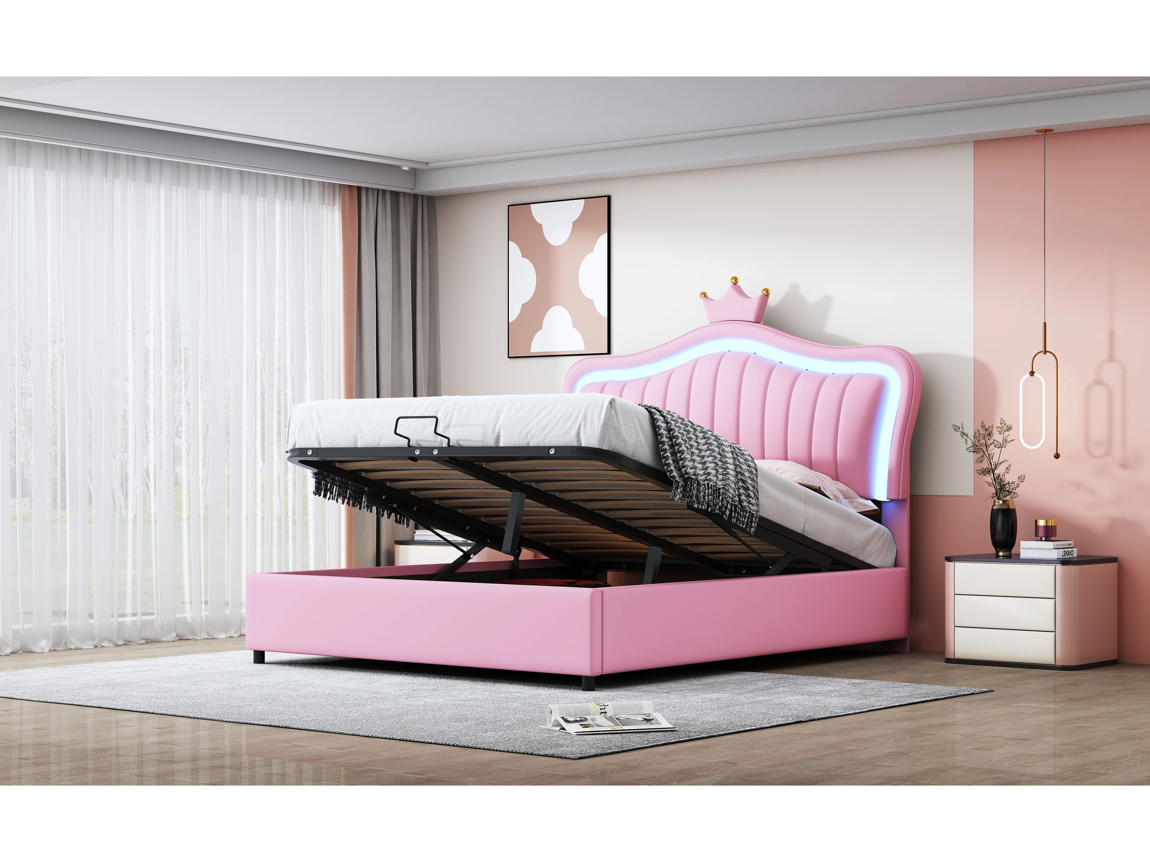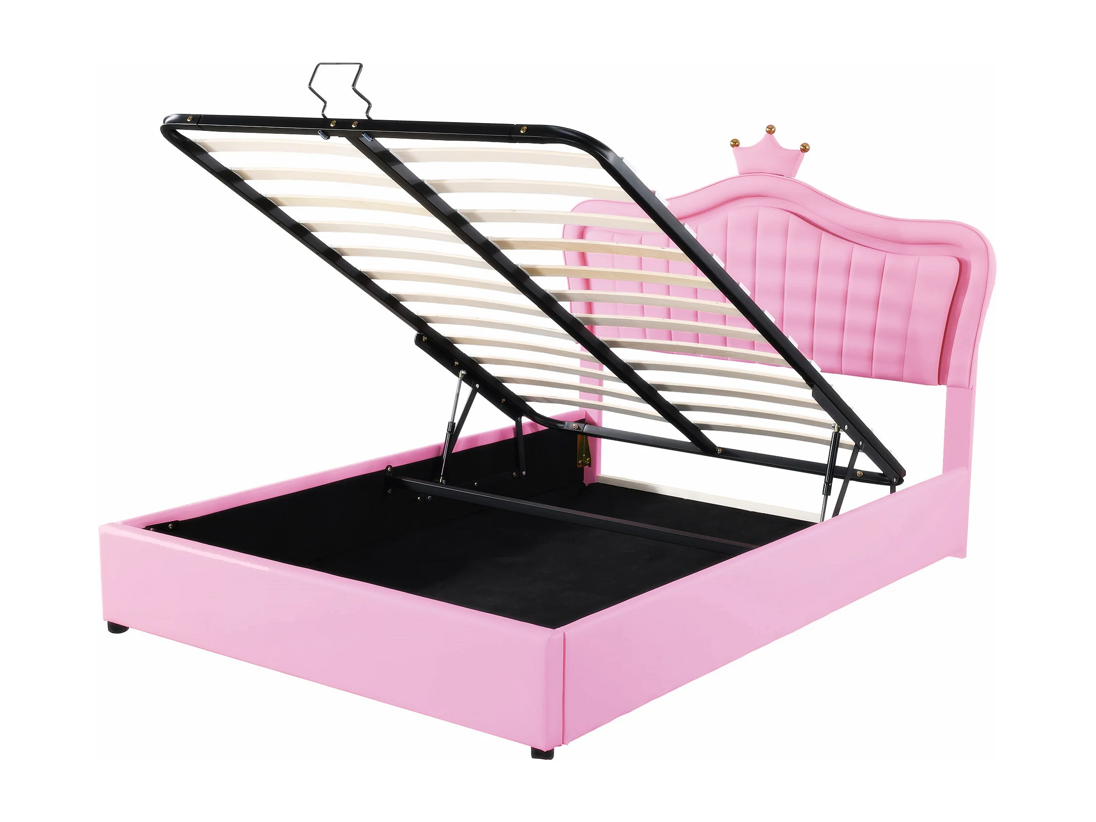 Lit enfant rembourré 140x200 cm, lit fille couronne rose avec rangement hydraulique, PU cuir, LED et sommier