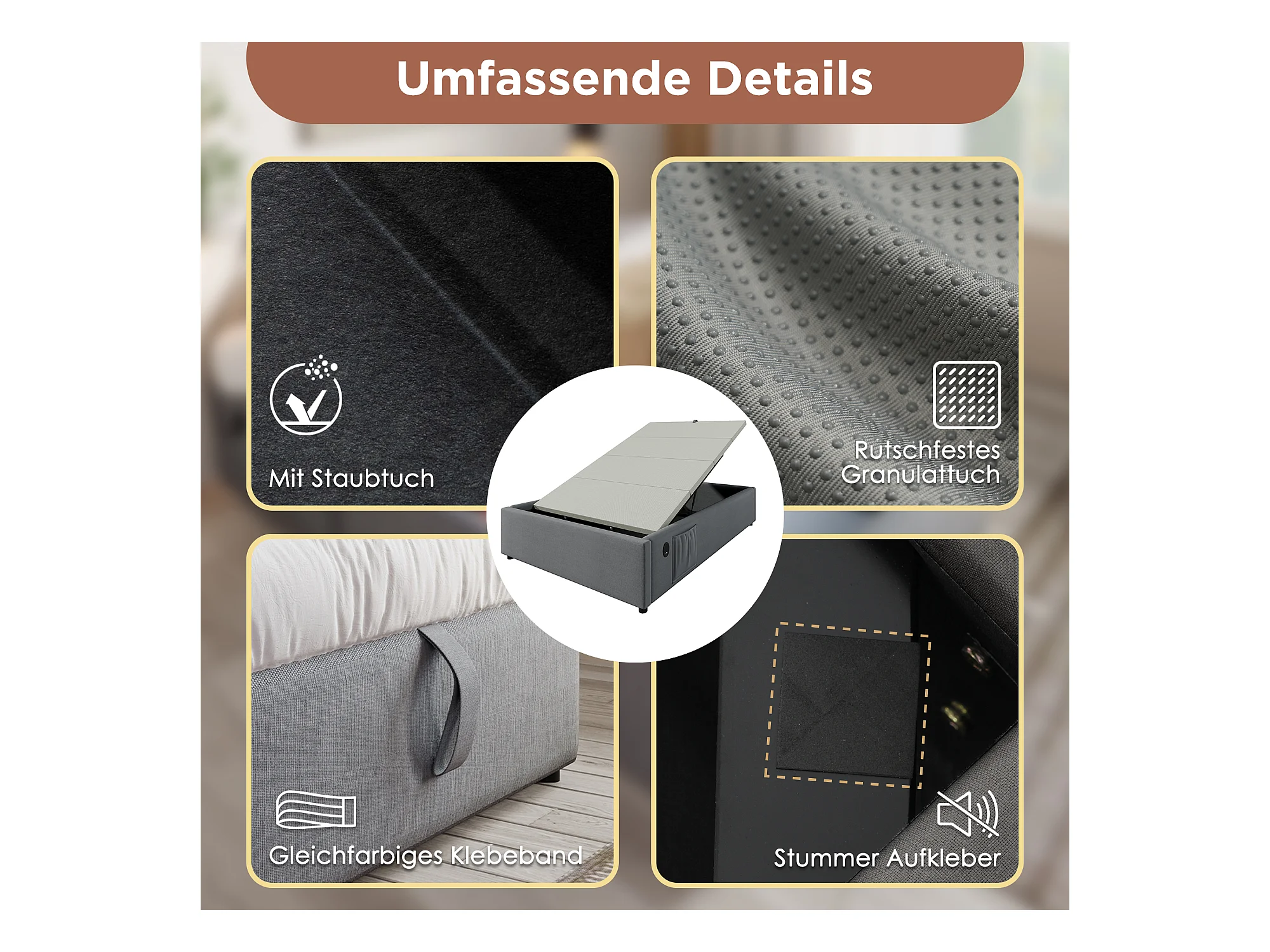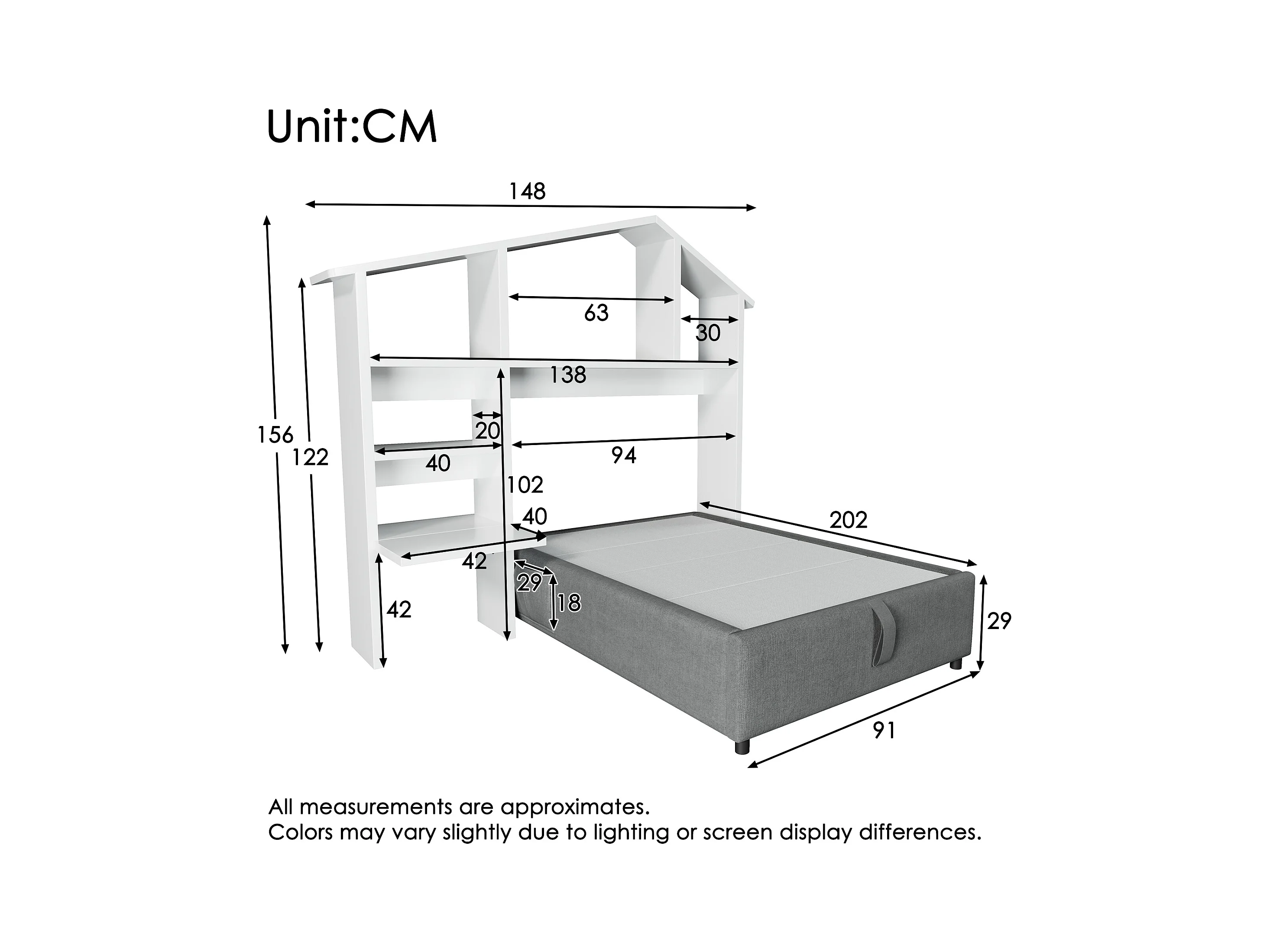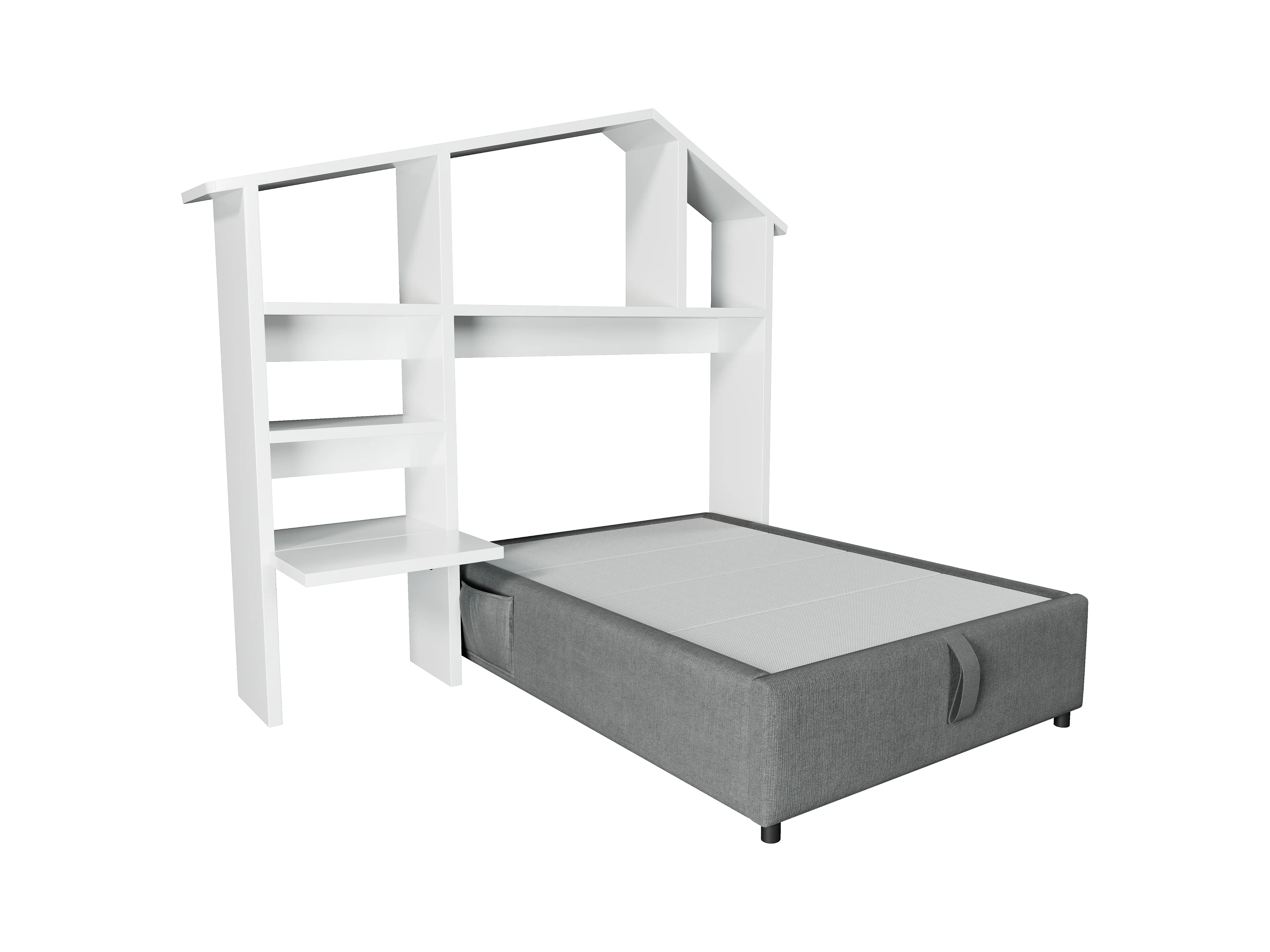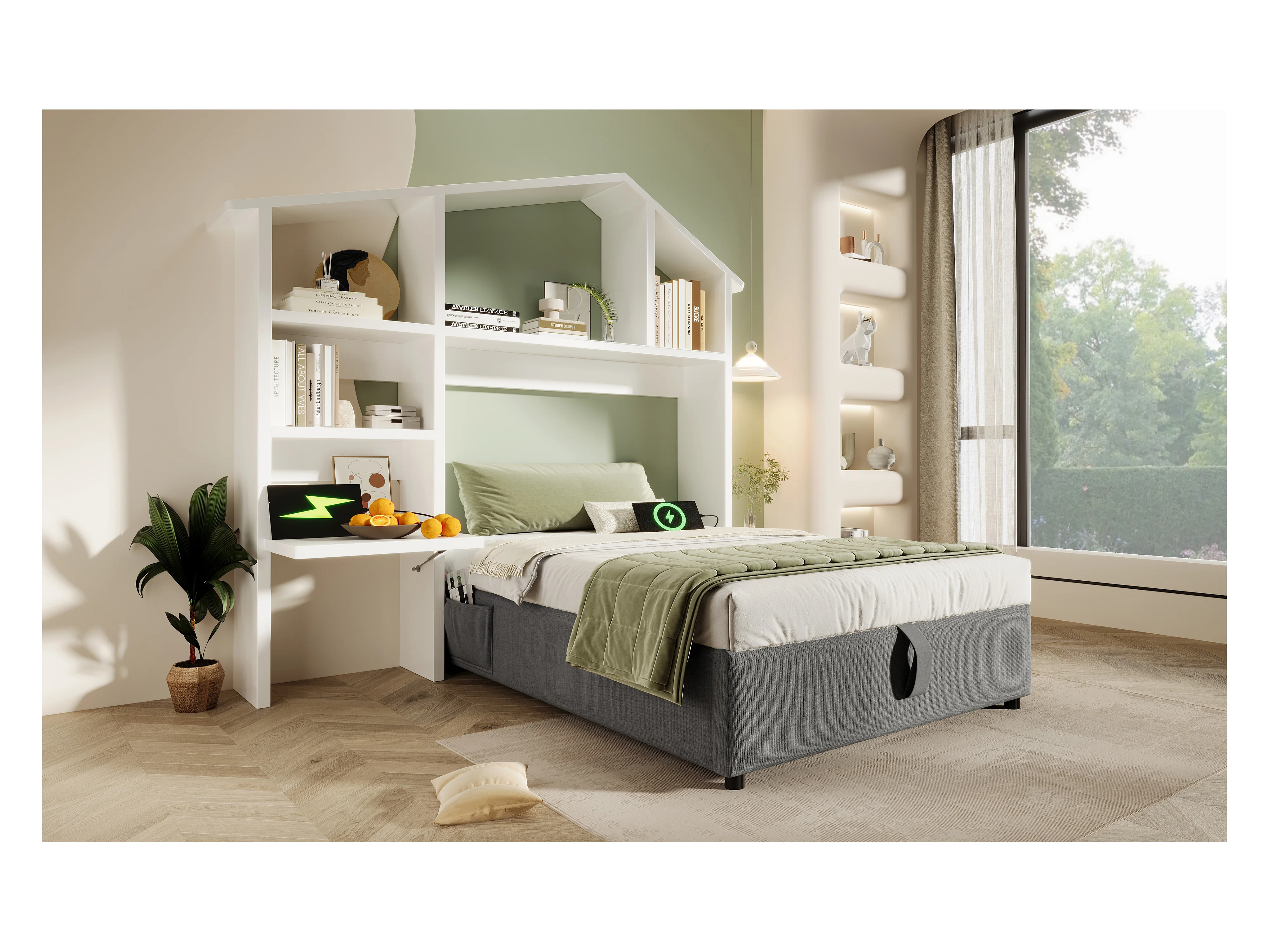 Lit enfant rembourré - 90 x 200 cm - avec bibliothèque + rangement hydraulique + USB - lin + bois - gris