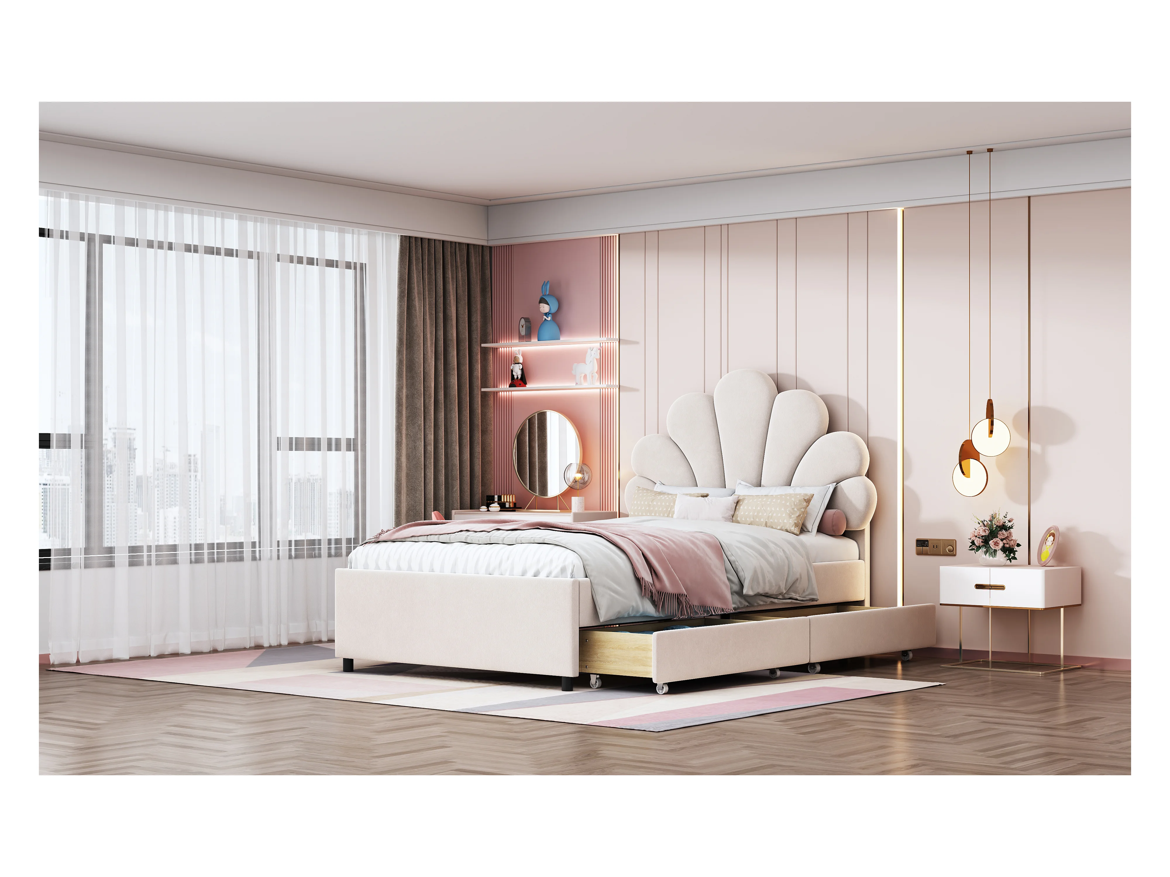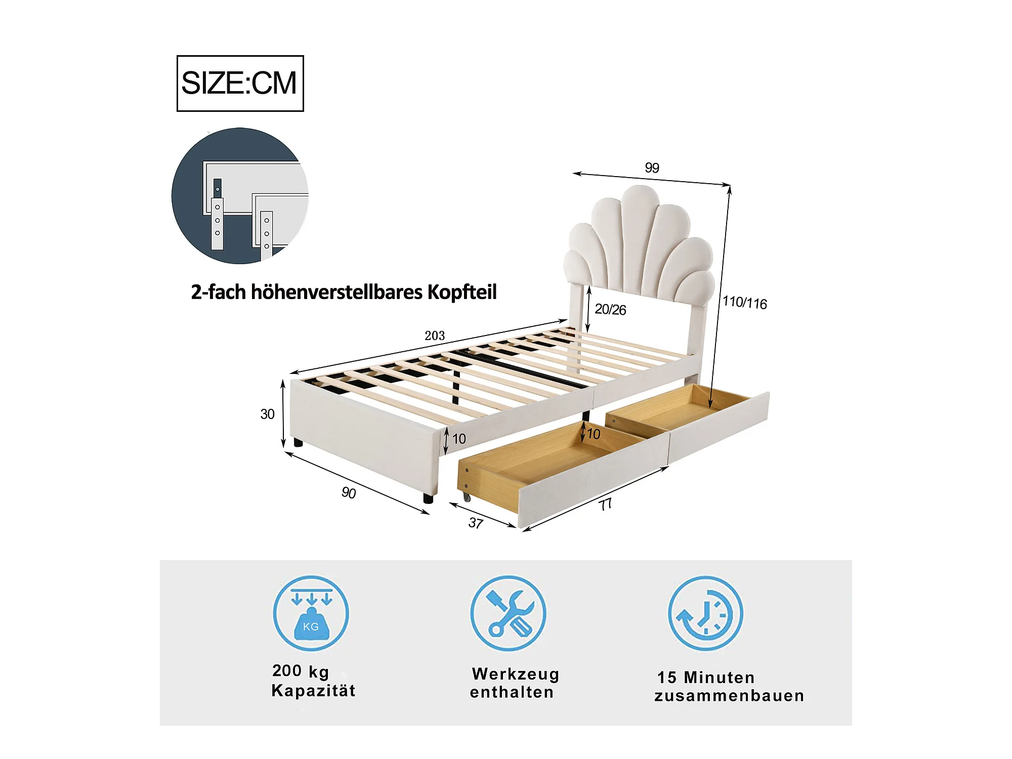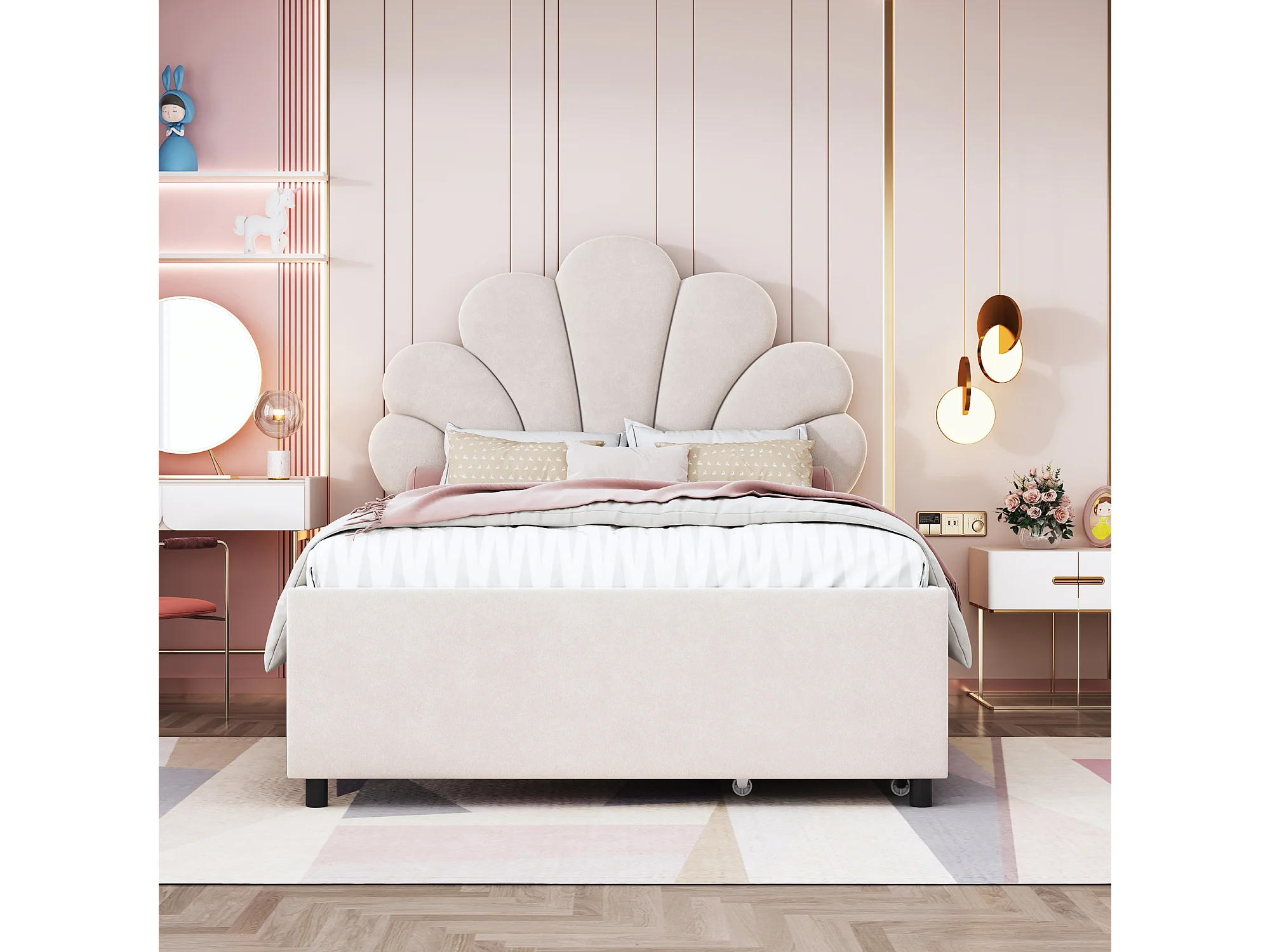 Lit enfant rembourré 90x200 cm, cadre avec tête fleurie, sommier, 2 rangements, velours beige, lit fille