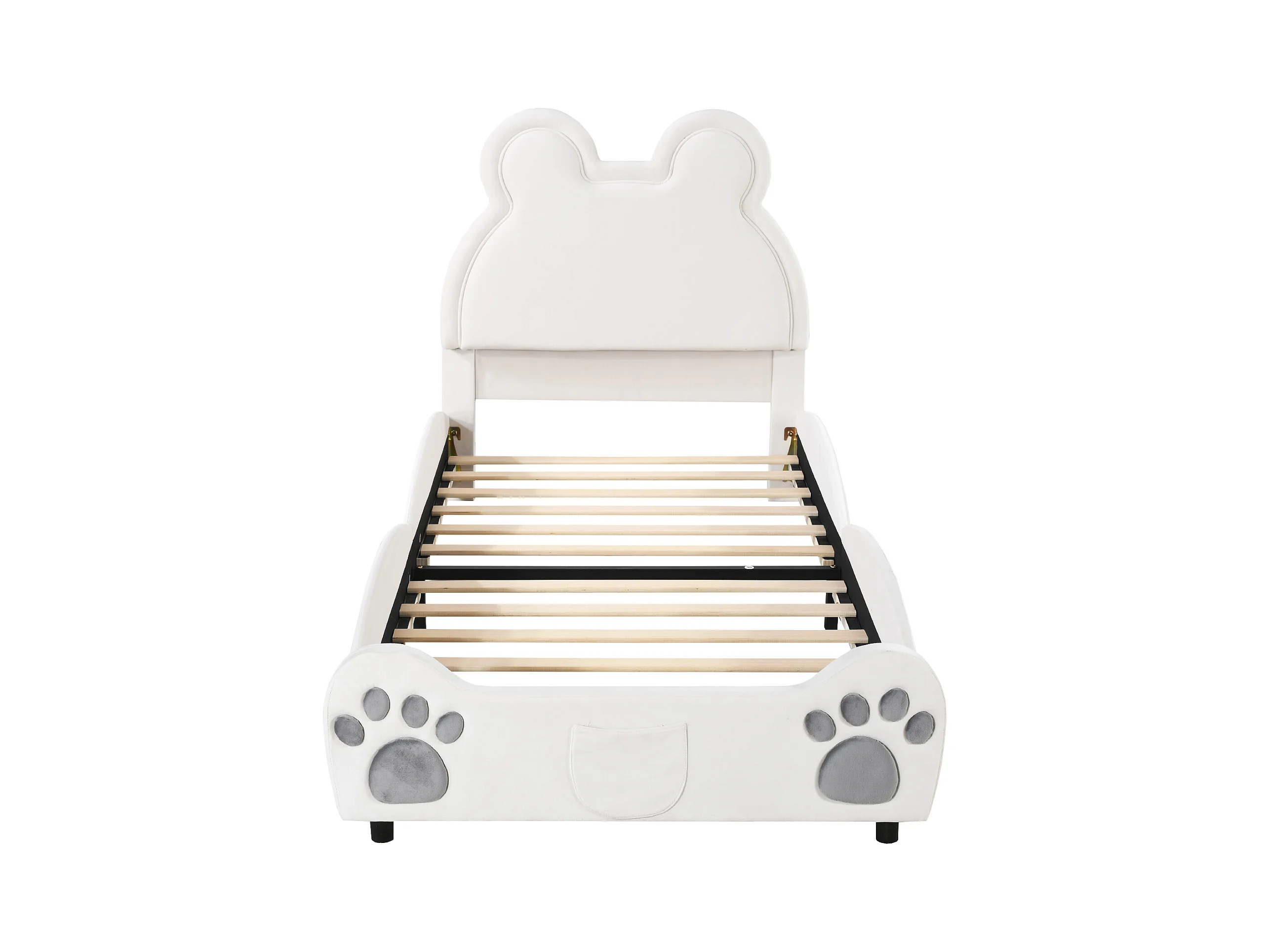 Lit enfant tapissé forme ours, velours gris, confortable et ludique (210x90x103 cm)