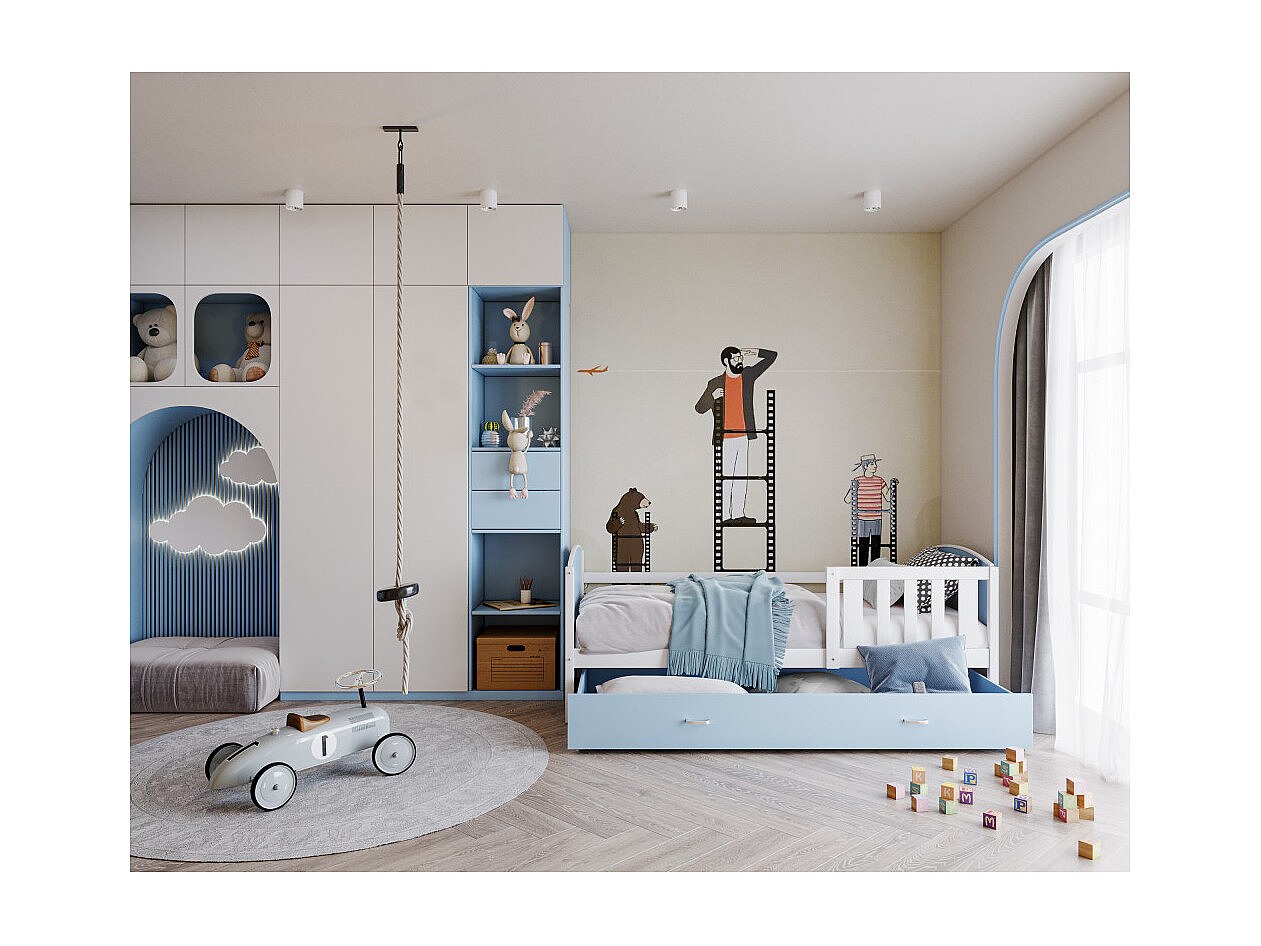 Lit Enfant Tomy 90x190 Blanc - bleu Livré avec sommiers, tiroir et matelas en mousse de 7cm