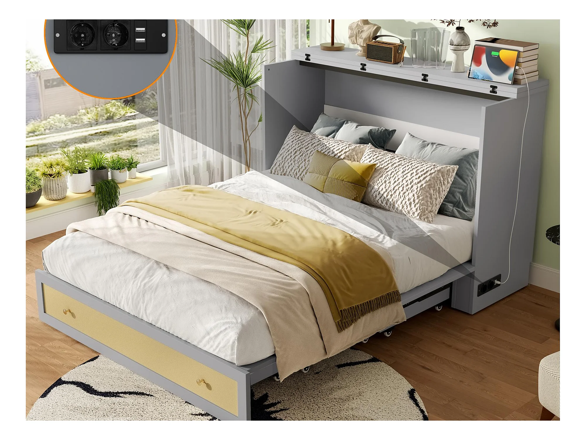 Lit escamotable 140 x 200 cm - avec prise USB et prise secteur - Gris (matelas non inclus)