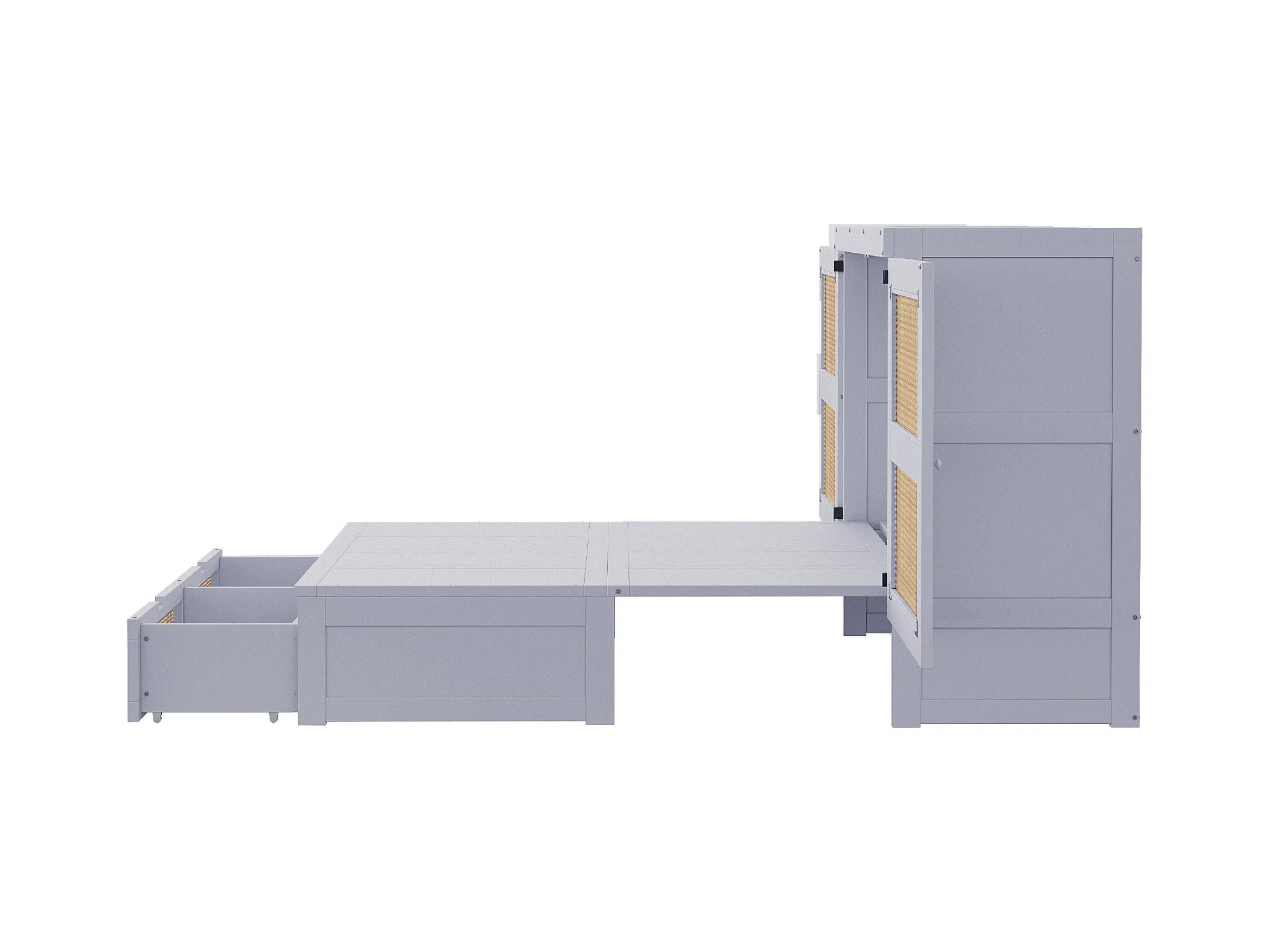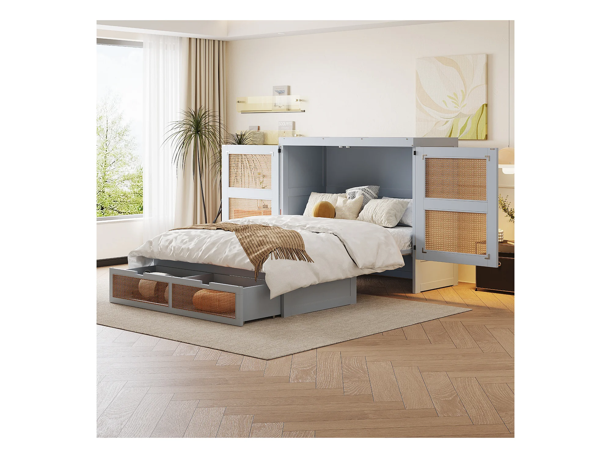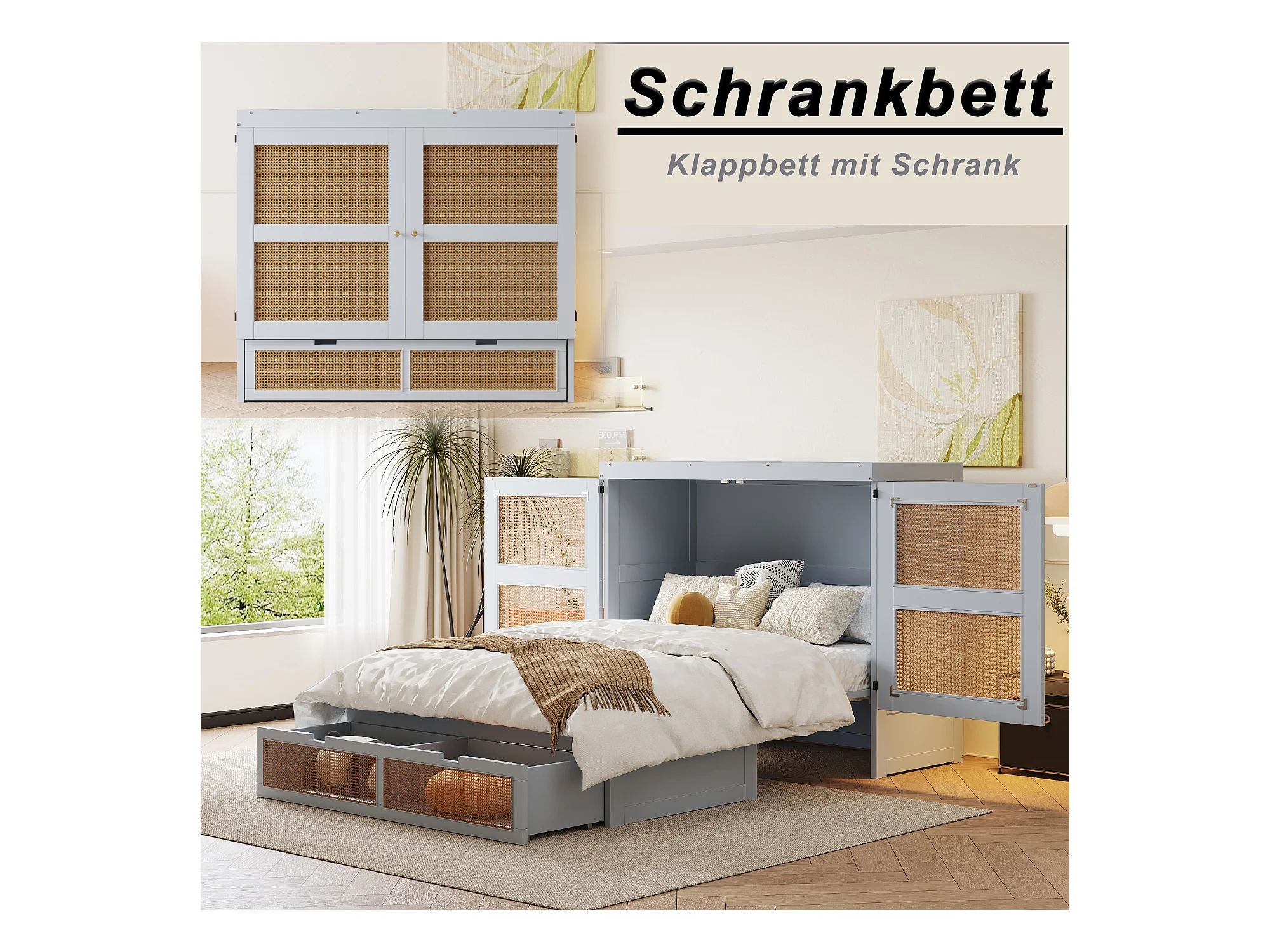 Lit escamotable 140x200 cm, avec sommier à lattes, design en rotin, avec tiroirs de rangement, bois et métal, gris (202x145.5x120 cm)
