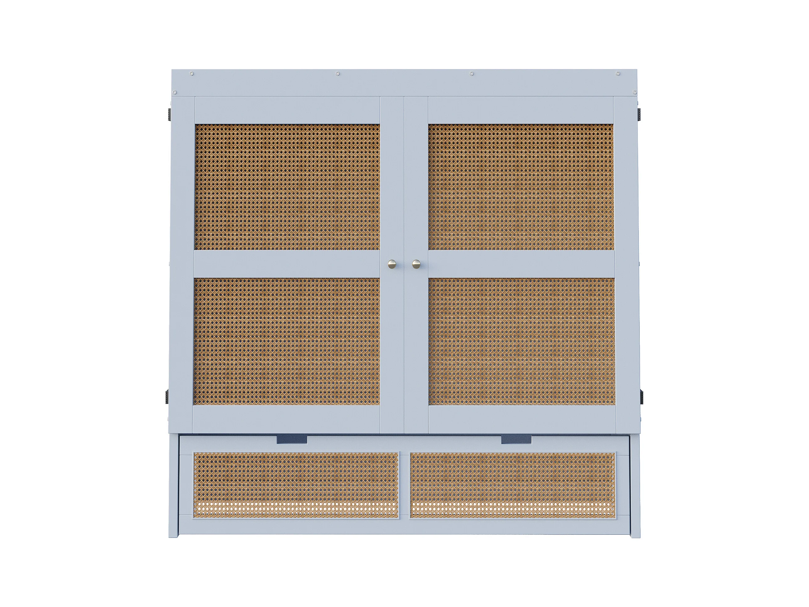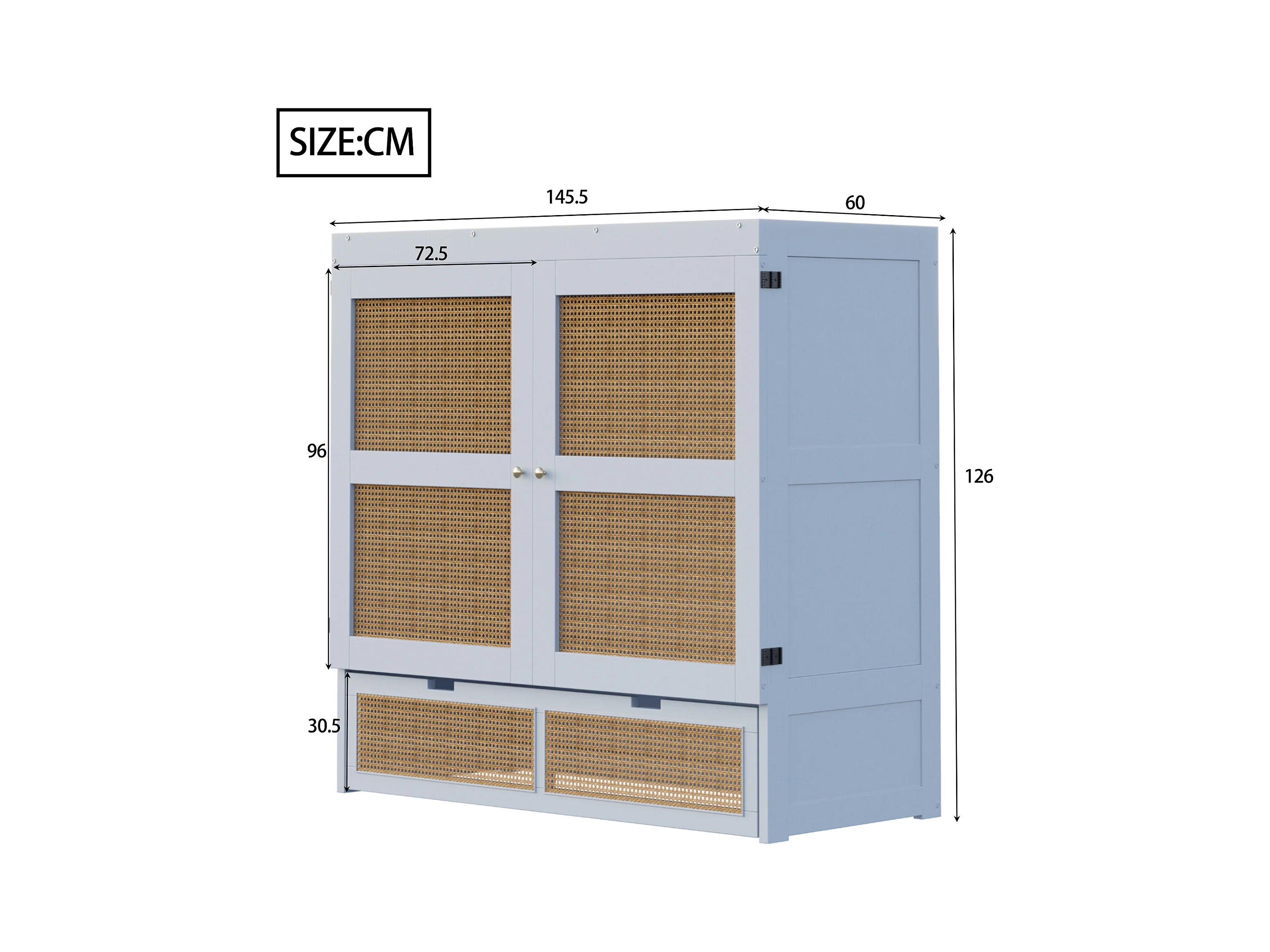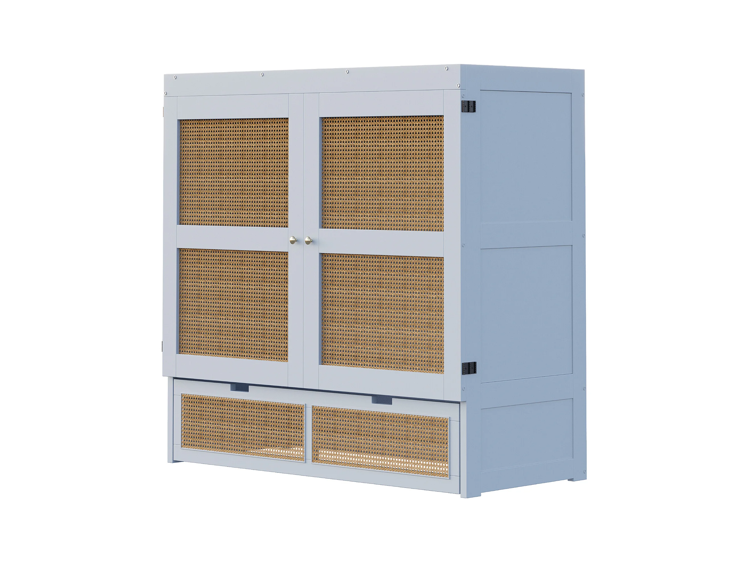 Lit escamotable 140x200 cm, avec sommier à lattes, design en rotin, avec tiroirs de rangement, bois et métal, gris (202x145.5x120 cm)