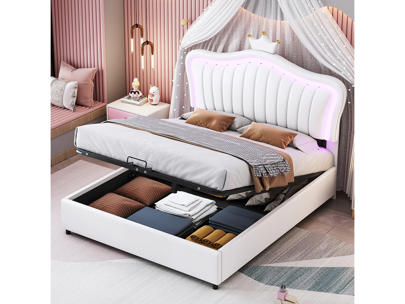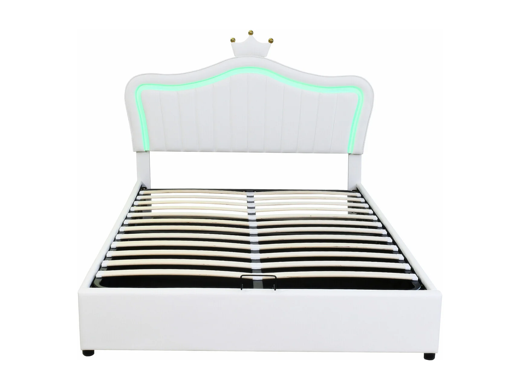 Lit fille 140x200 cm en simili cuir blanc avec LED – Tête de lit en forme de couronne, coffre de rangement hydraulique