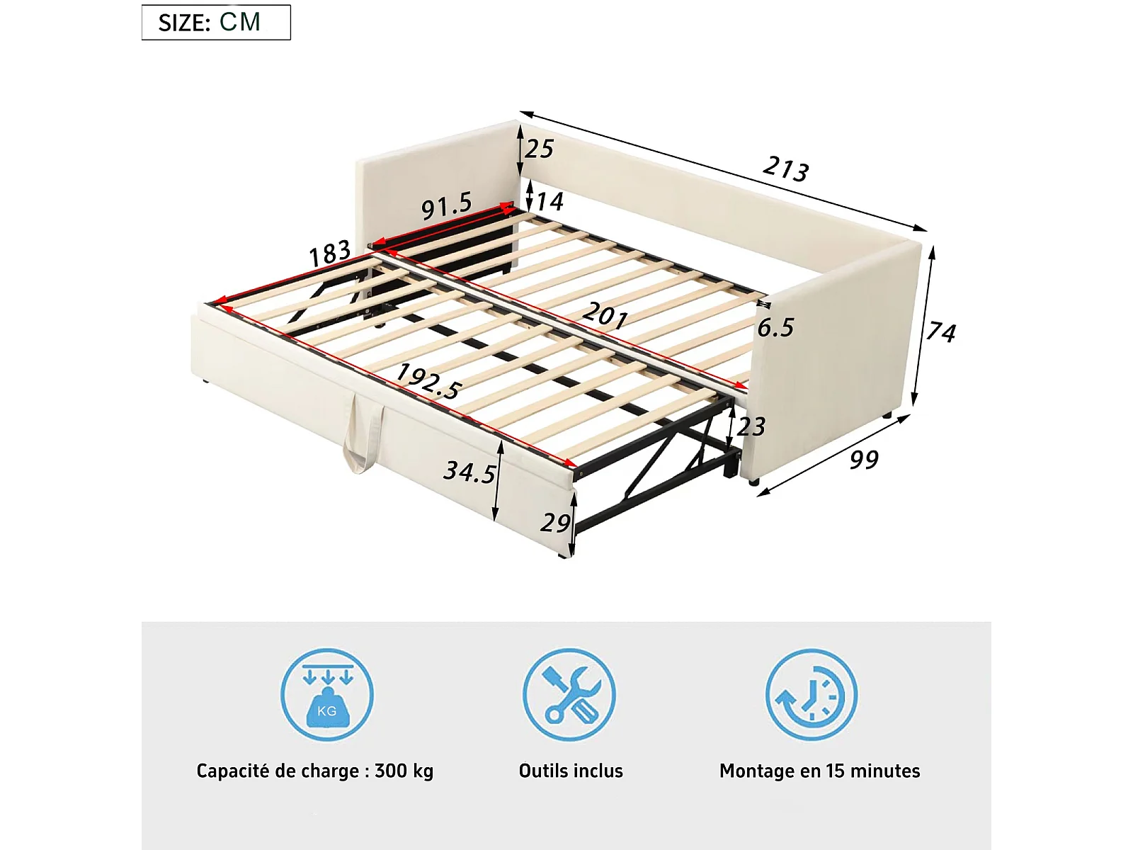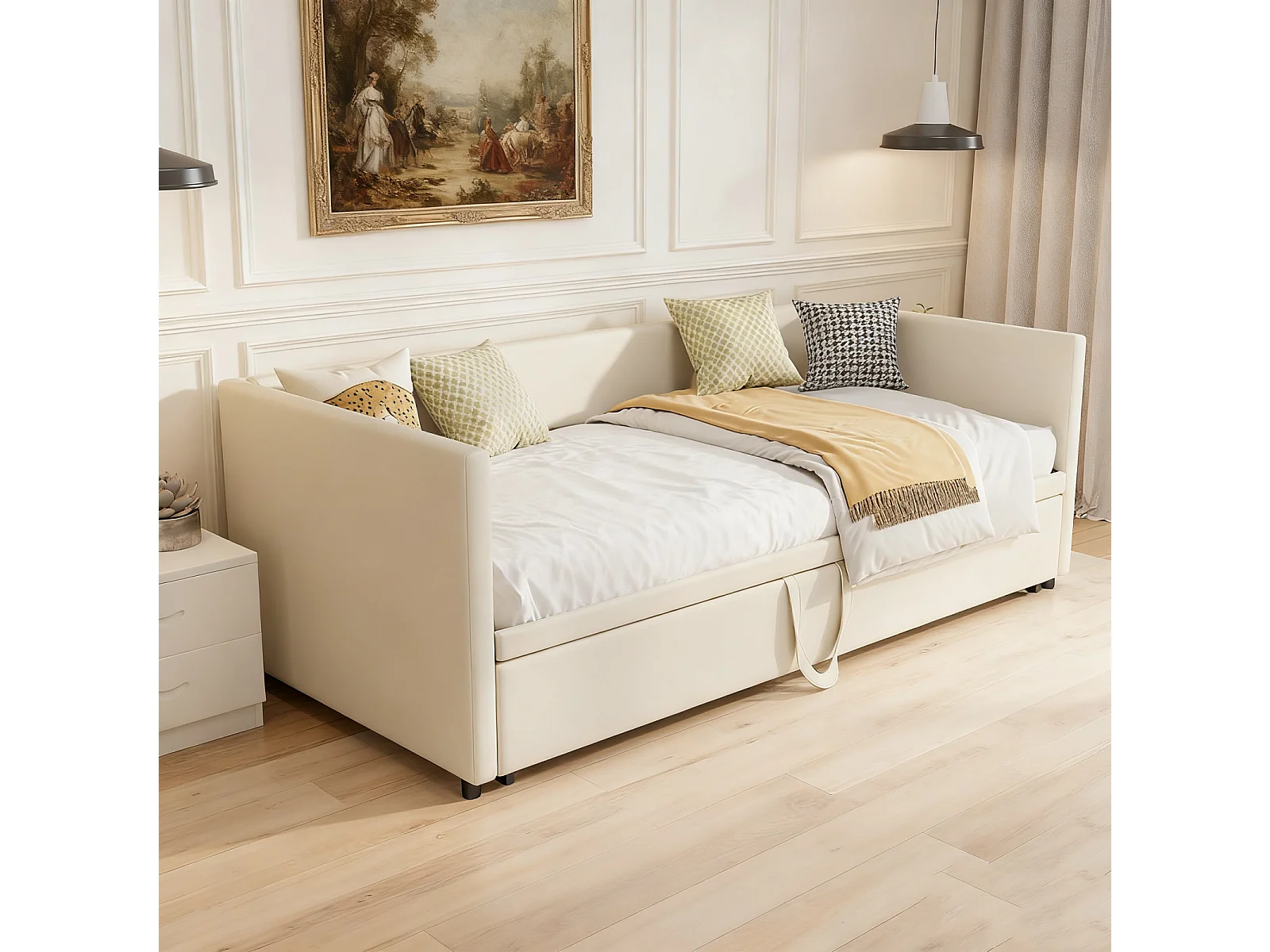 Lit gigogne 90 x 200 cm - velours - Beige - Canapé-lit extensible avec sommiers à lattes - style scandinave
