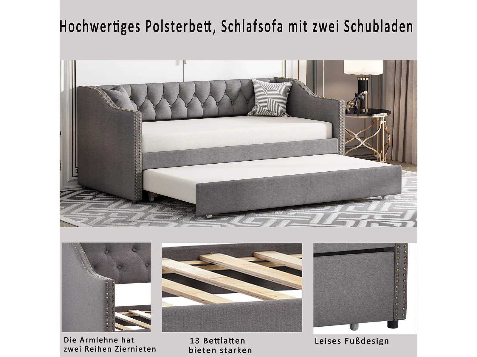 Lit gigogne 90x200 cm contemporain tapissé pour enfant et invité tissu lin résistant canapé gigogne gris