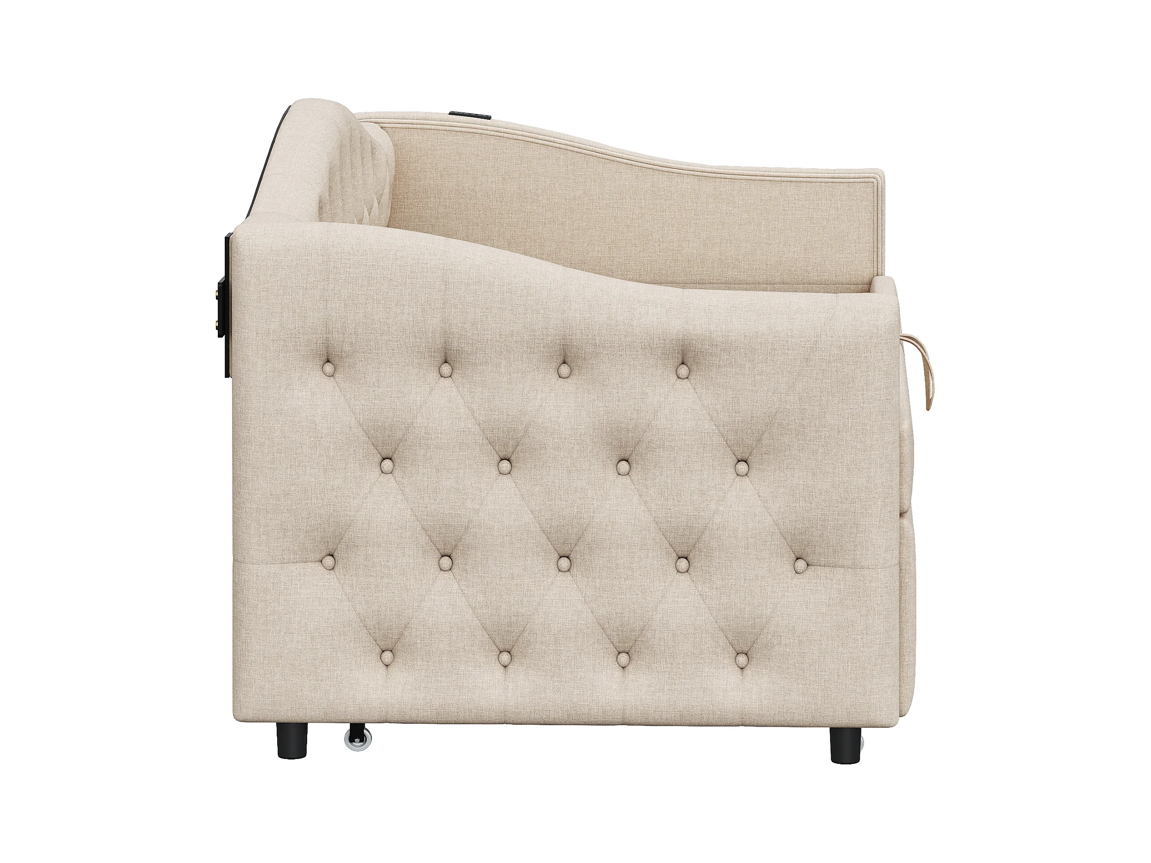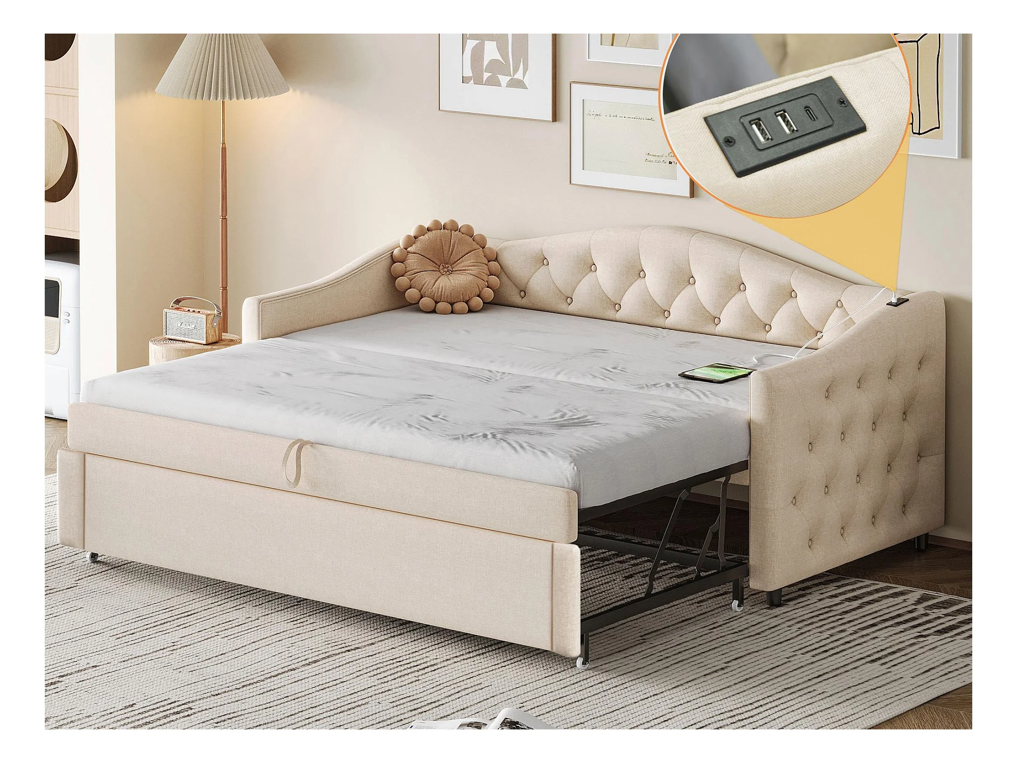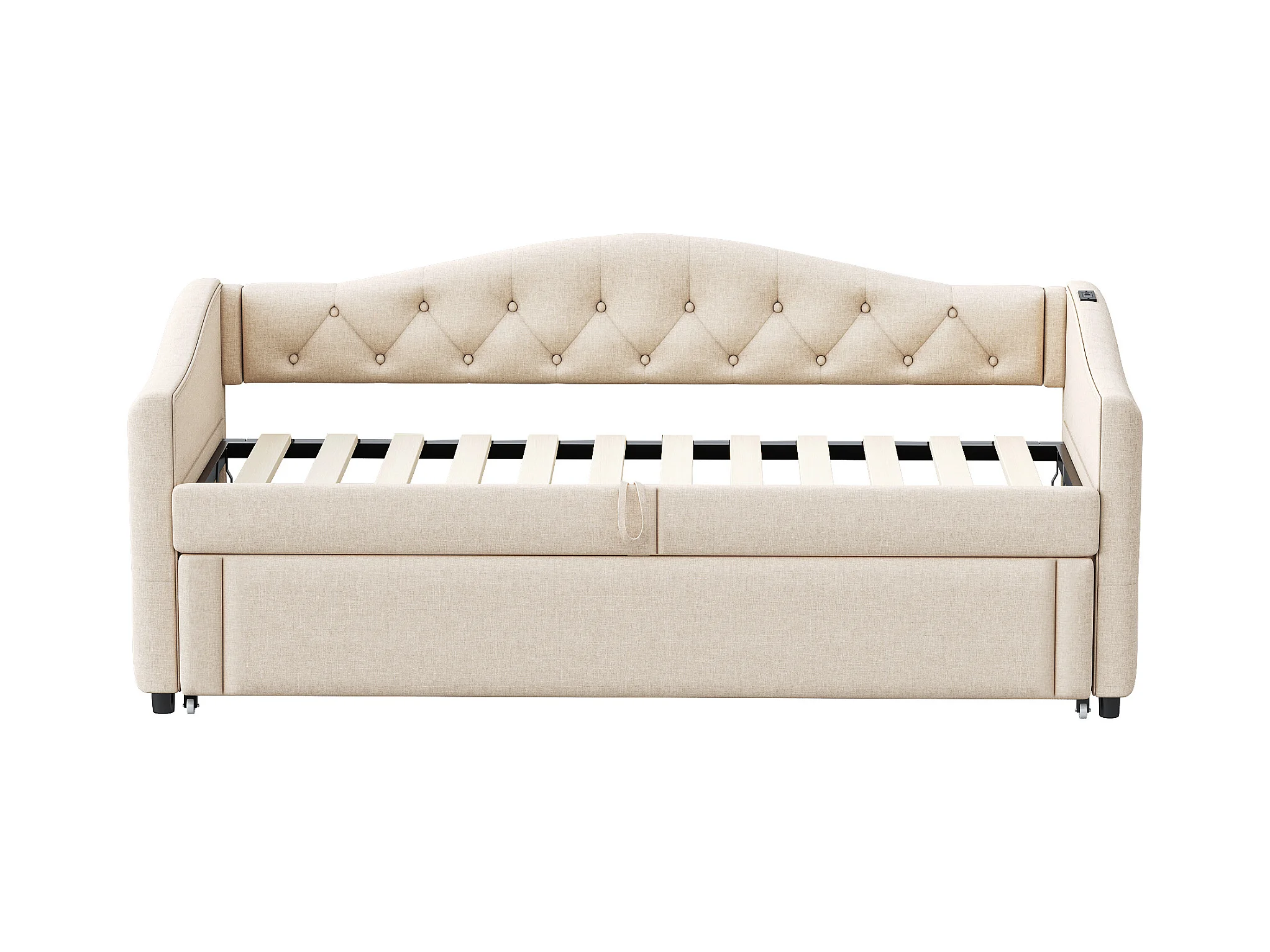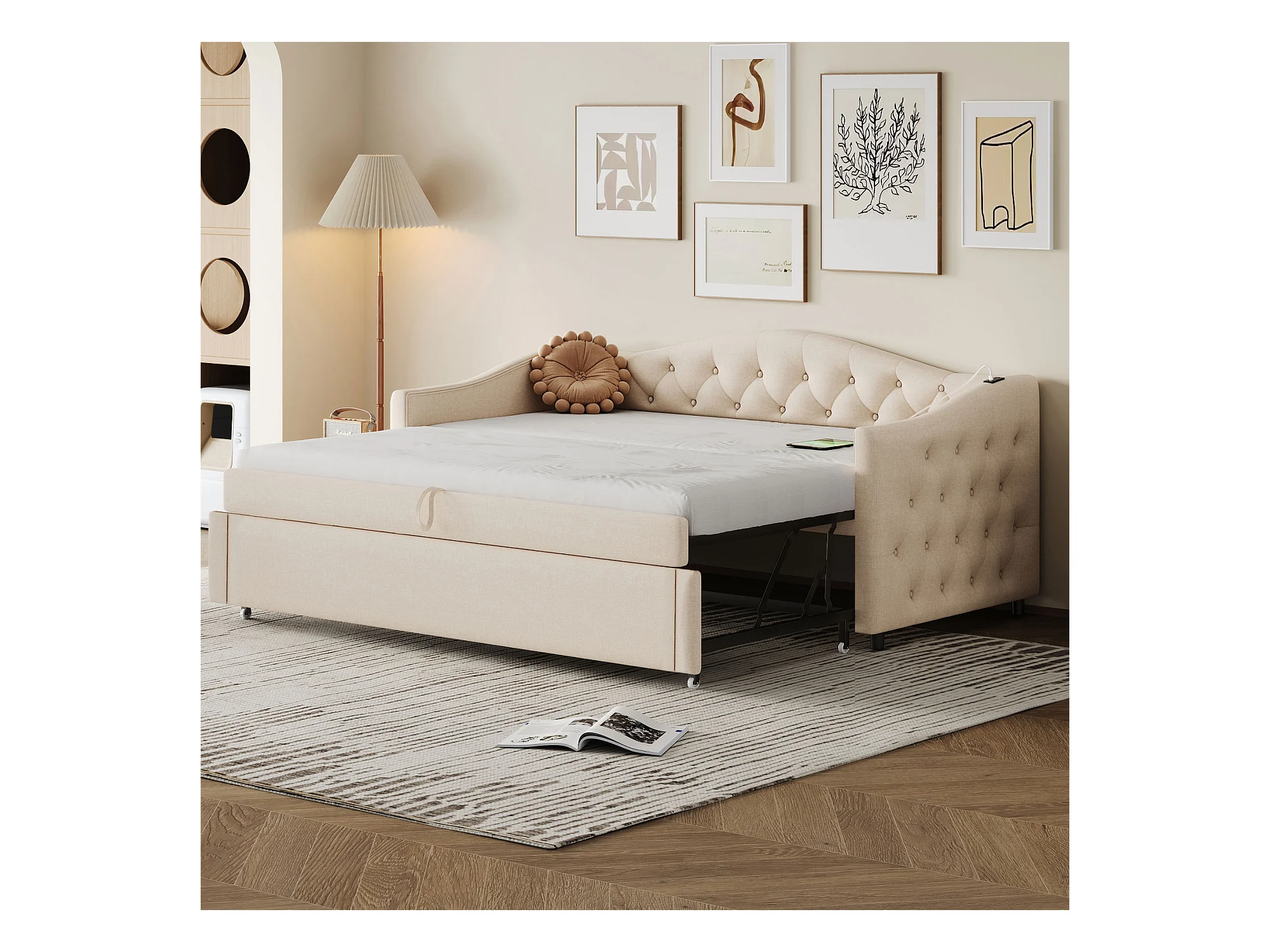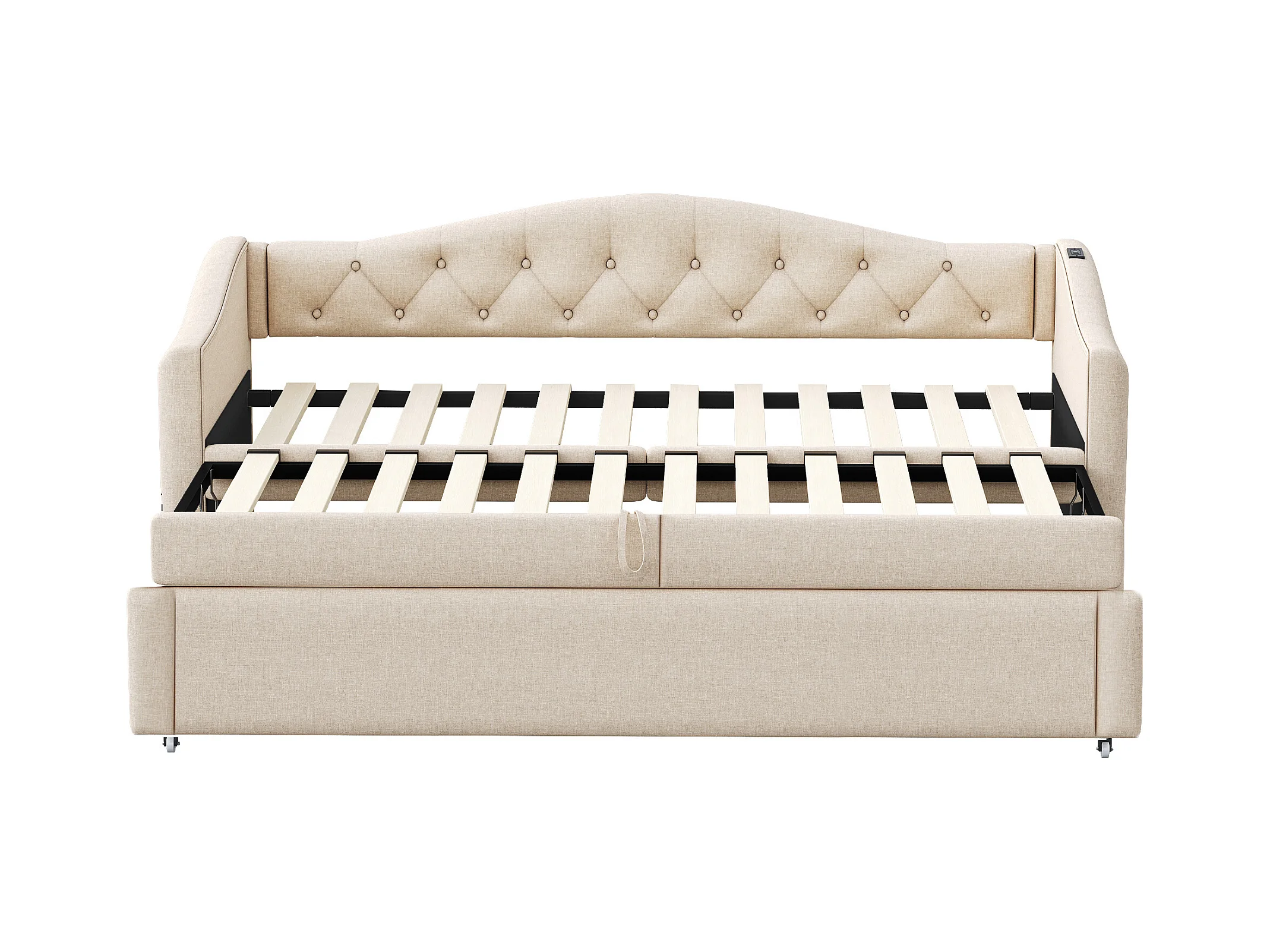 Lit gigogne 90x200cm & 90x190cm en lin - avec port USB et sommier à lattes - Beige
