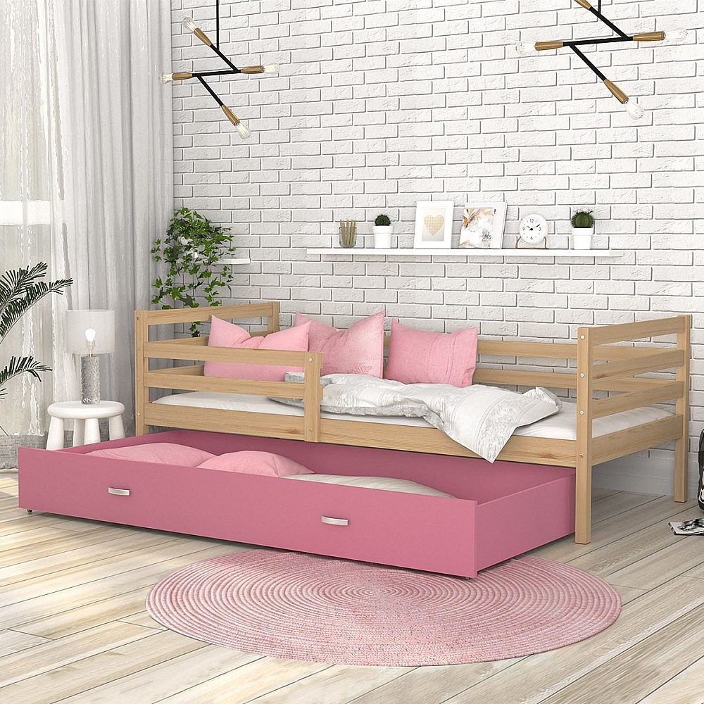 Lit Gigogne Milo 90x190 Pin - rose Livré avec sommiers, tiroir et matelas en mousse de 7cm